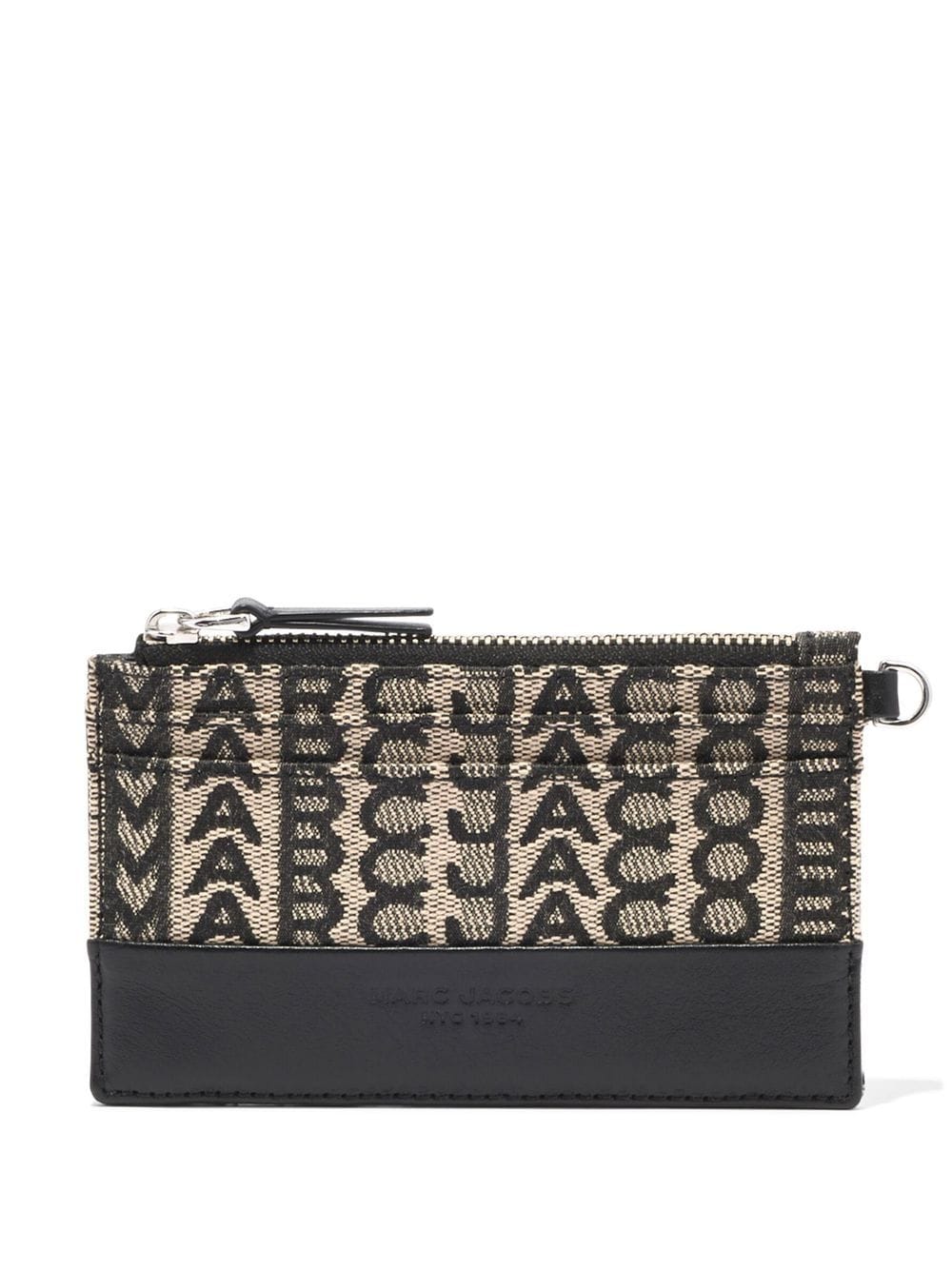 The Monogram wristlet wallet from Marc Jacobs featuring black/white, cotton blend, jacquard logo motif, debossed logo to the front, silver-tone hardware, top zip fastening, detachable wrist strap and card slots.