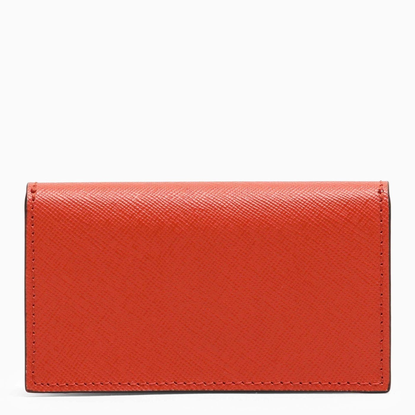 Business card holder by Marni in red, beige and blue saffiano leather, featuring a press stud fastening, a main compartment, a business card slot, a card slot and gold lettering on the front.