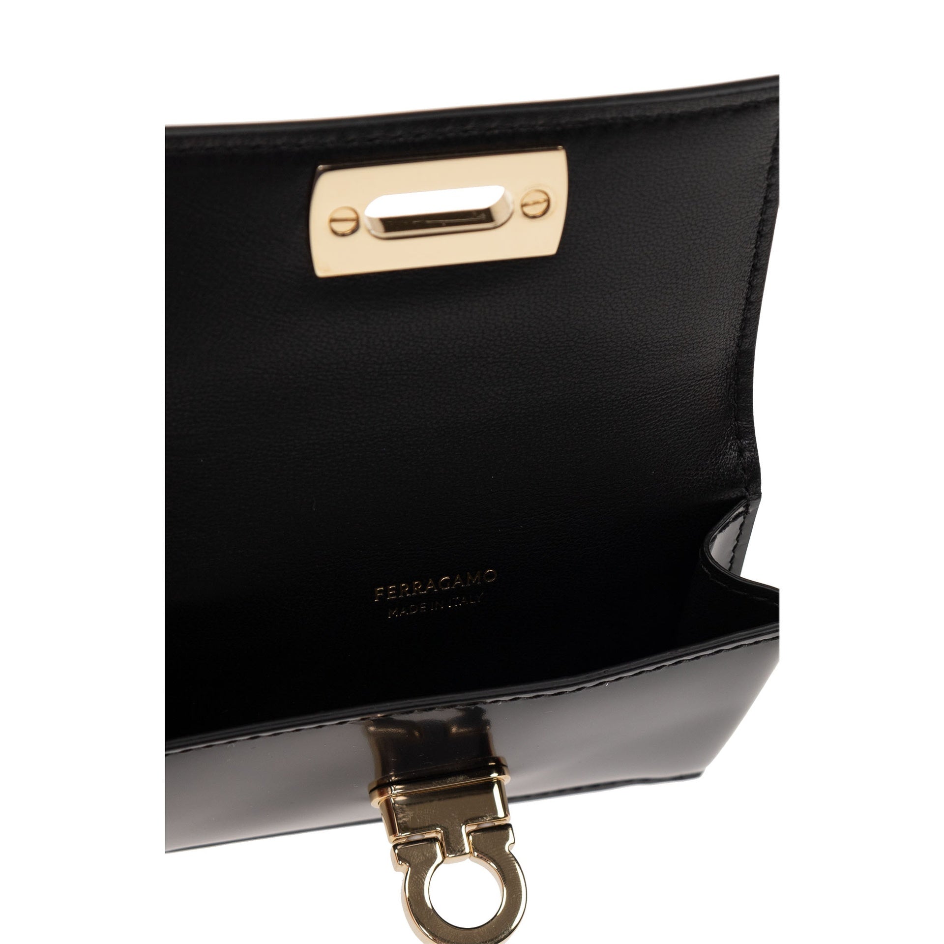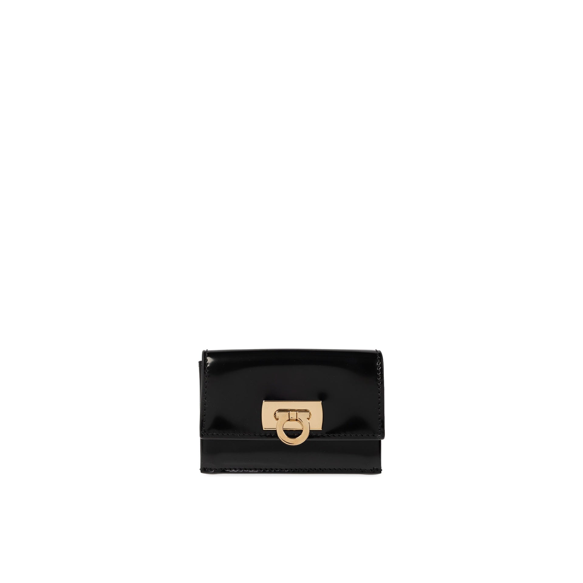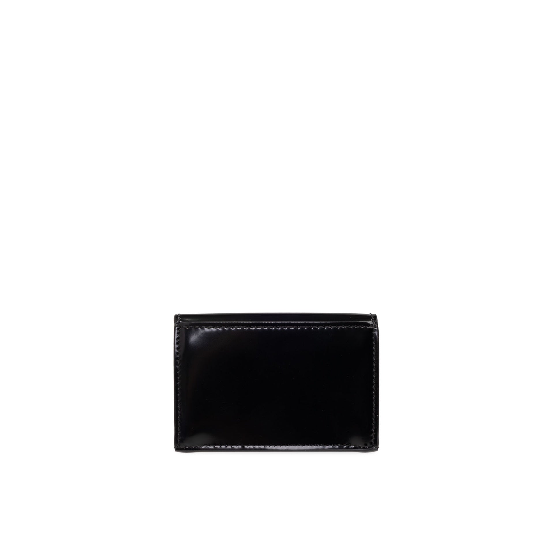 - Composition: 100% calf leather - Patent effect - height 7 cm - Flap closure - Width 2 cm - Length 10 cm - One back card slot - Logo-shaped fastener in gold-tone - Made in Italy -