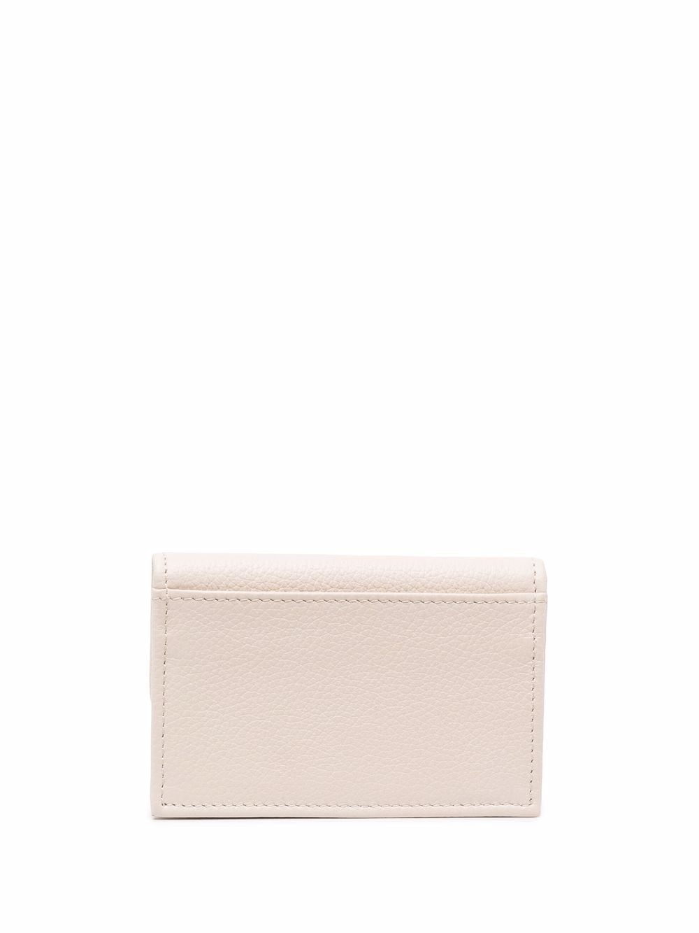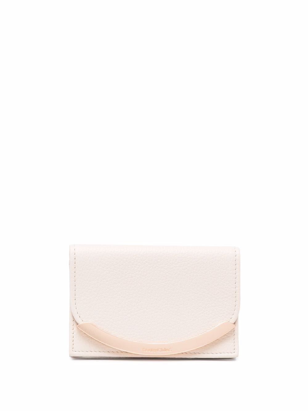 Cement beige calf leather/cotton mini Lizzie wallet from See by Chloé featuring pebbled texture, engraved logo, gold-tone hardware, foldover top with snap fastening and internal card slots.