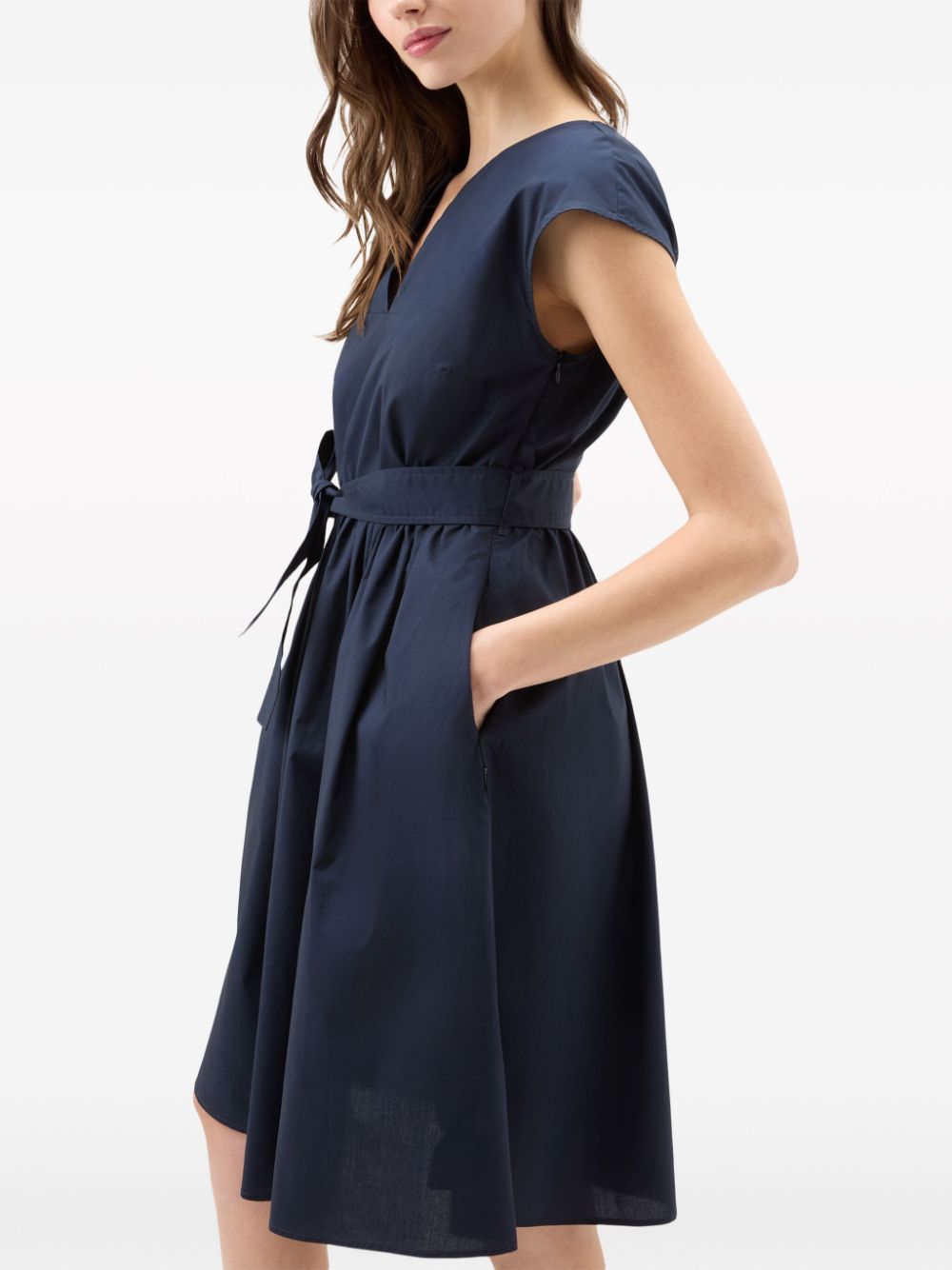 navy blue cotton poplin texture round split neck concealed side zip fastening cap sleeves belted waist two side slit pockets flared skirt straight hem knee-length