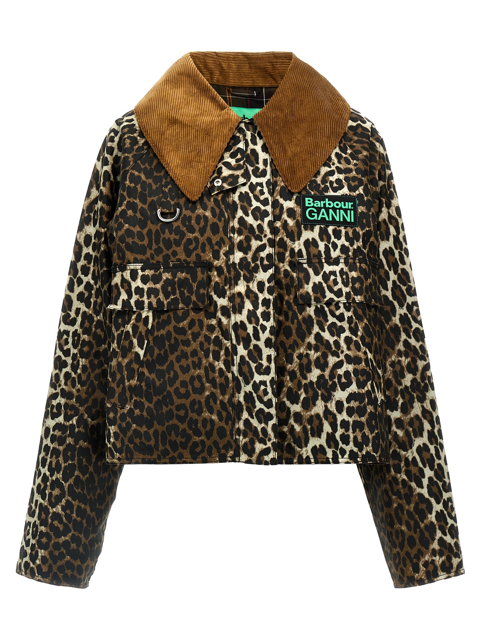 Barbour x GANNI 'Anorak Animalier' leopard print waxed cotton jacket, front logo patch, corduroy collar, zip and button closure, pockets, long sleeves with windproof gaiter. SUSTAINABLE: This product is made of organic cotton.