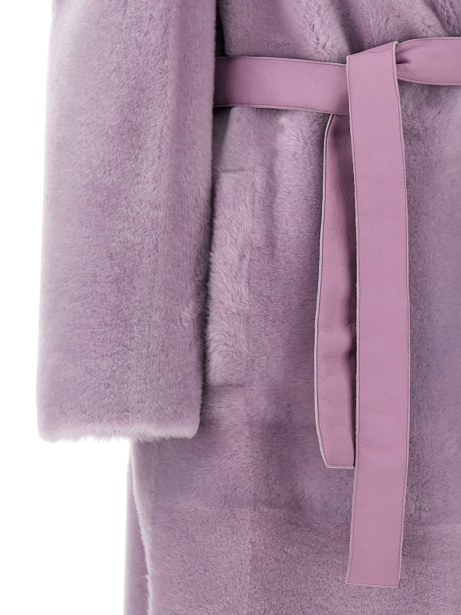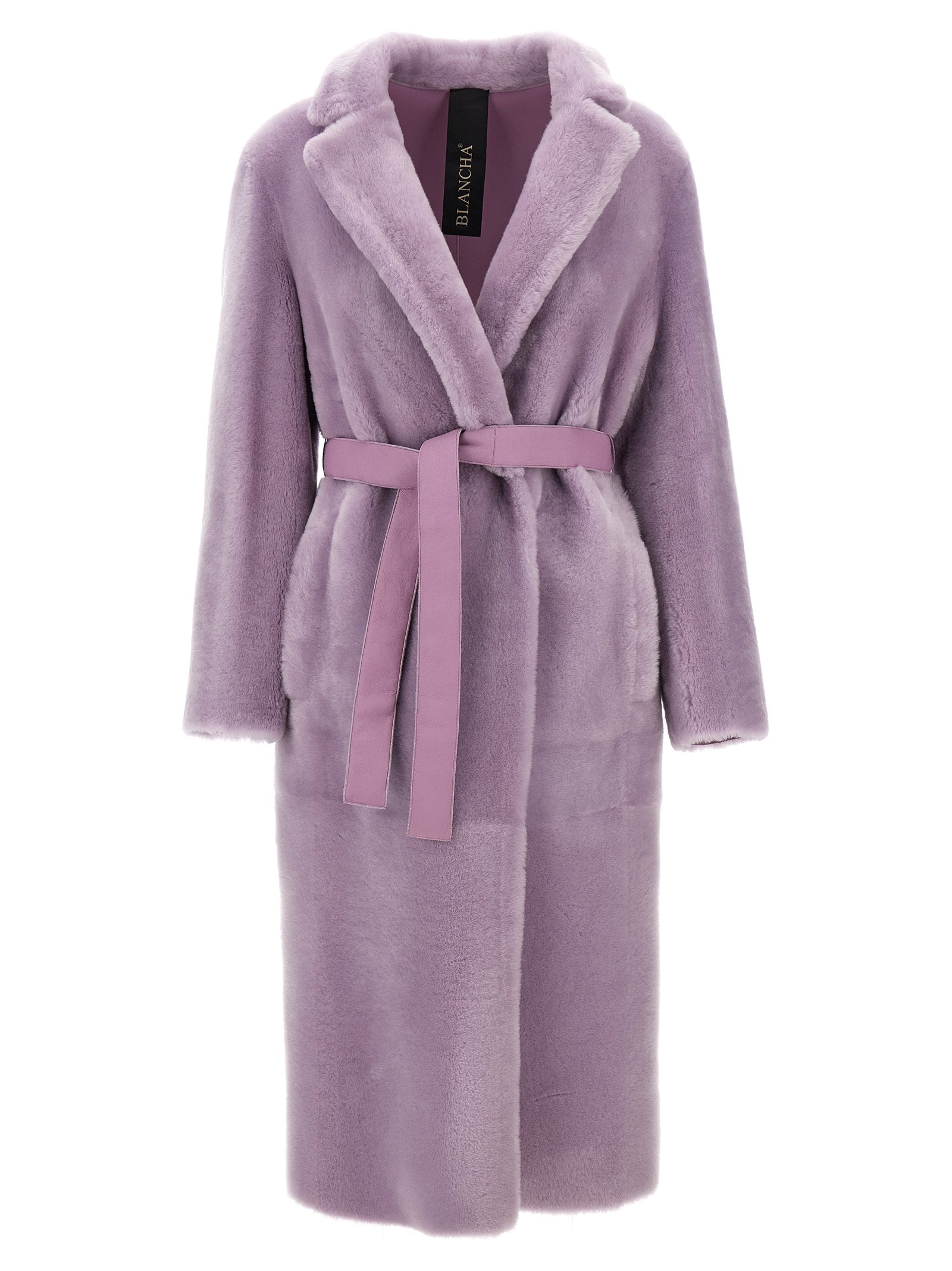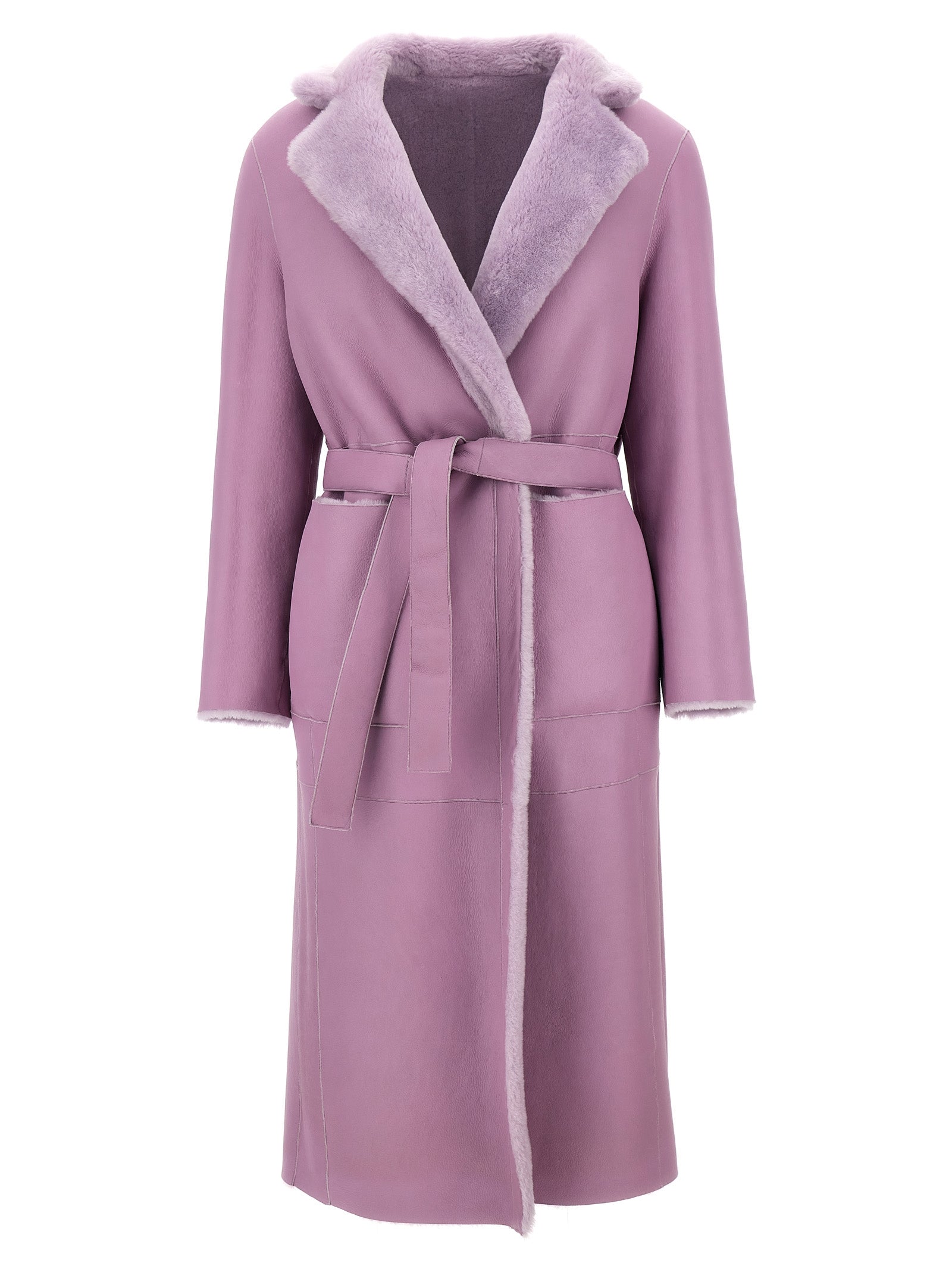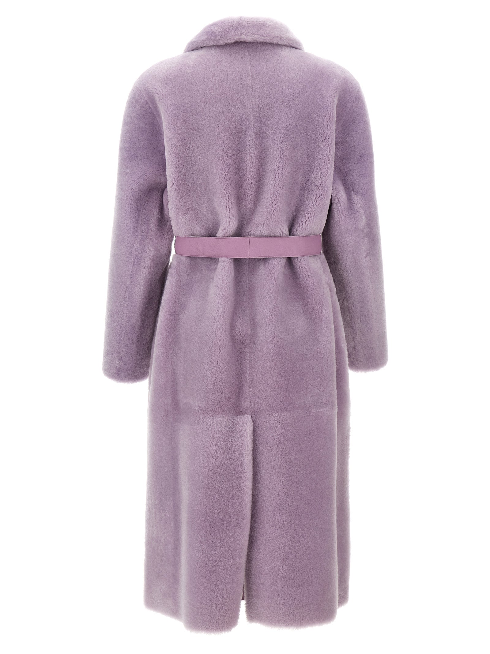 Lang pelsfrakke med bælte i taljen, dobbeltbrystet knaplukning, lommer, lange ærmer, rygdel.