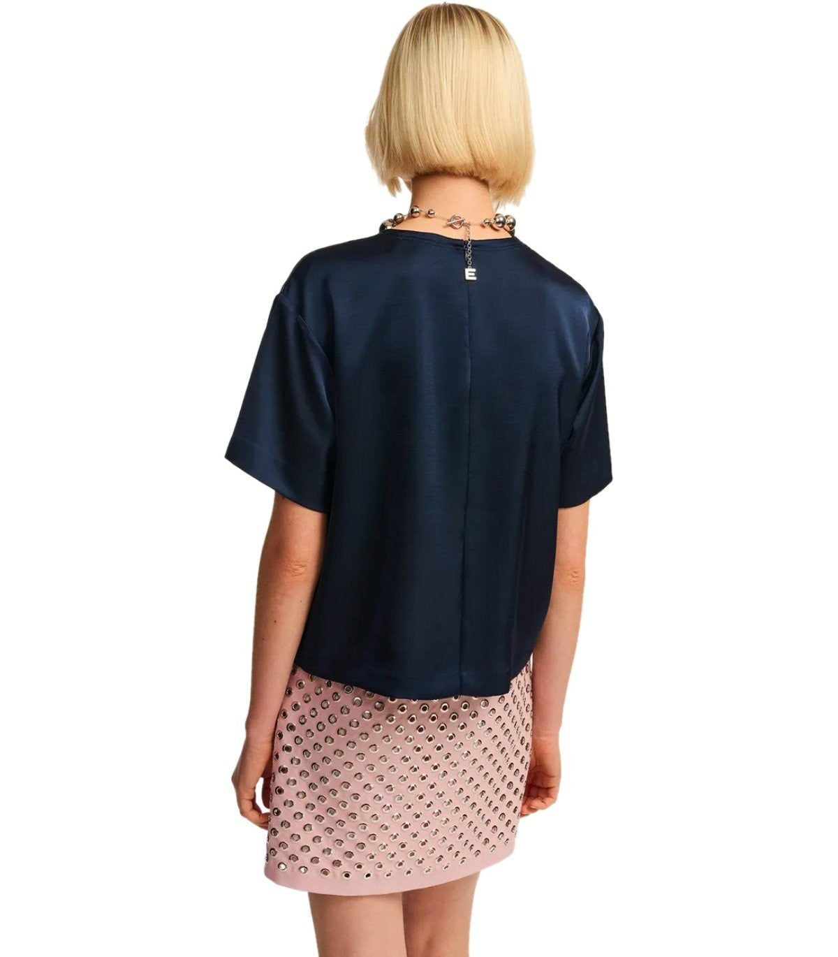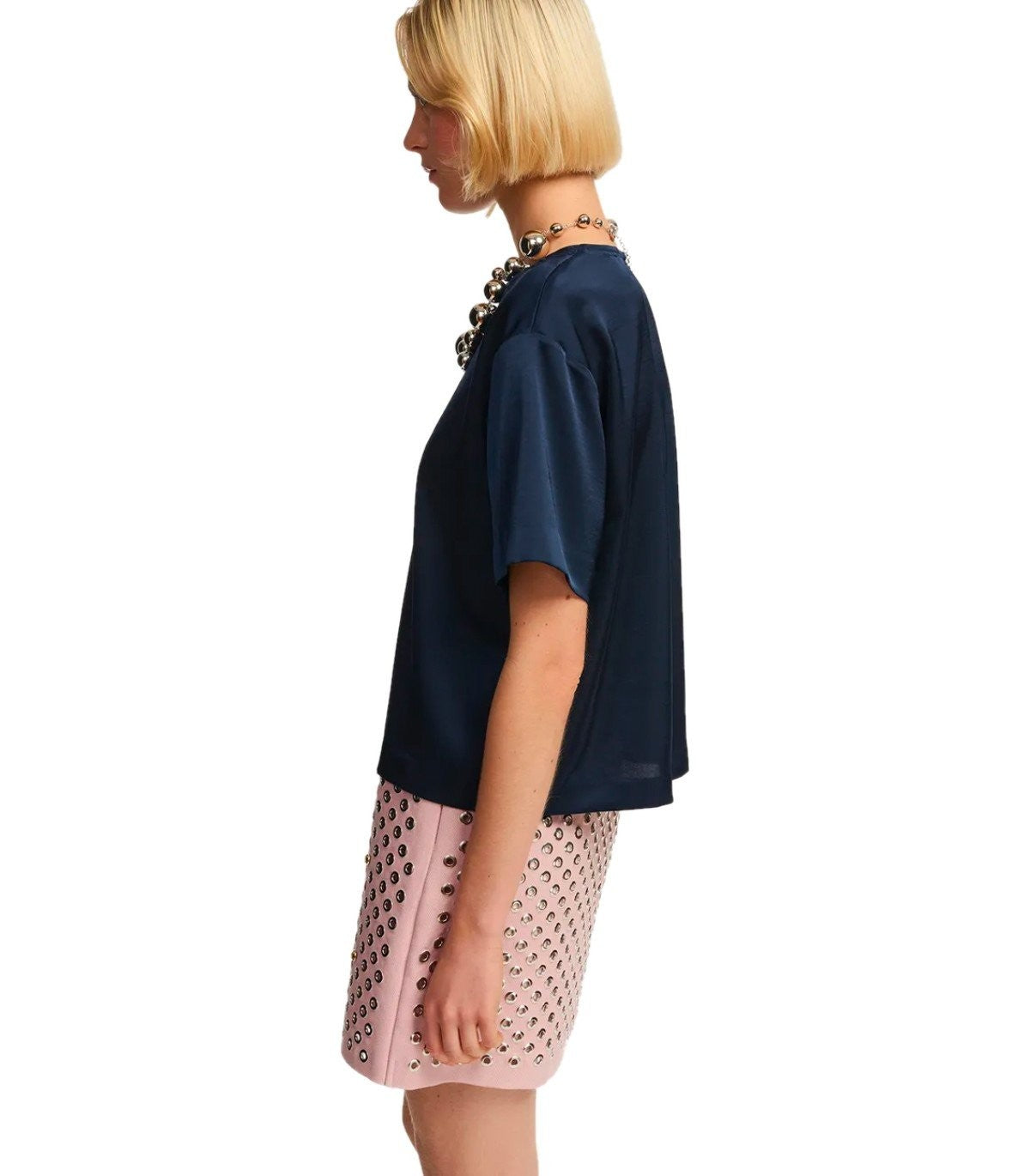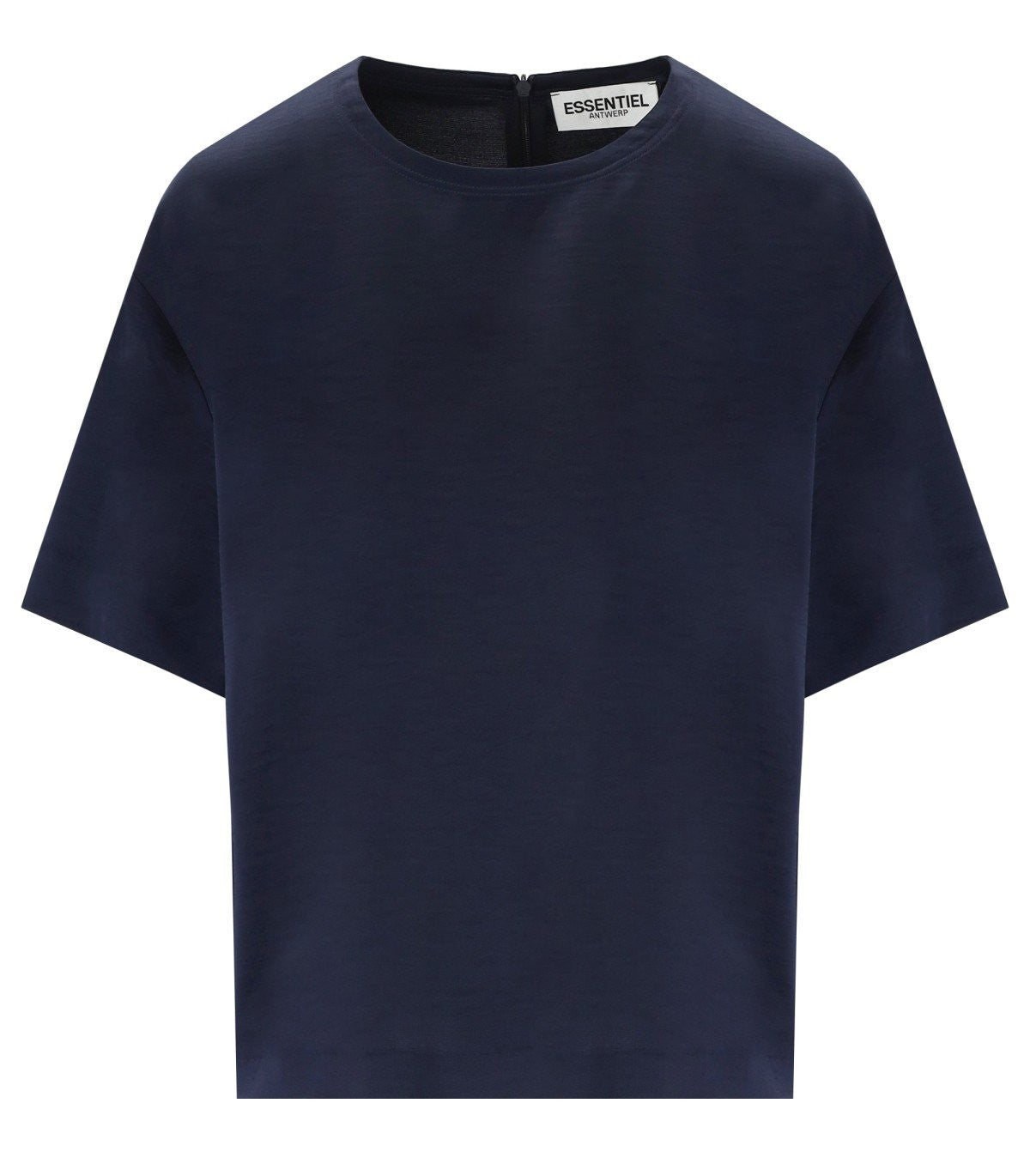Essentiel Antwerpen top lavet af marineblå genanvendt polyester blandet stof, satineffekt. Zip lukning bagpå, overdimensioneret pasform. Sammensætning: 51% genanvendt polyester, 49% polyester.
