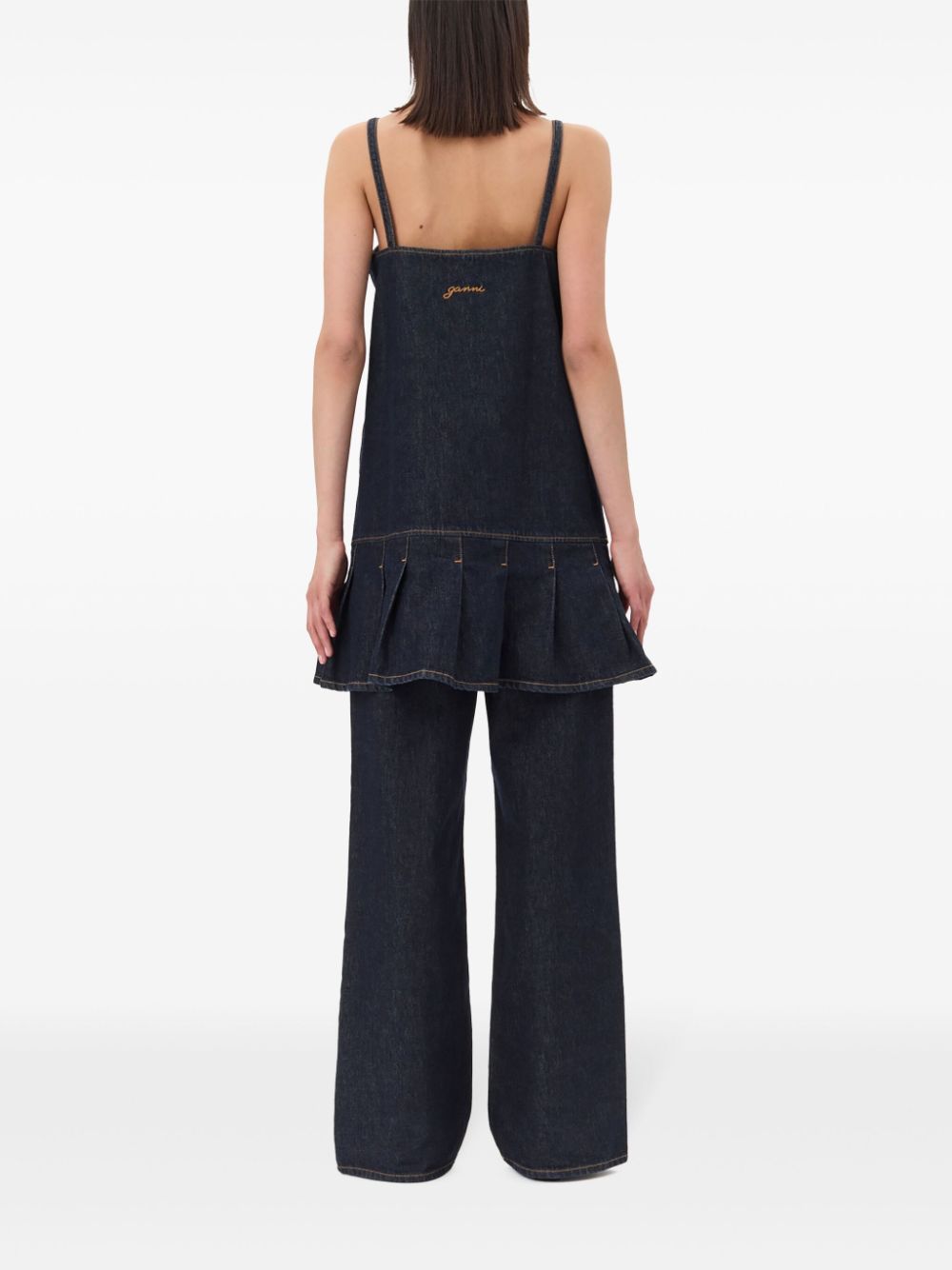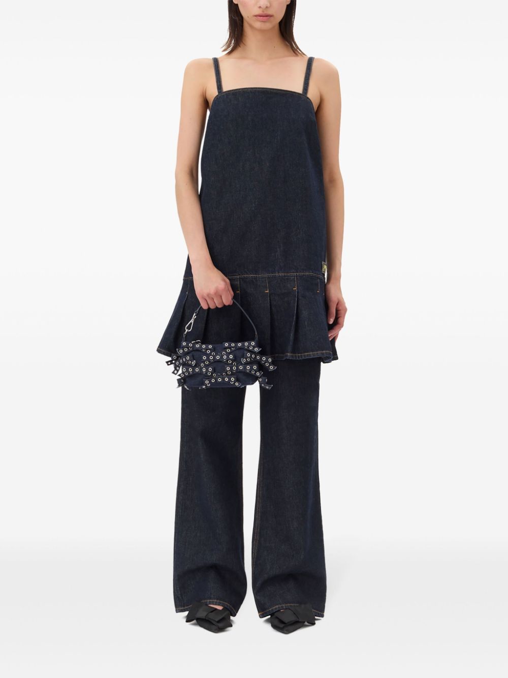 indigo blue organic cotton denim slip-on style thin shoulder straps sleeveless square neck contrast stitching embroidered logo to the rear pleated skirt straight hem thigh-length This item is made from at least 50% organic materials. Learn more about what makes a product Conscious on our Conscious Criteria page