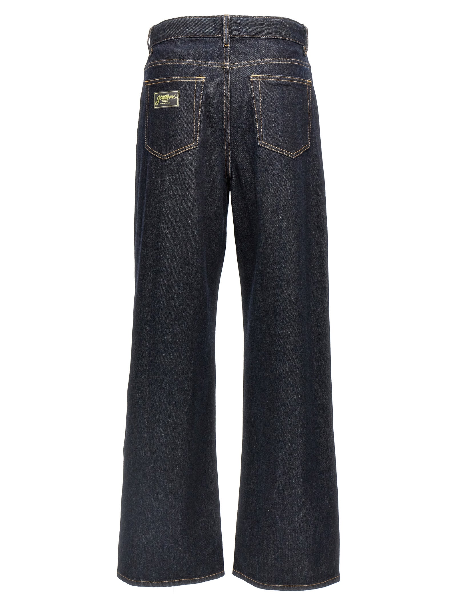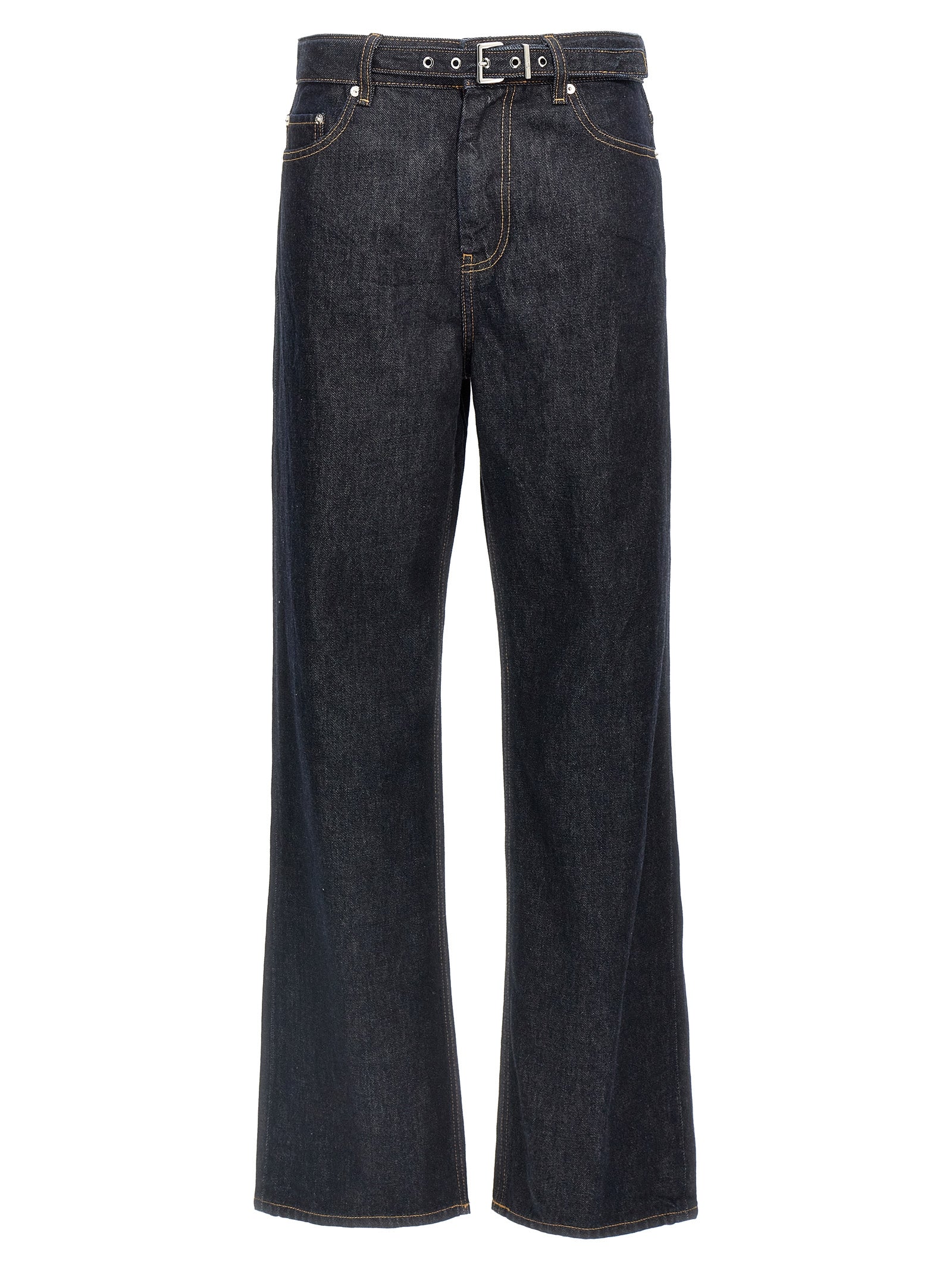 'Izey' bomulds denim jeans med lynlås og lukning af knap, justerbart integreret bælte, lommer, bredt og lige ben, ryg logo patch.