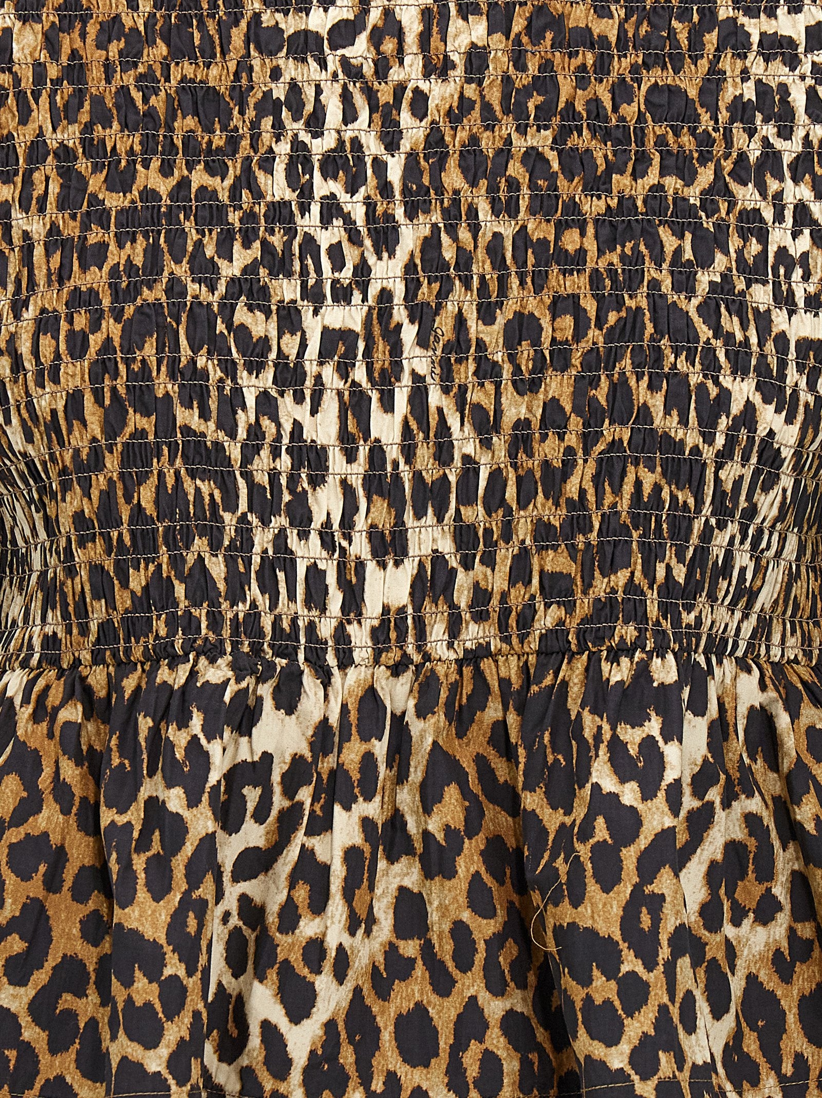 Smock Leopard Print Cotton Bluse med rund halsudskæring, bare ryg og korte ærmer. Bæredygtigt: Dette produkt er lavet af organisk bomuld.