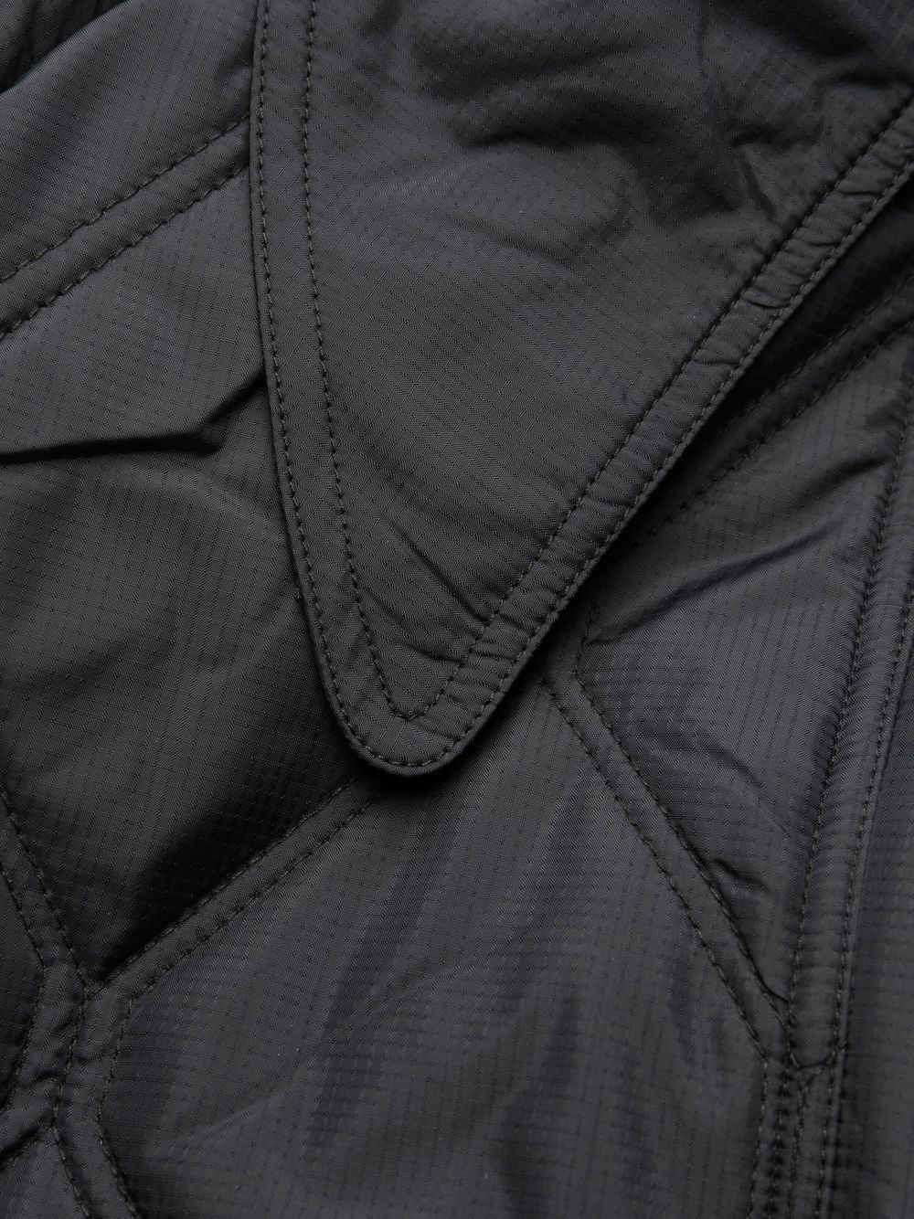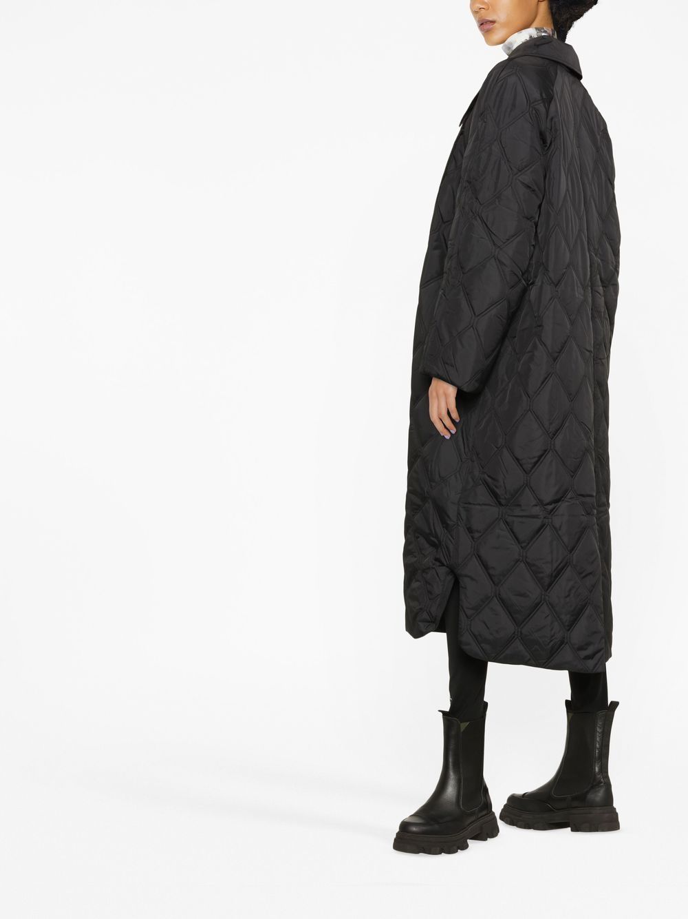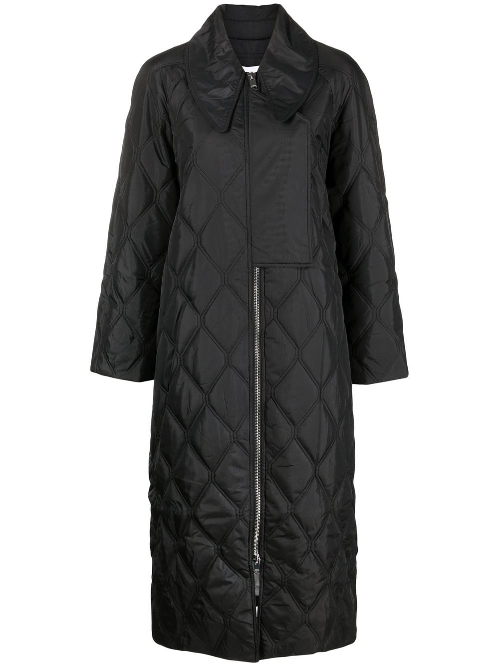 Quilted Ripstop Coat fra Ganni med sort, genanvendt polyester, diamant quiltning, overdimensioneret spids krave, lange raglan-ærmer, forreste to-vejs zip-fastgørelse, to sidespalte lommer, boks-pleat-detaljer og sidespalter. Bevidst: Denne vare er lavet af mindst 50% genanvendte eller upcyclede materialer. Til genanvendte syntetiske tøjprodukter anbefaler vi stærkt at bruge en mikrofiber-fangstvaskpose for at sikre, at der ikke frigives mikroplast, der kan forurene vand, i processen ..