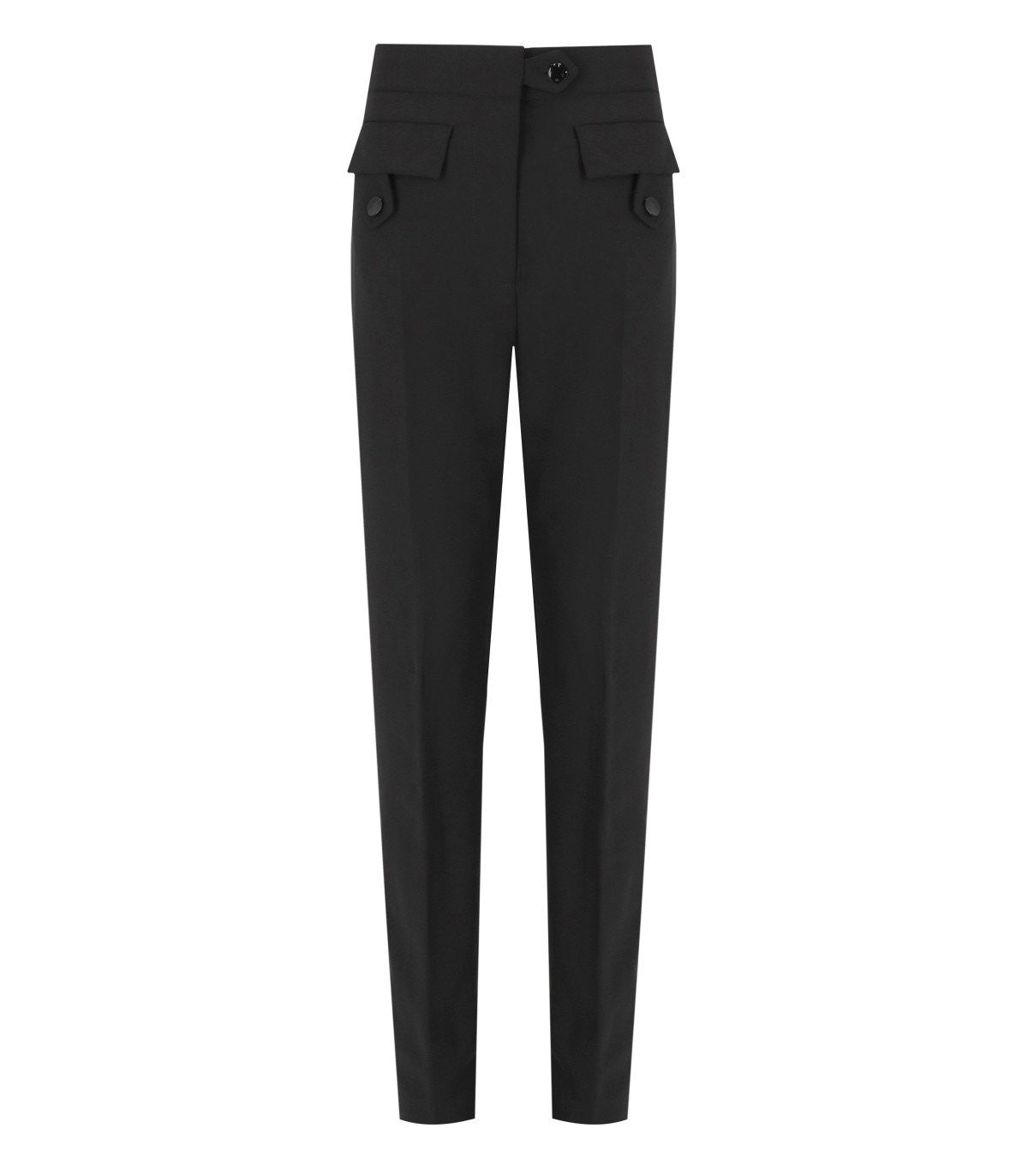 Ganni trousers made of twill fabric, in black. Characterized by a zip and button closure, it features front pockets and back pockets. Fitted fit. The model is wearing a size S and is 176 cm tall. Composition: 55% recycled polyester, 45% polyester.