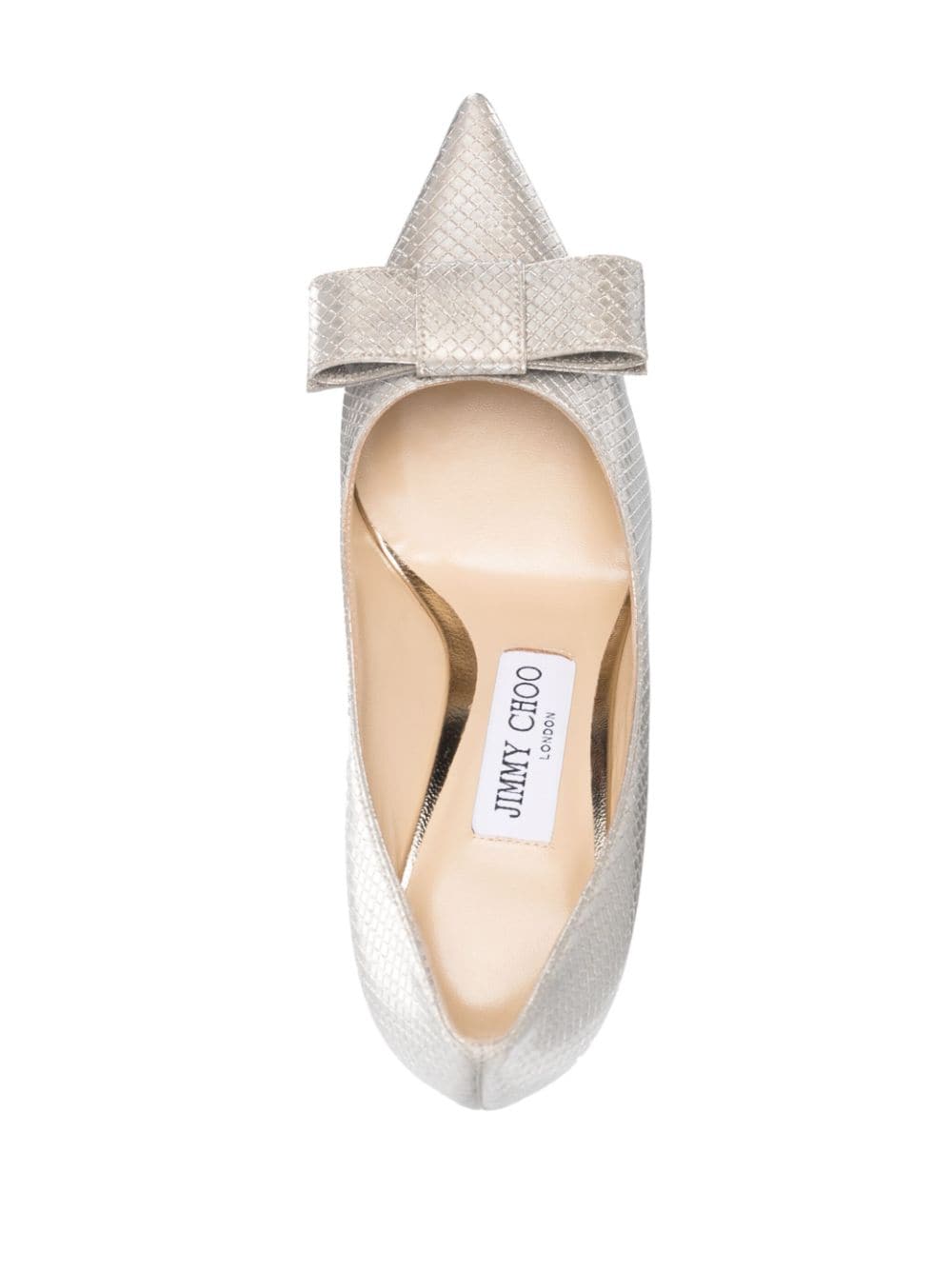 Kærlighed 85 mm bue-detaljer pumper fra Jimmy Choo med fløde hvidt, kalv læder, firbenhudeffekt, bue detaljer, pegetå, slip-on stil, branded læderinsål og høj stiletto hæl.