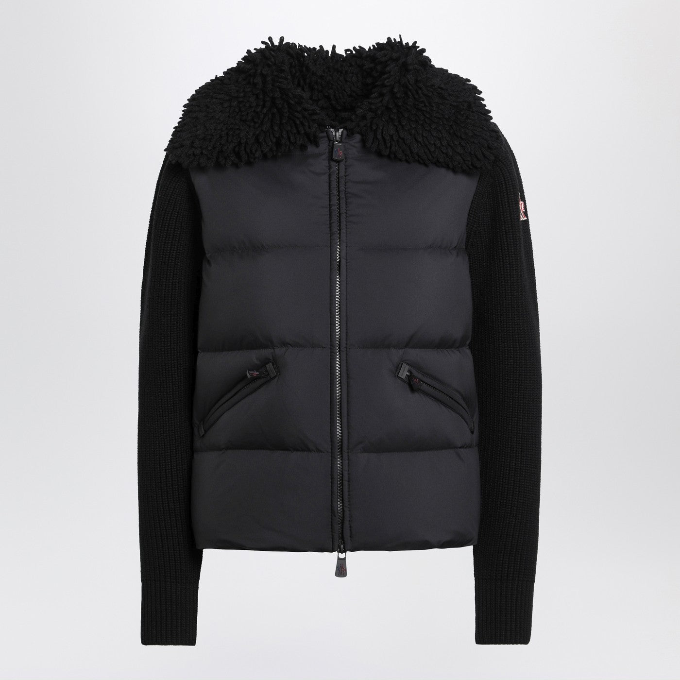 Moncler Grenoble sort cardigan, med lange uldærmer (et med logomærke), polstret frontpanel, dobbelt lynlåslukning, to lynlåslommer foran, ribkanter, bred krave og normal pasform.