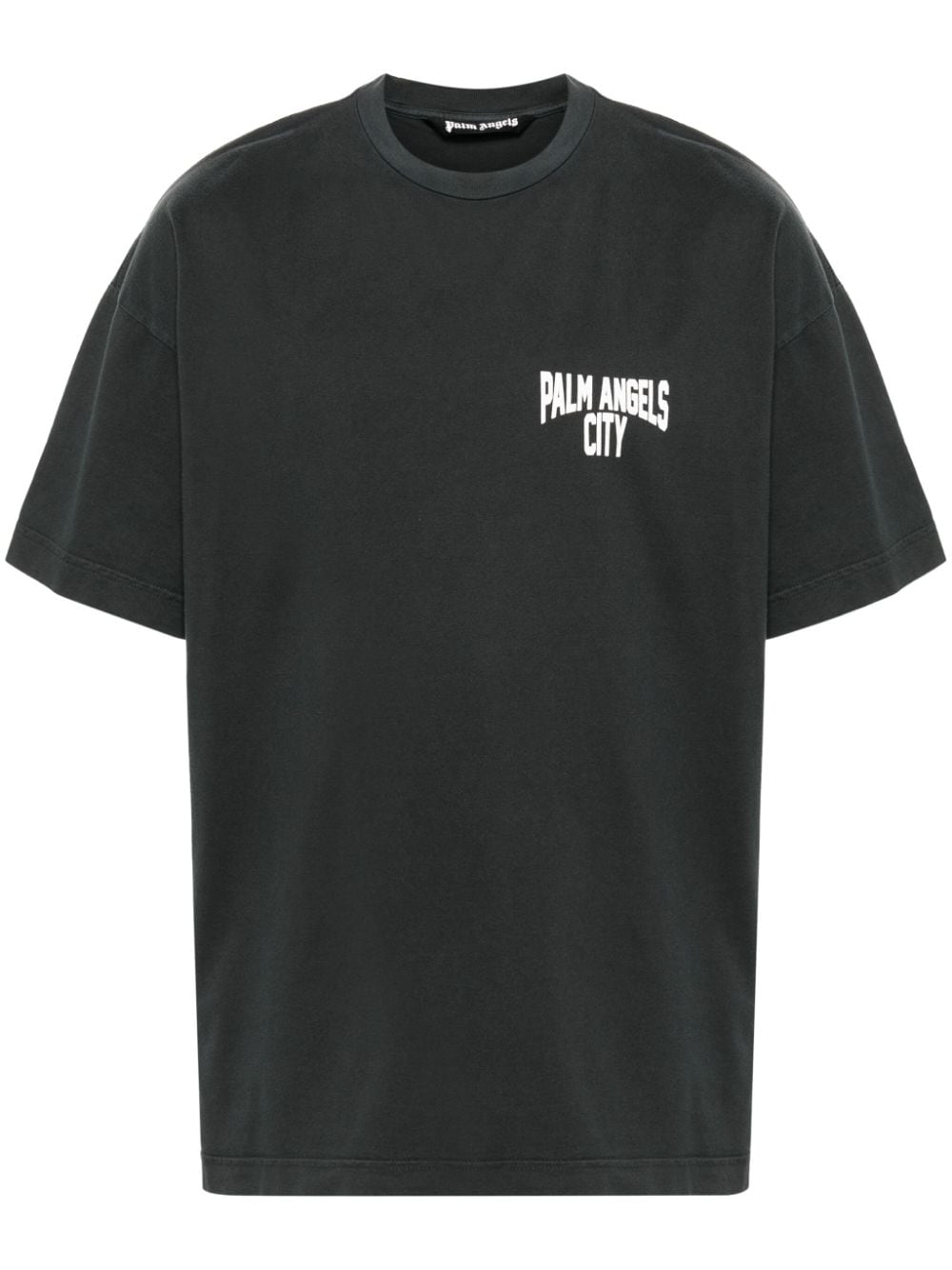 mørkegrå bomuldstrøje tekstur ribbed besætning hals dråbe skulder kort ærmer logo udskriv ved brystet lige hem