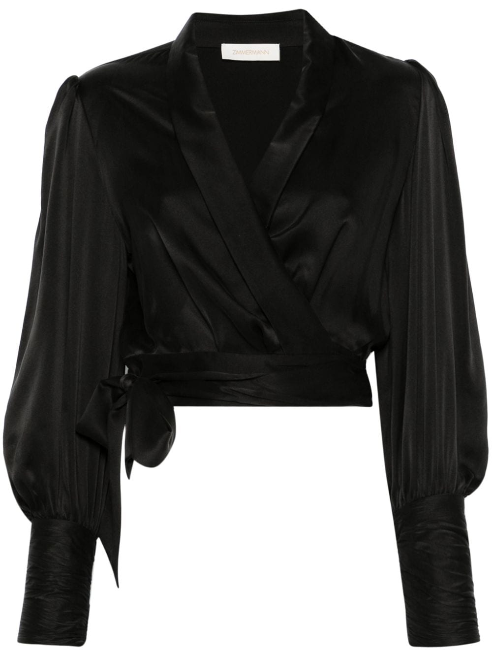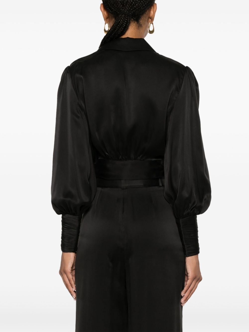 sort silke satin finish wrap design bundet talje kaster v-hals sjal krave lange biskop ærmer manchet lynlås lige hem beskåret