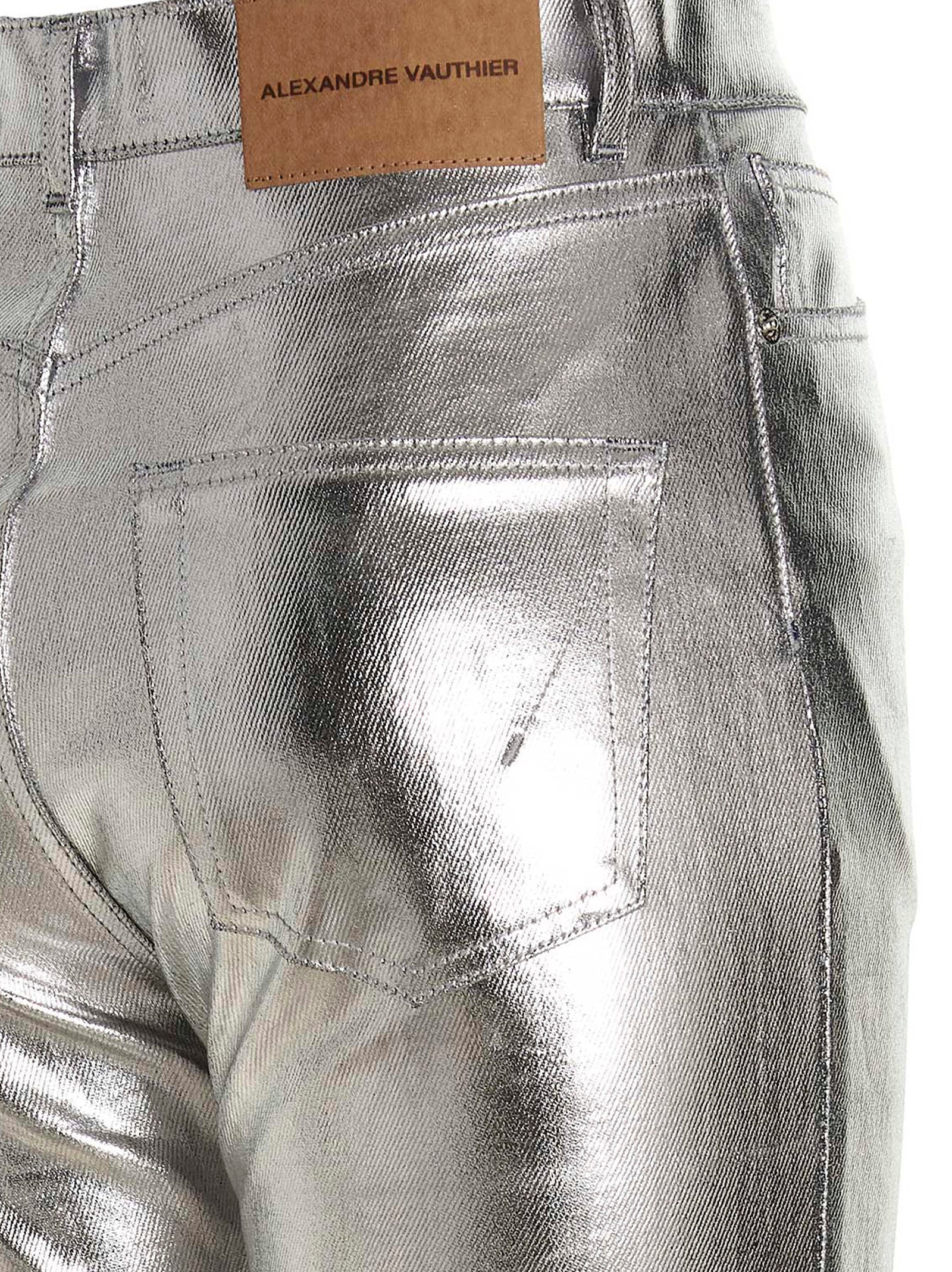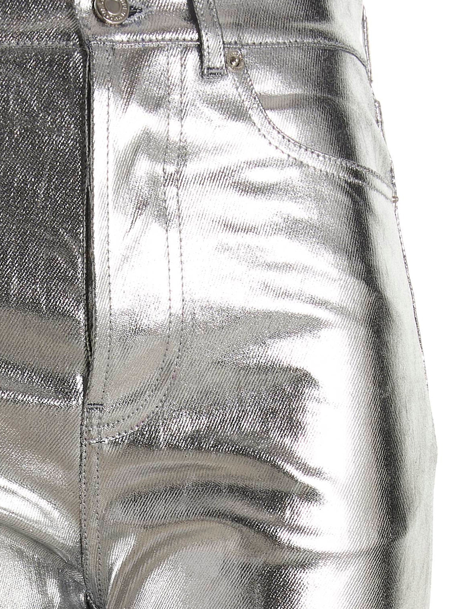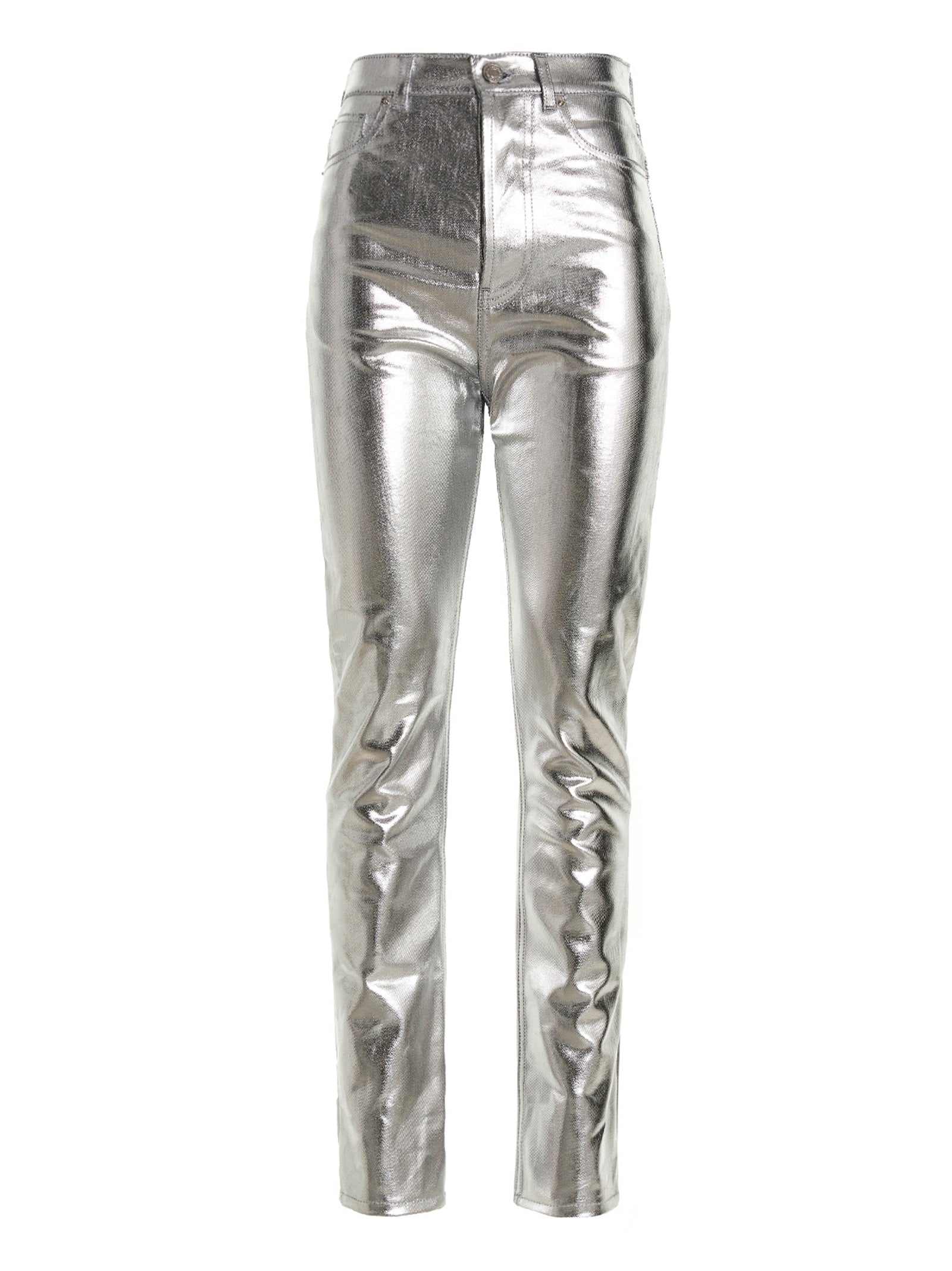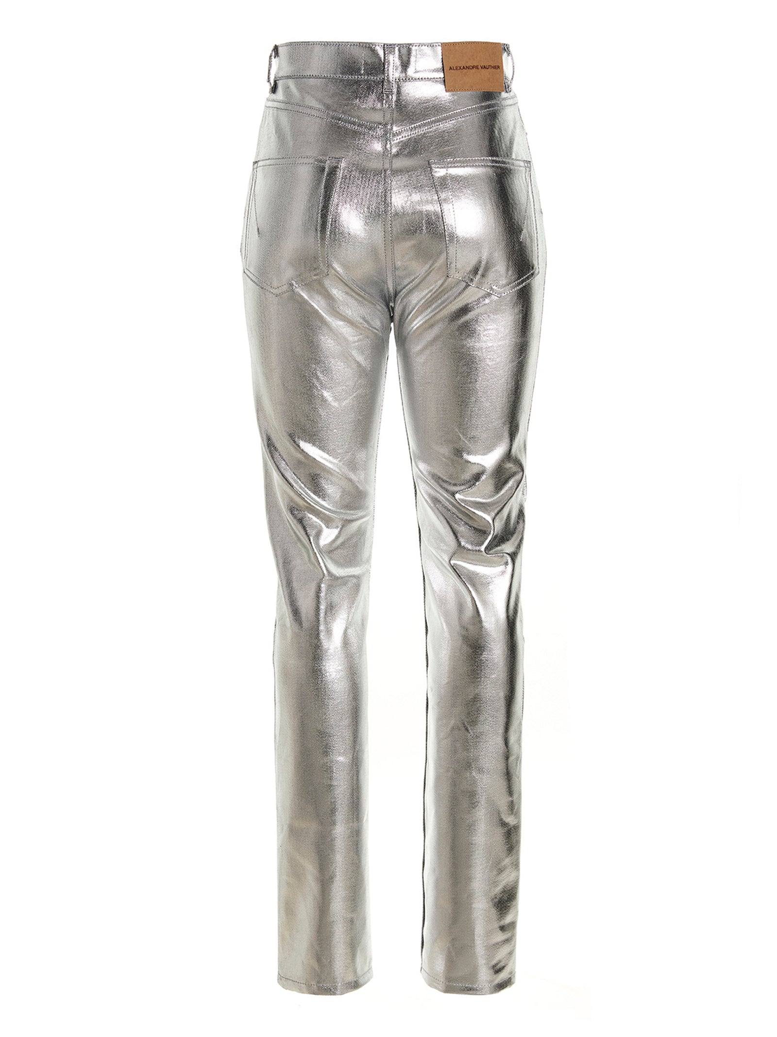 Silberbeschichtete Jeans mit hoher Taille und Reißverschluss und Knopfbefestigung.