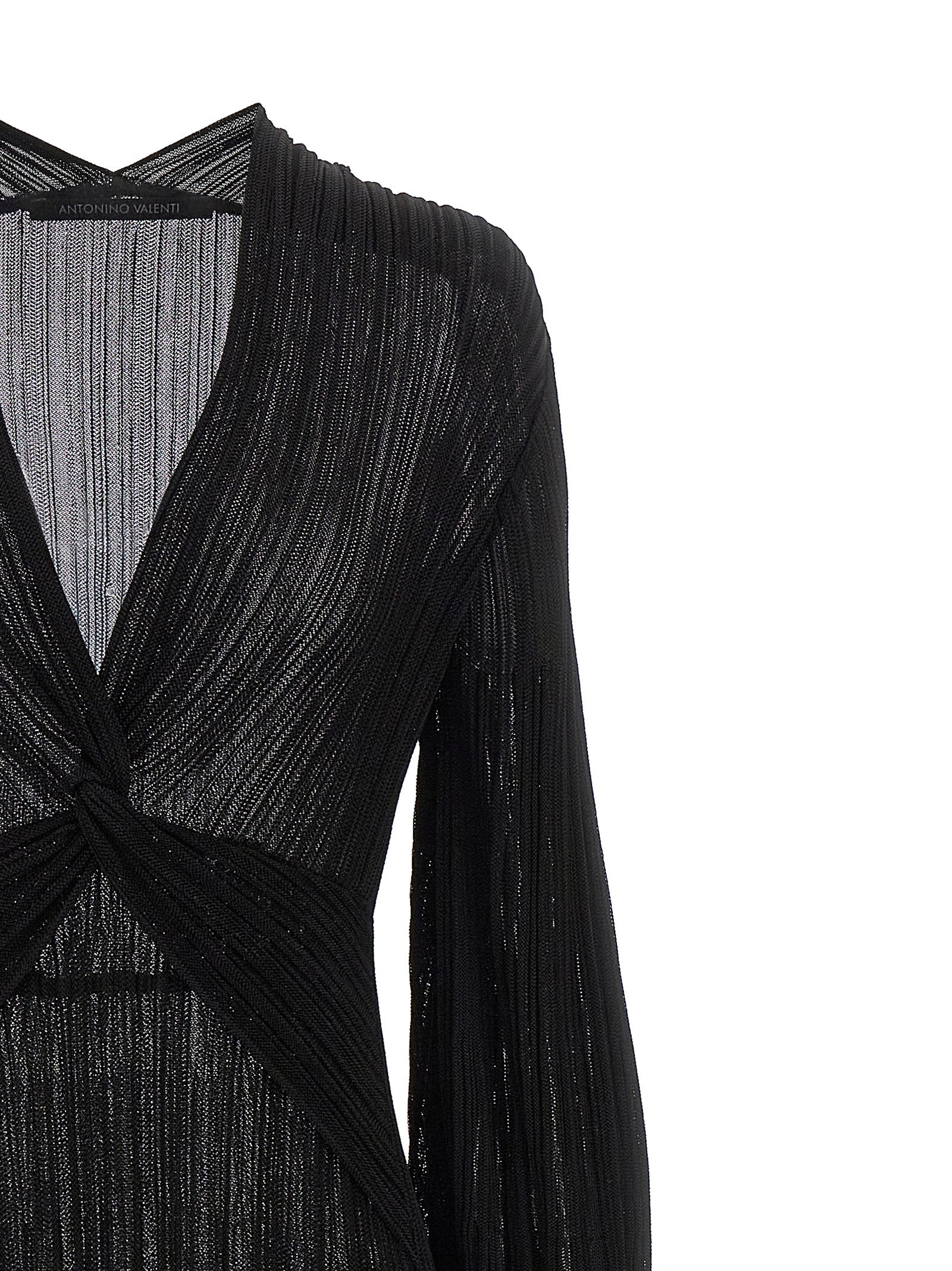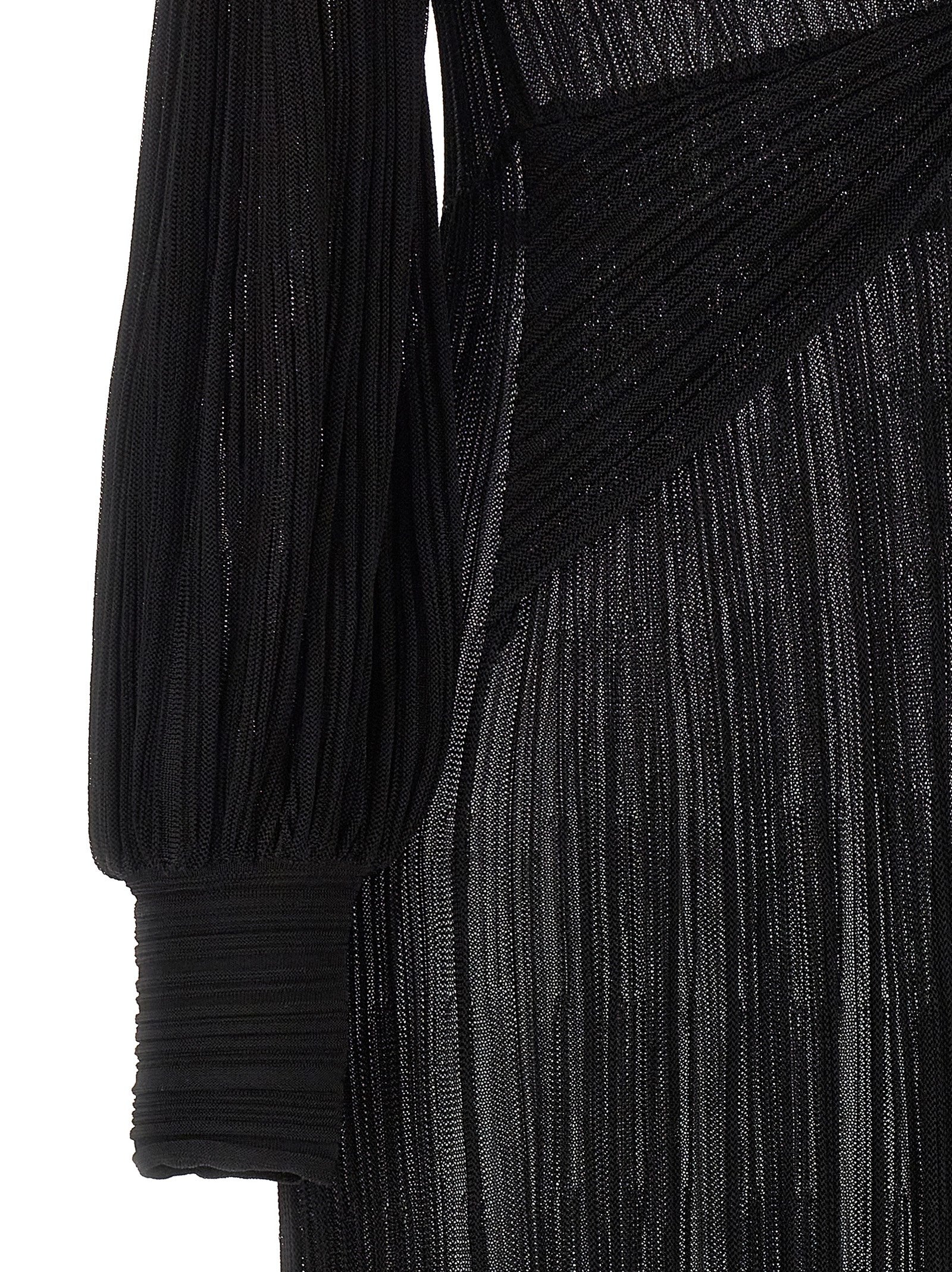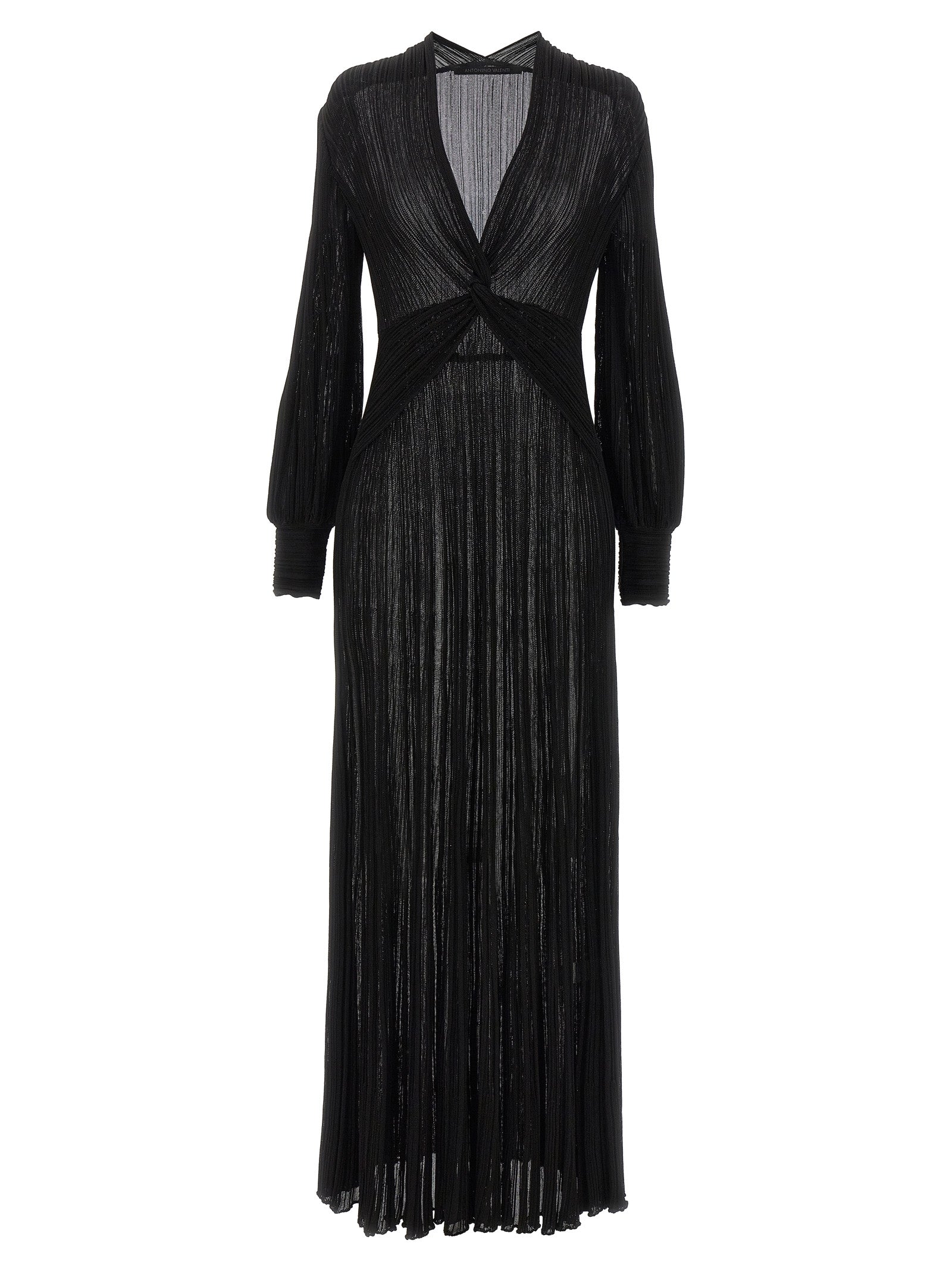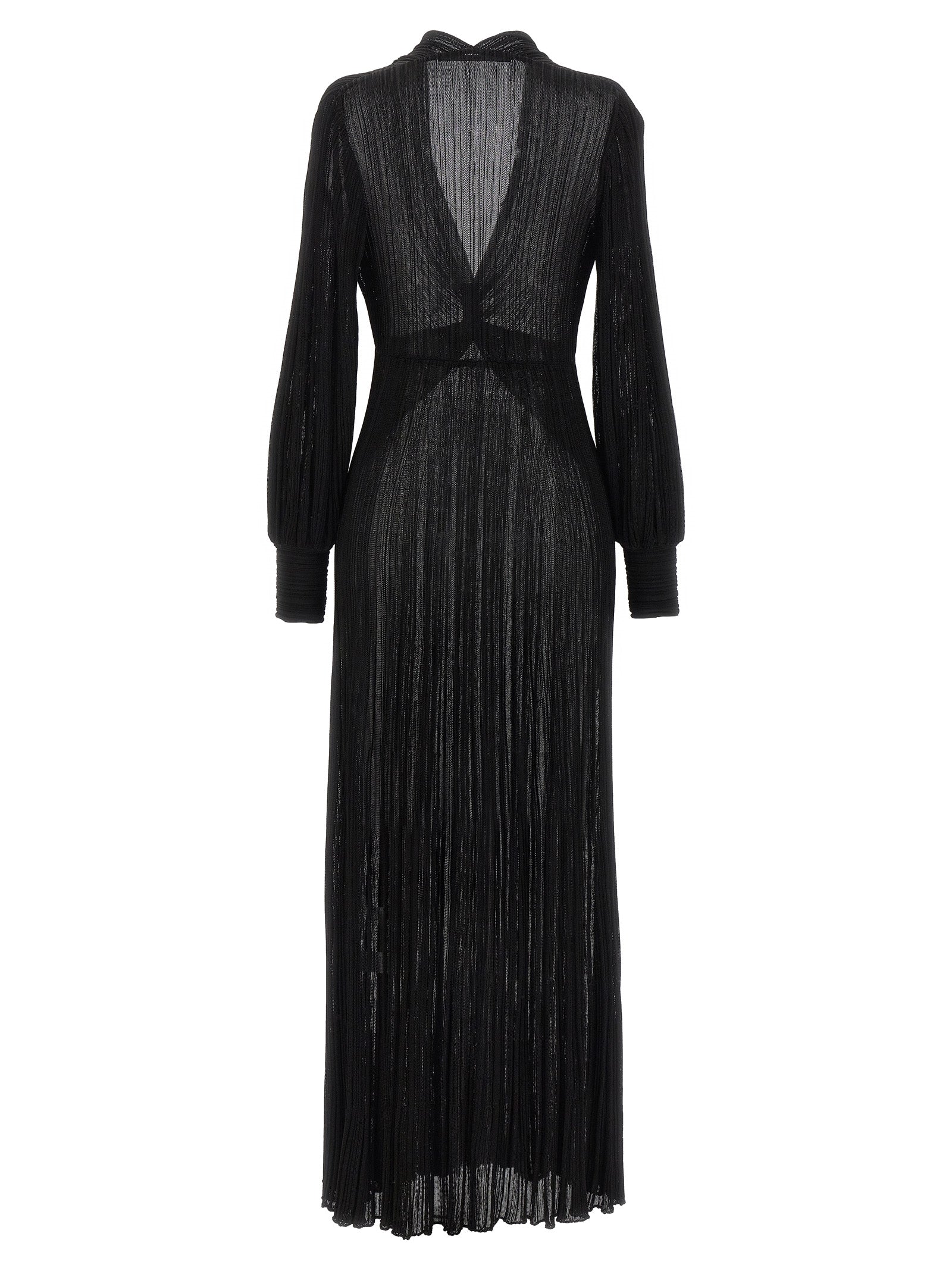 'Noemi' Plisse Viscose Midi-Kleid mit langen Ärmeln und einem tiefen V-Ausschnitt.