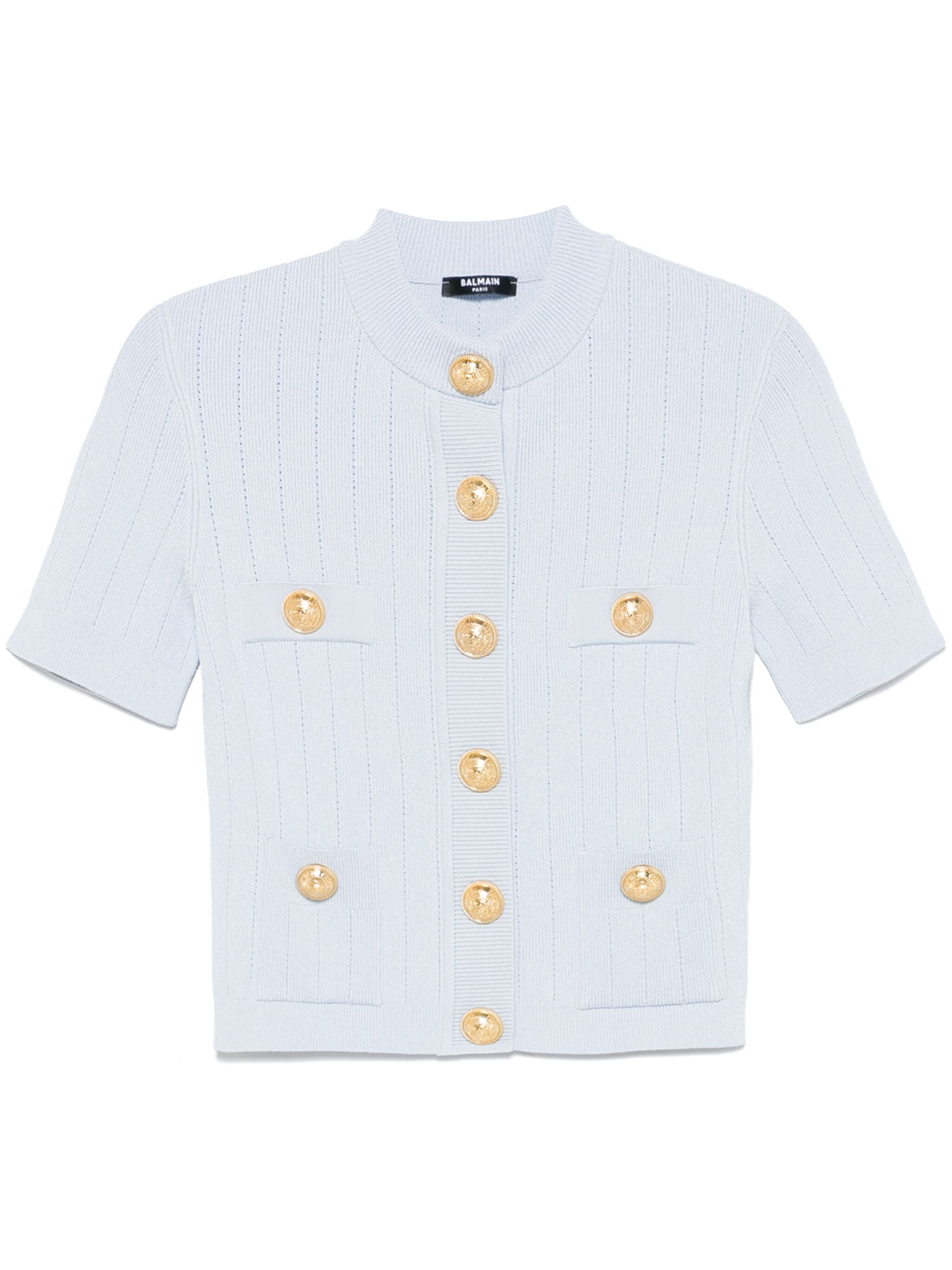 Cardigan lavorato a maglia a coste fini, con una vestibilità aderente e scollo a V. Le spalle strutturate e le maniche corte aggiungono un tocco moderno, mentre la chiusura frontale con 4 bottoni in metallo dorato "Signature Coin" e le tasche finte completano il design elegante e sofisticato.