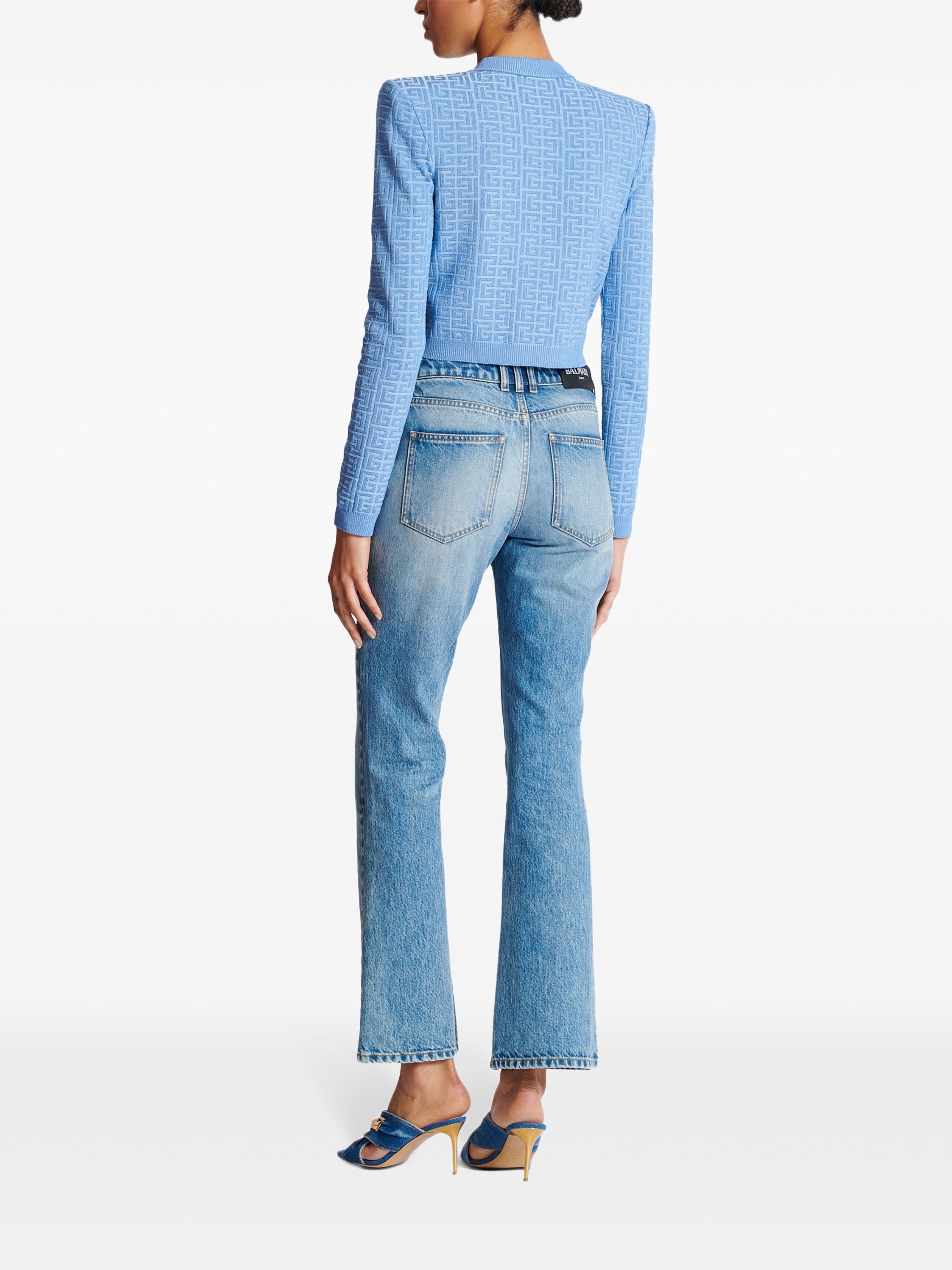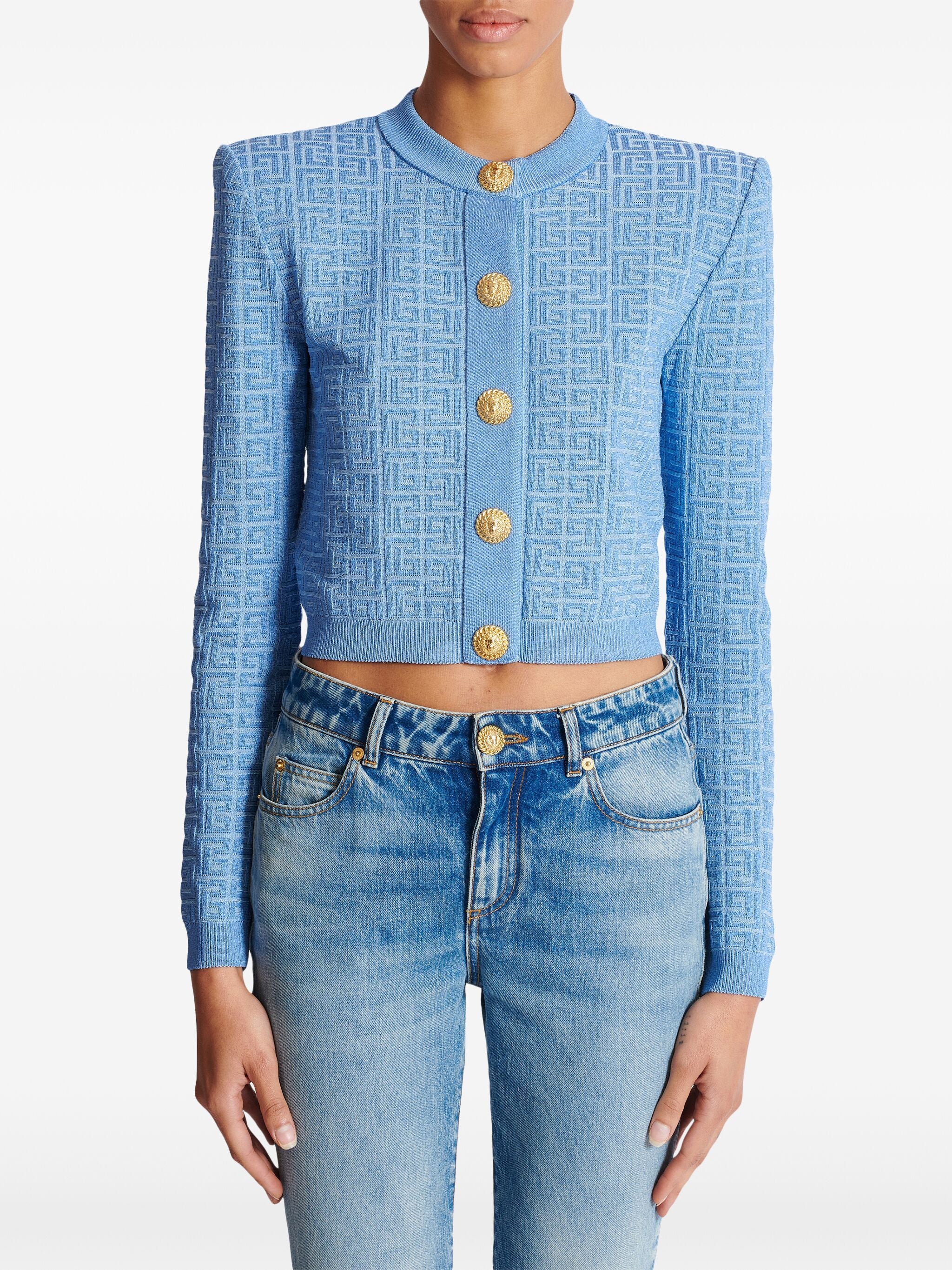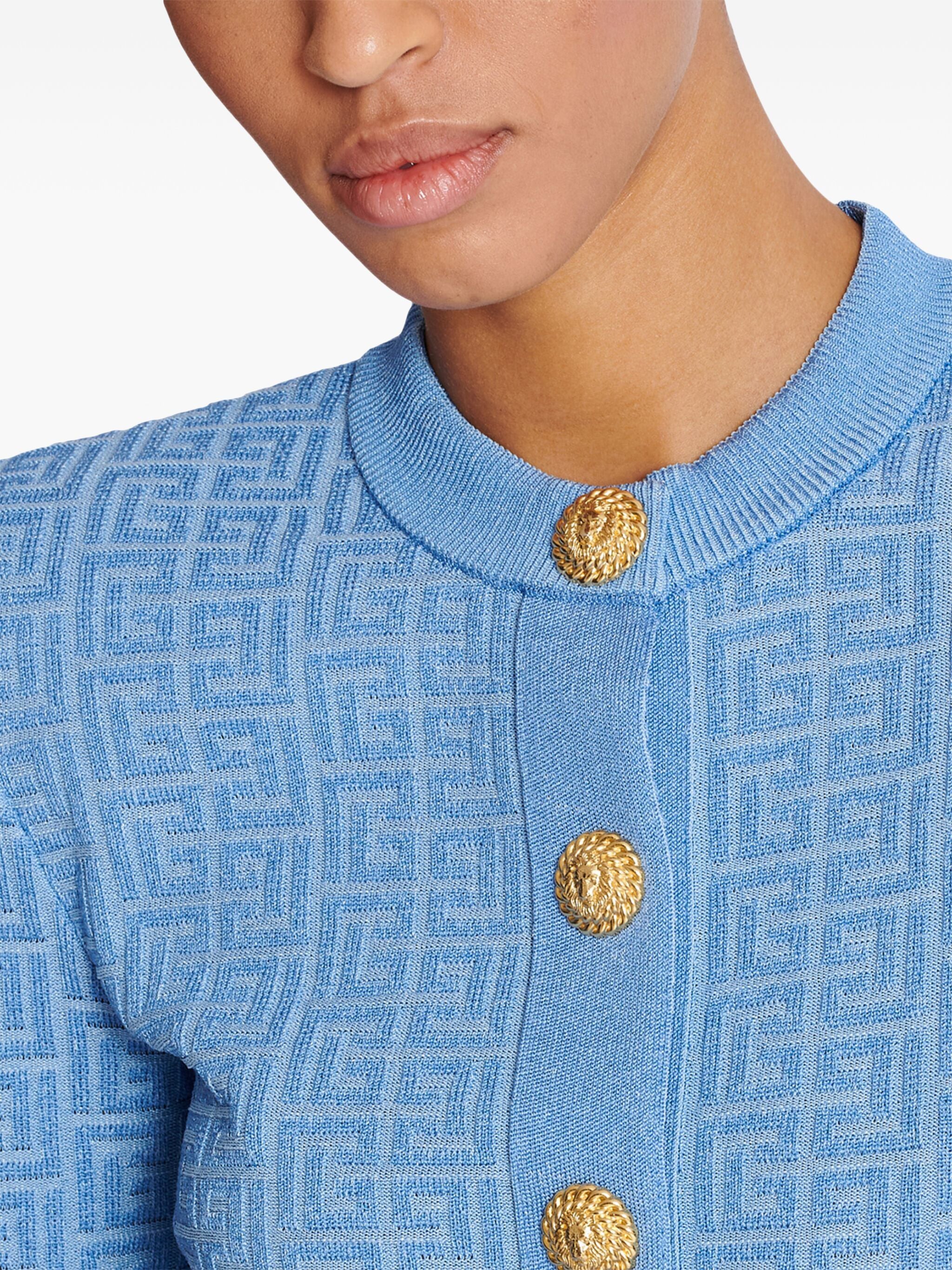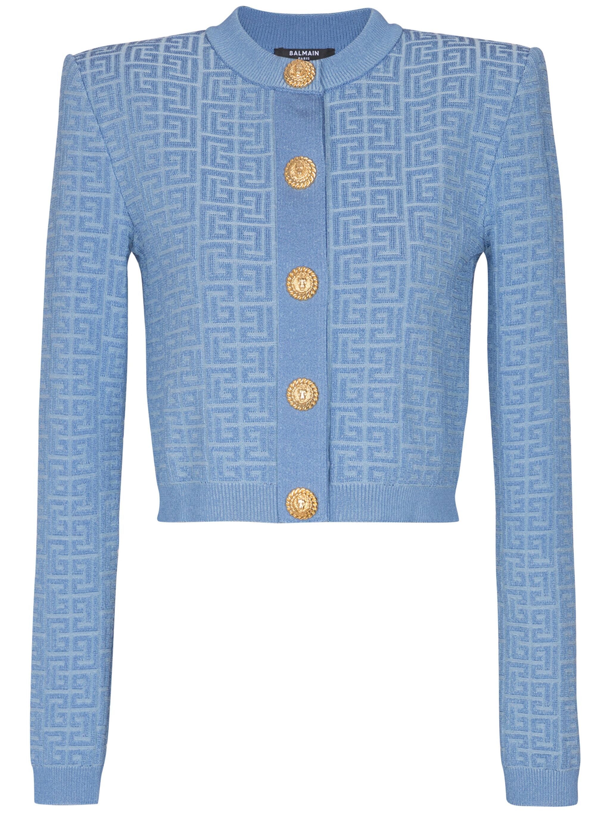 Cardigan in maglia lucida con monogramma PB labirinto, caratterizzato da uno scollo rotondo e spalle strutturate per un look sofisticato. Le maniche lunghe e la vestibilità corta e aderente esaltano la figura. La chiusura con bottoni a pressione "Leone doppia catena" in metallo dorato e la finitura a coste a contrasto completano il design elegante e distintivo.