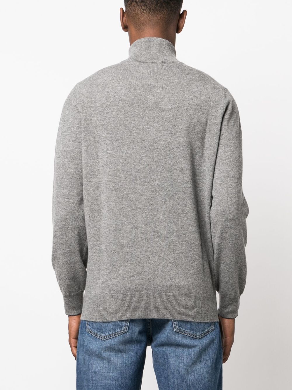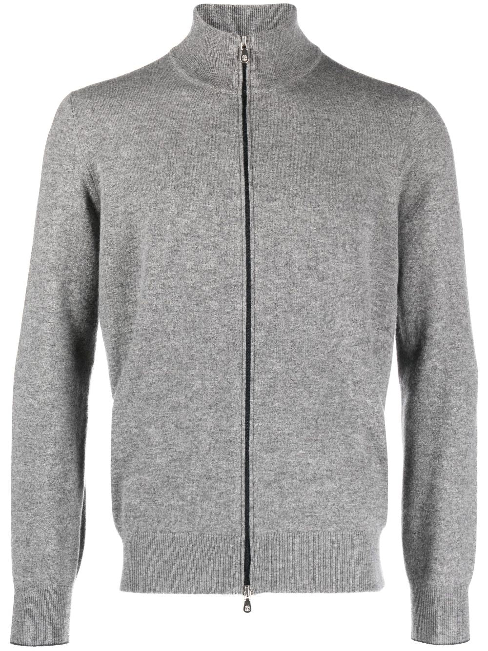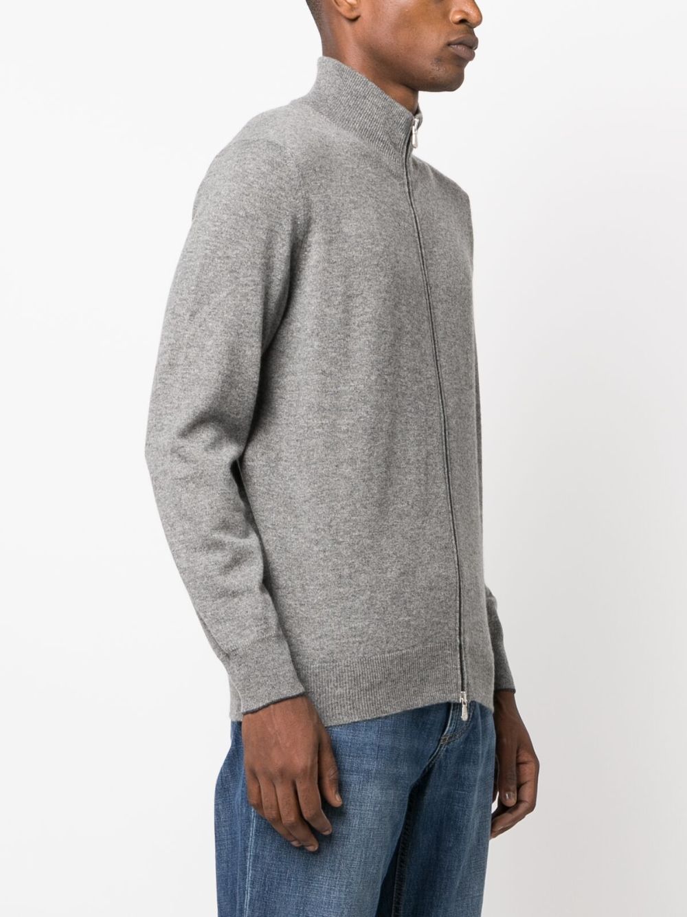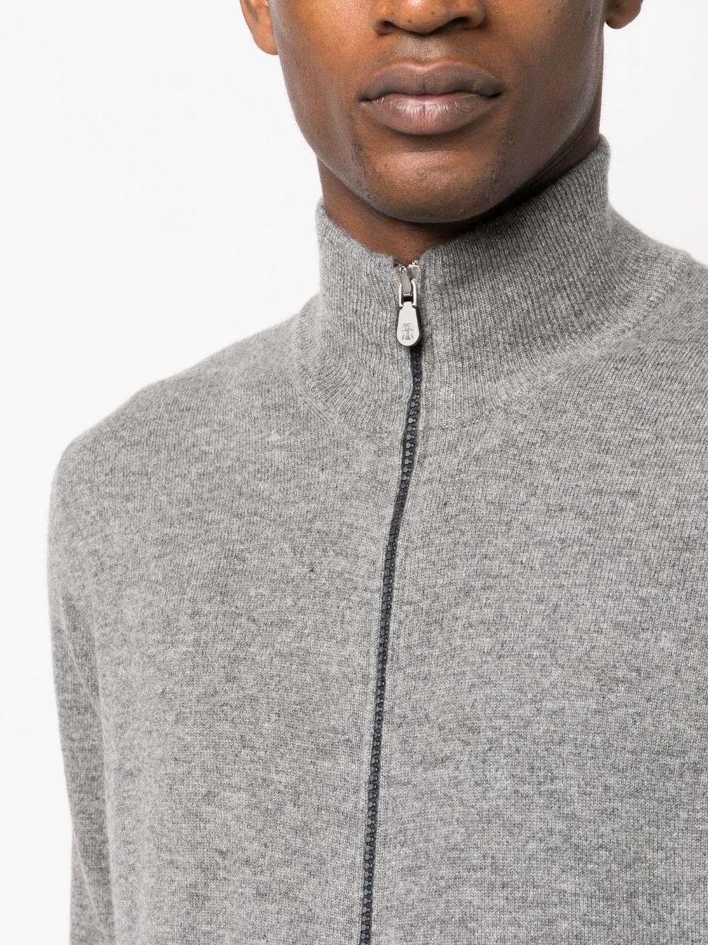 Kaschmir-Strickjacke aus Brunello Cucinelli mit mittlerem Grau, Kaschmir, gestrickter Konstruktion, hoher Hals, Reißverschluss, langen Ärmeln und gerippten Manschetten und Saum.