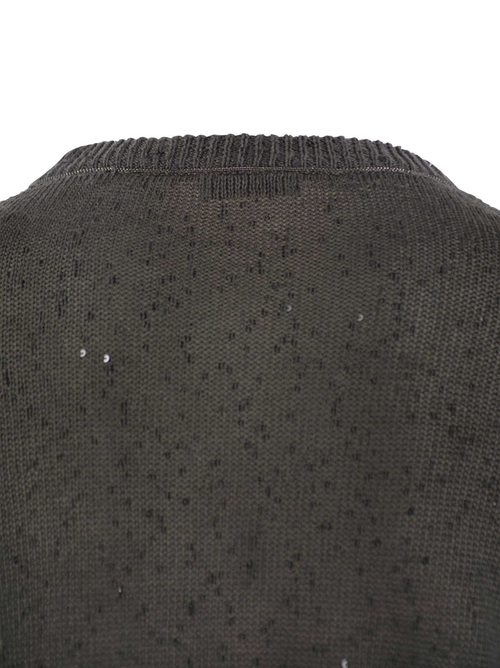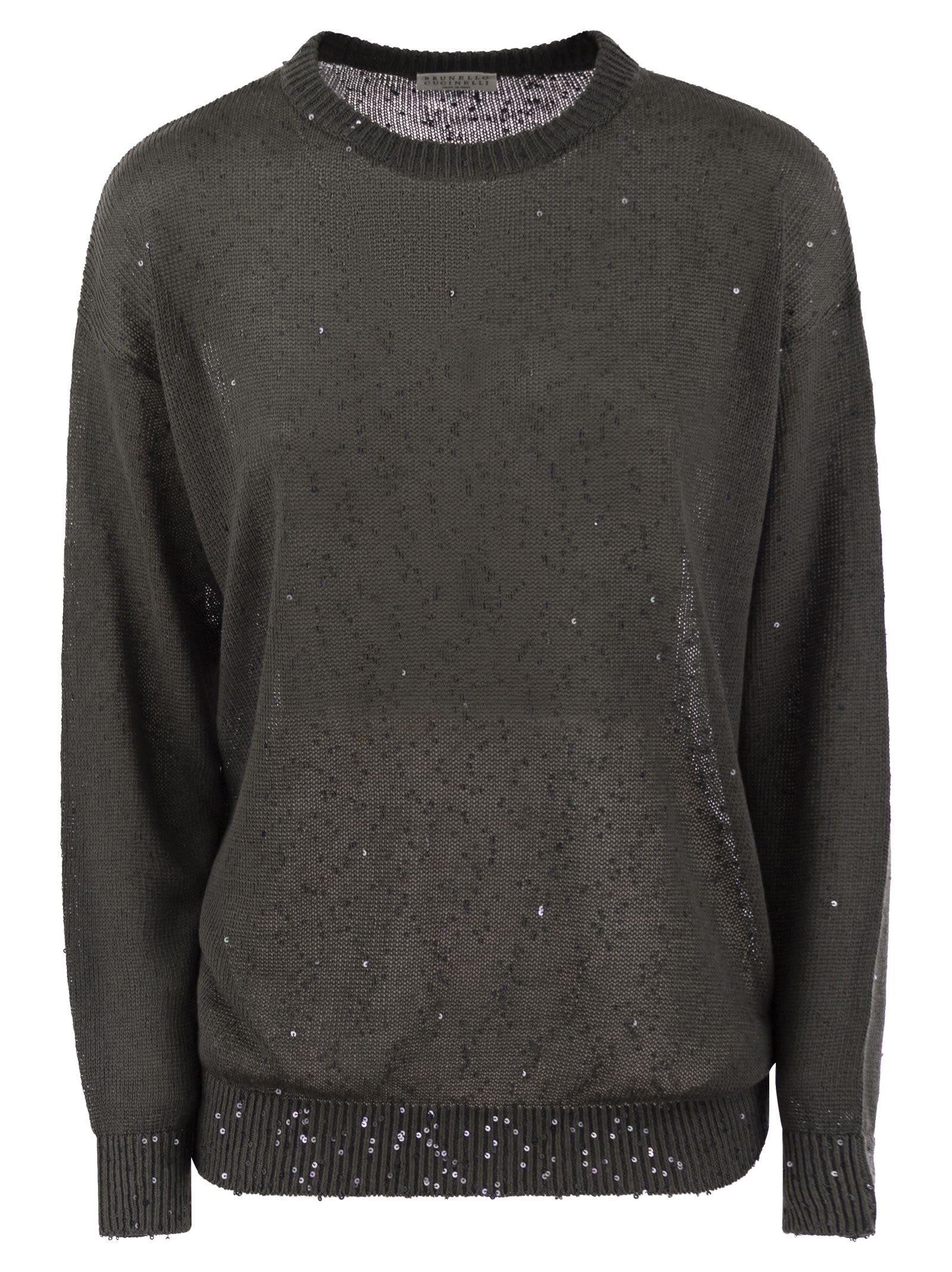 Kostbare Stricke erhöhen den wesentlichen Geschmack des schillernden Crew-Hals-Pullovers. Das Leinen- und Seidengarn ist mit zahlreichen Pailletten angereichert, die eine raffinierte und leuchtende Textur erzeugen. Die Bände des Kleidungsstücks sind regelmäßig. Ein Schmuckstrang im Nacken verleiht dem wahren Brunello -Cucinelli -Stil eine glänzende Note. .