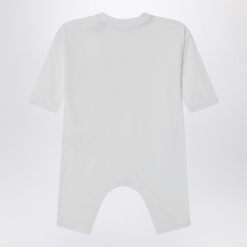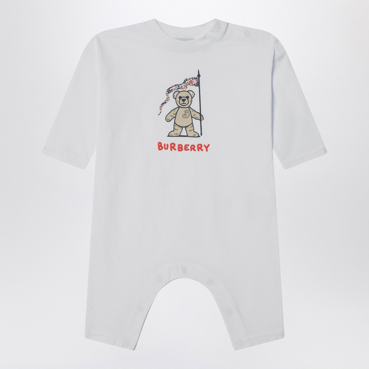 Zwei Stücke Burberry in weißer Baumwolle mit einem langärmeligen Strampler, Thomas Bear-Druck, geripptem Crewhals und Schnappknöpfen auf den Schultern und dem Schritt.