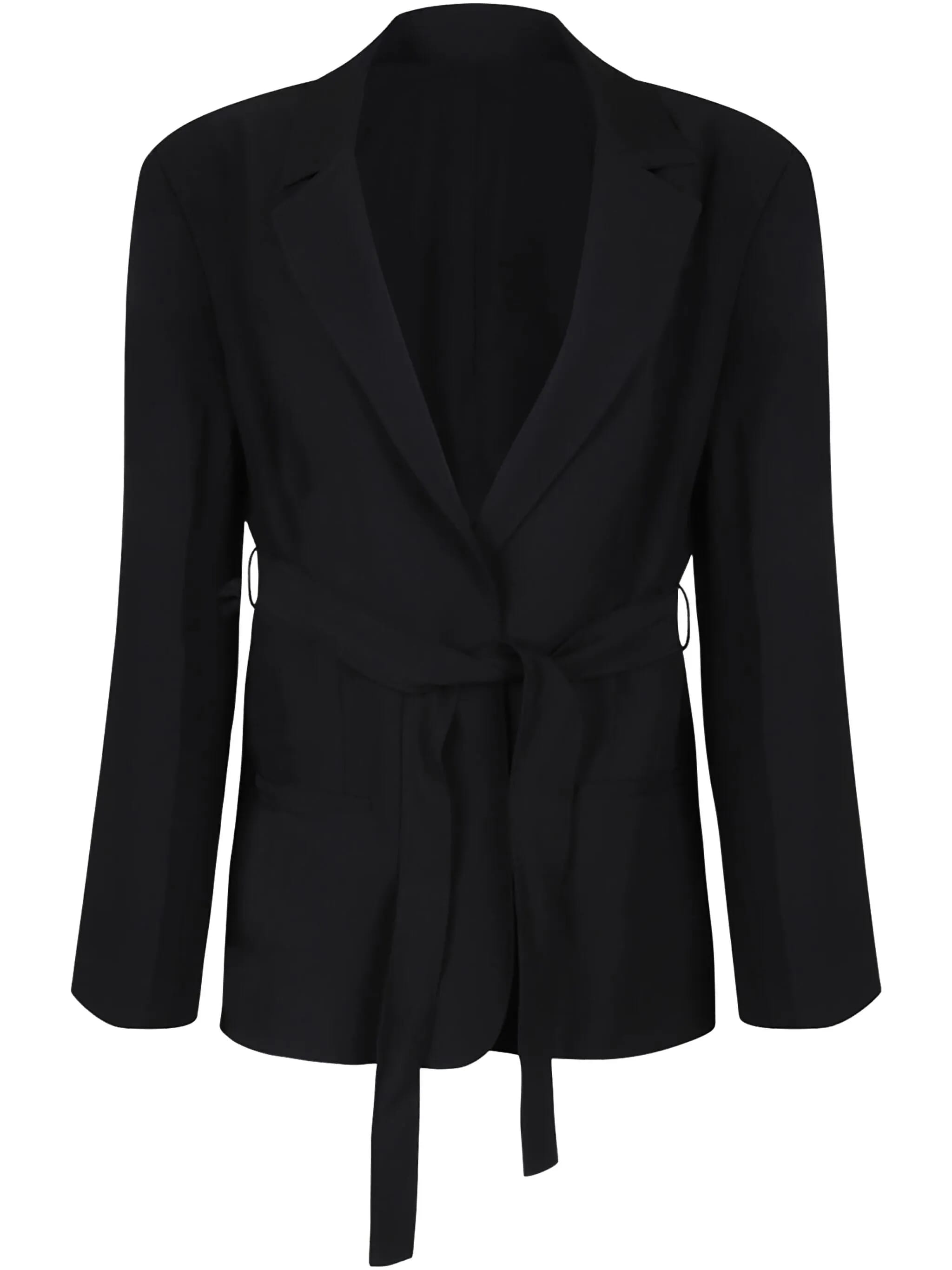 Dieser tödliche Blazer mit Reisegürtel besteht aus recyceltem Polyester und kombiniert Nachhaltigkeit und Stil. Der reguläre Schnitt und die gepolsterten Schulterpolster erzeugen eine strukturierte Silhouette, während der Kragen mit einem furchtbaren und einreißigen Verschluss eine anspruchsvolle Note verleiht. Der zu knotte Stoffgürtel vervollständigt das moderne Design.