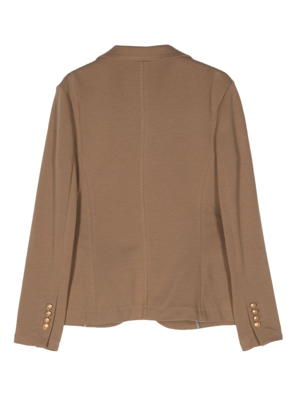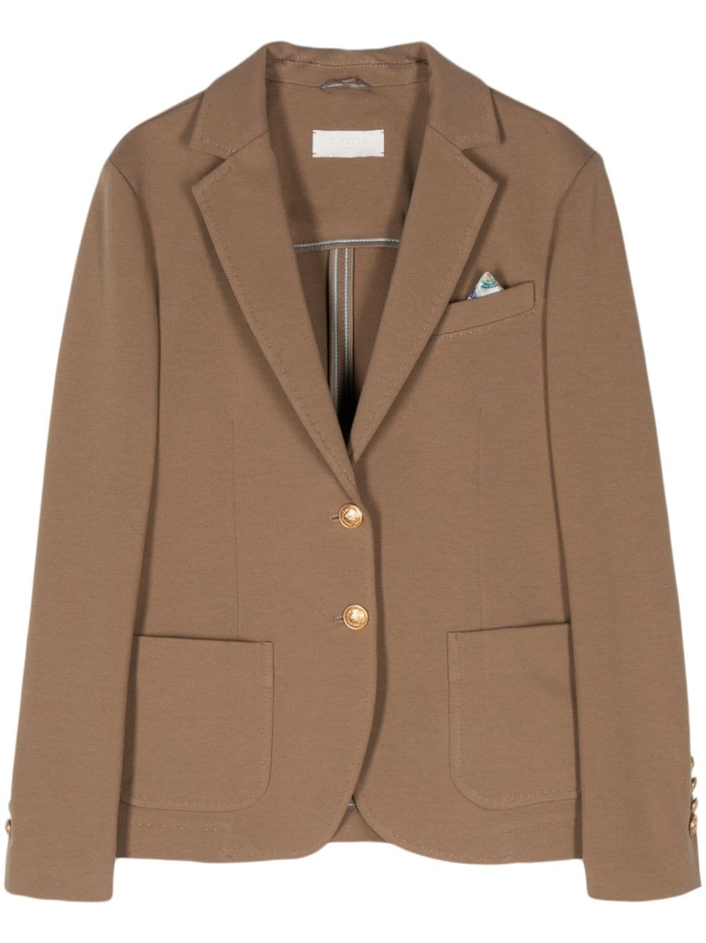 braune Baumwollmischung Jersey Textur Blumendruhe Taschenquadrat-Kunst-Taschen-Detail am Brustpfeil detaillierende Logo-aufgeriegte Knöpfe gekerbte Revers Langschläuche Faux-Knopftoner Italienisch hintere Lüftungsöffnungen Zwei vordere Flecktaschen gebogener Saum