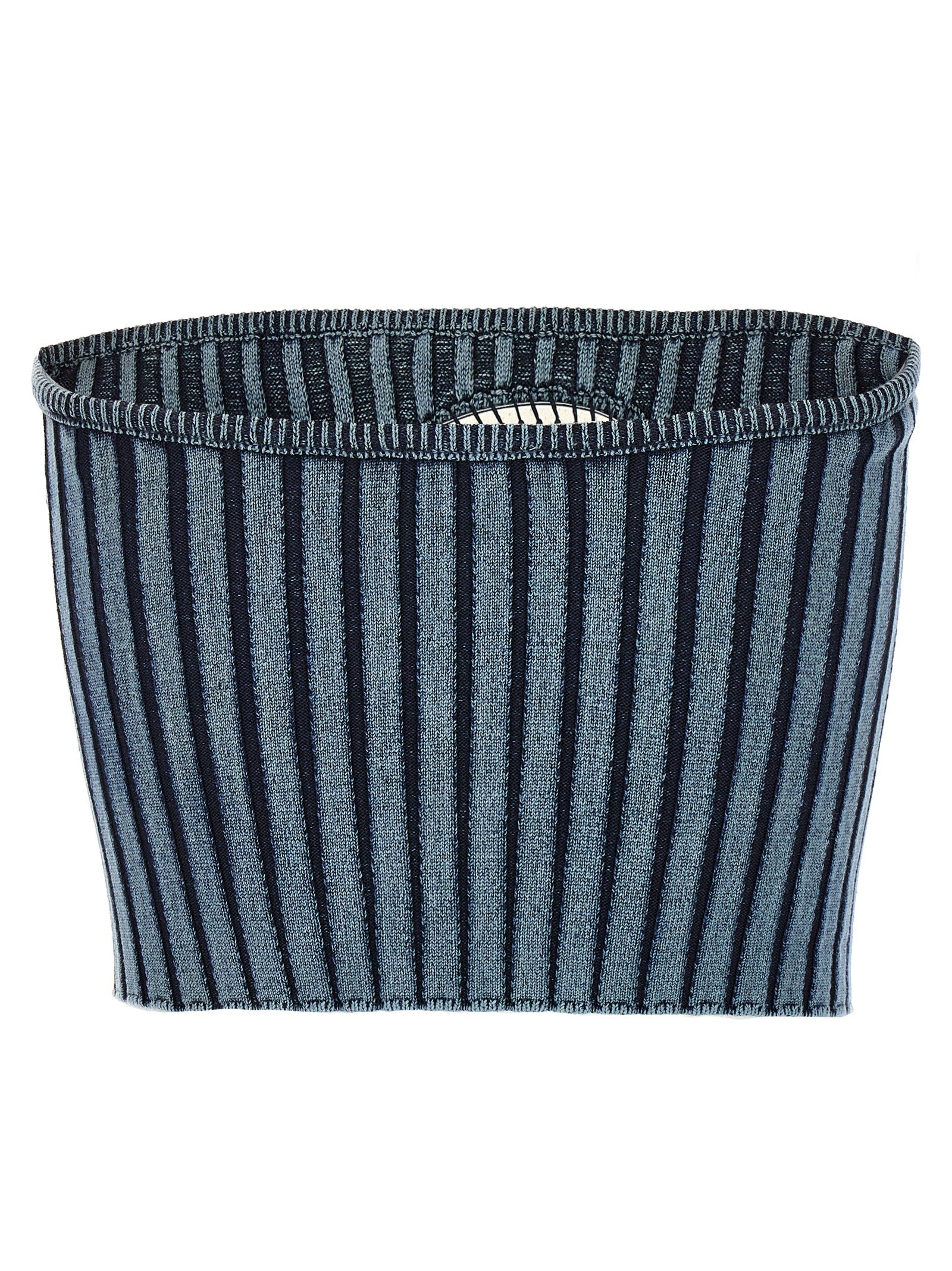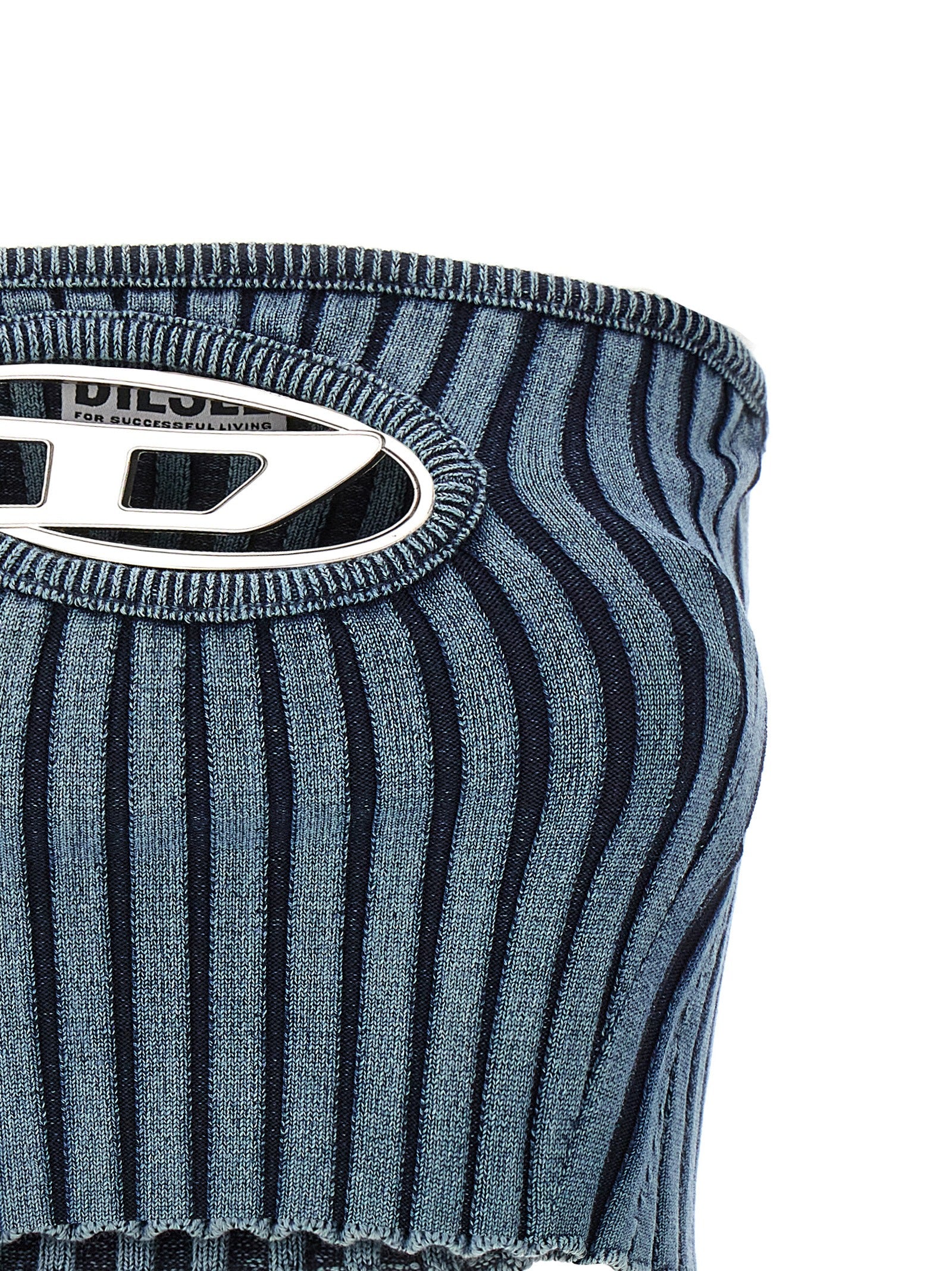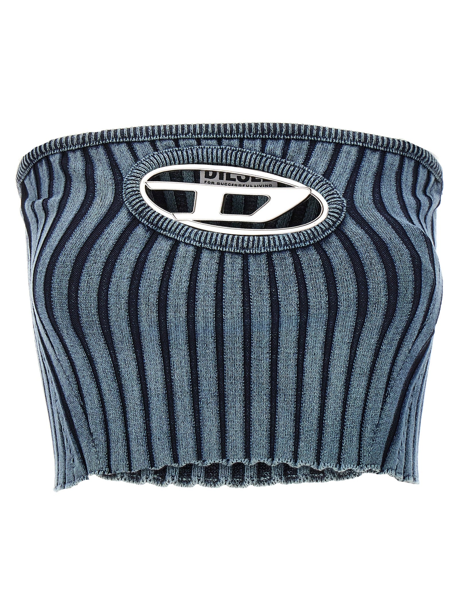 'M-Clarksville 'gerippte Baumwollmischtoper, Off-the-Shoulder- und Cropped Model, Front Metal Logo.