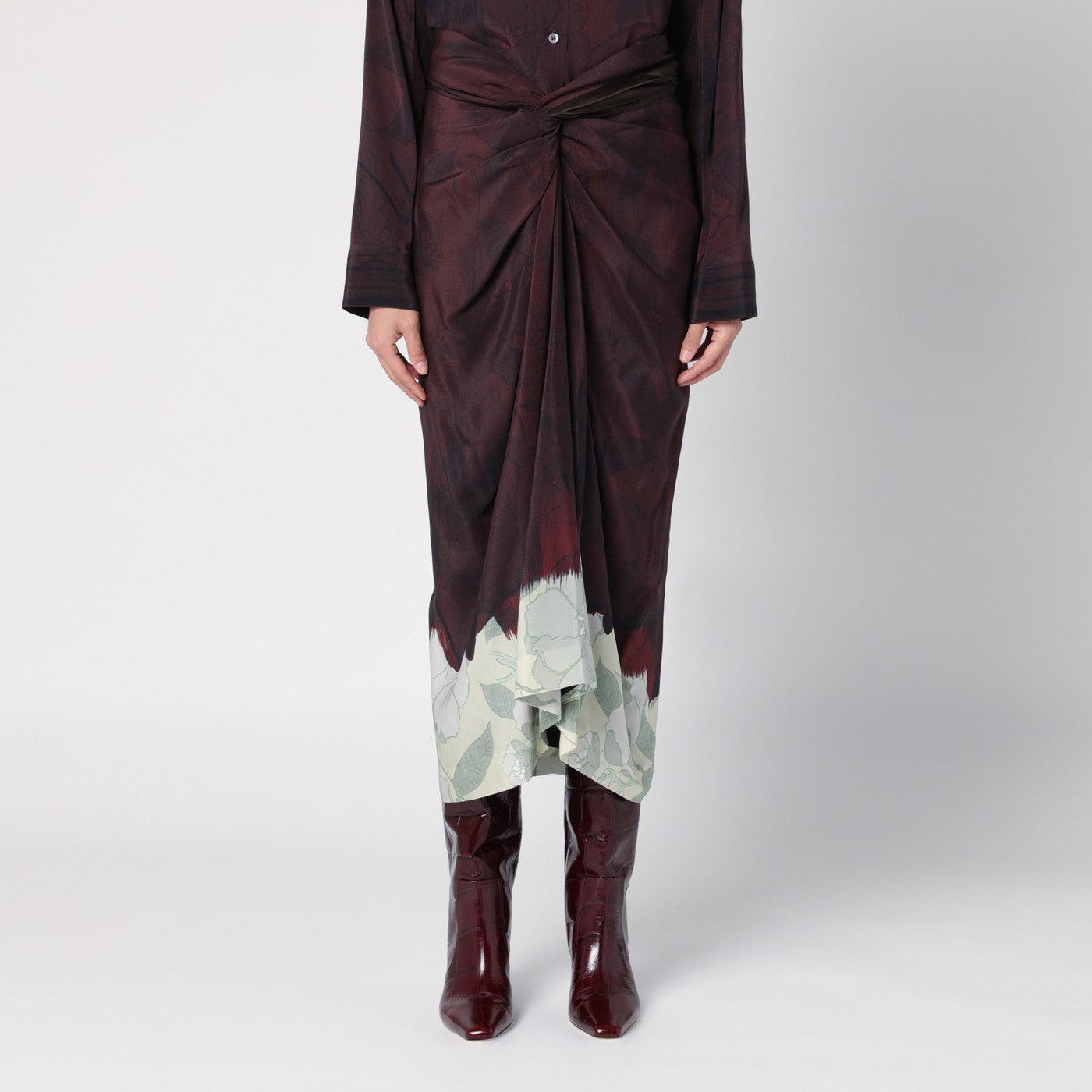 Silk midi skirt by Dries Van Noten in brown floral print, featuring draped front and back zip fastening.
