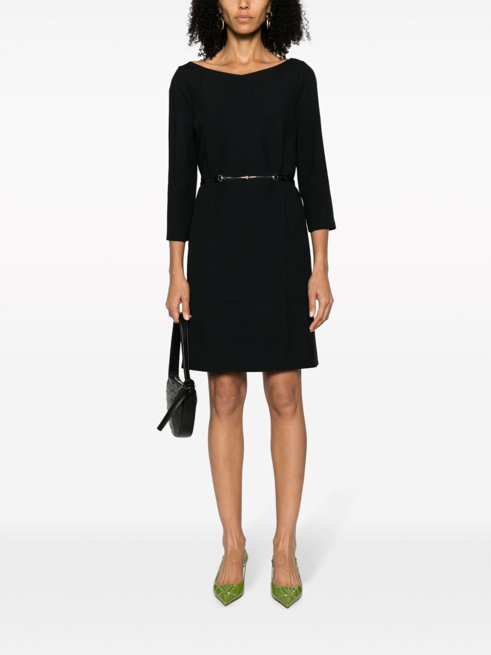 Horsebit-Kleid von Gucci mit schwarzem, Schatz-Hals, dreiviertel Länge Ärmel, Gürtel Taille, typischem Horsebit-Detail, überkneegierter Länge und gerader Saum.