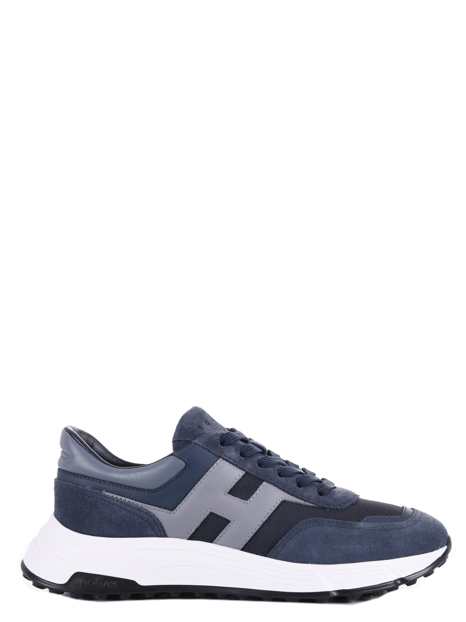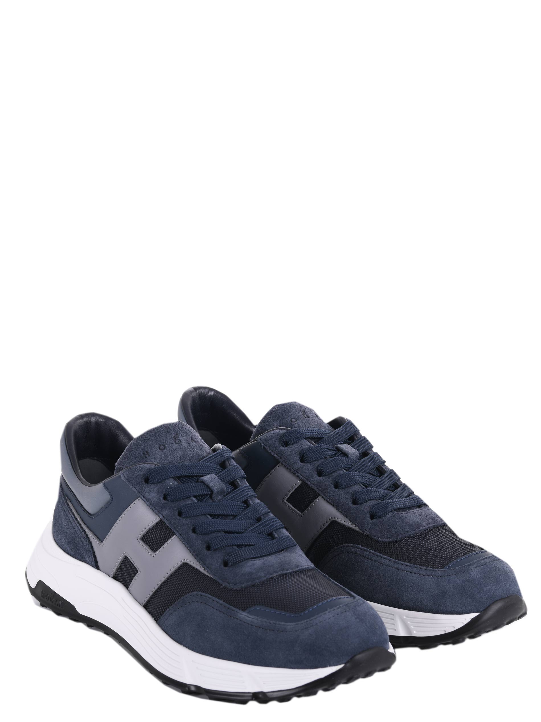 Hogan -Turnschuhe in Leder und Nylonblau/Avion. Schnüre. Ton-auf-Ton-Hogan-Schriftzug auf der Zunge. H auf der Seite in Leder. Details im technischen Stoff. Fußbett in 8 mm Speicherschaum. Weißer Gummi -Sohle. Größe in Foto 6