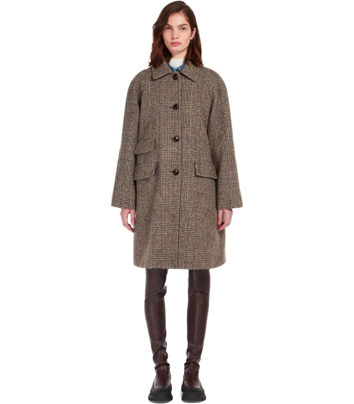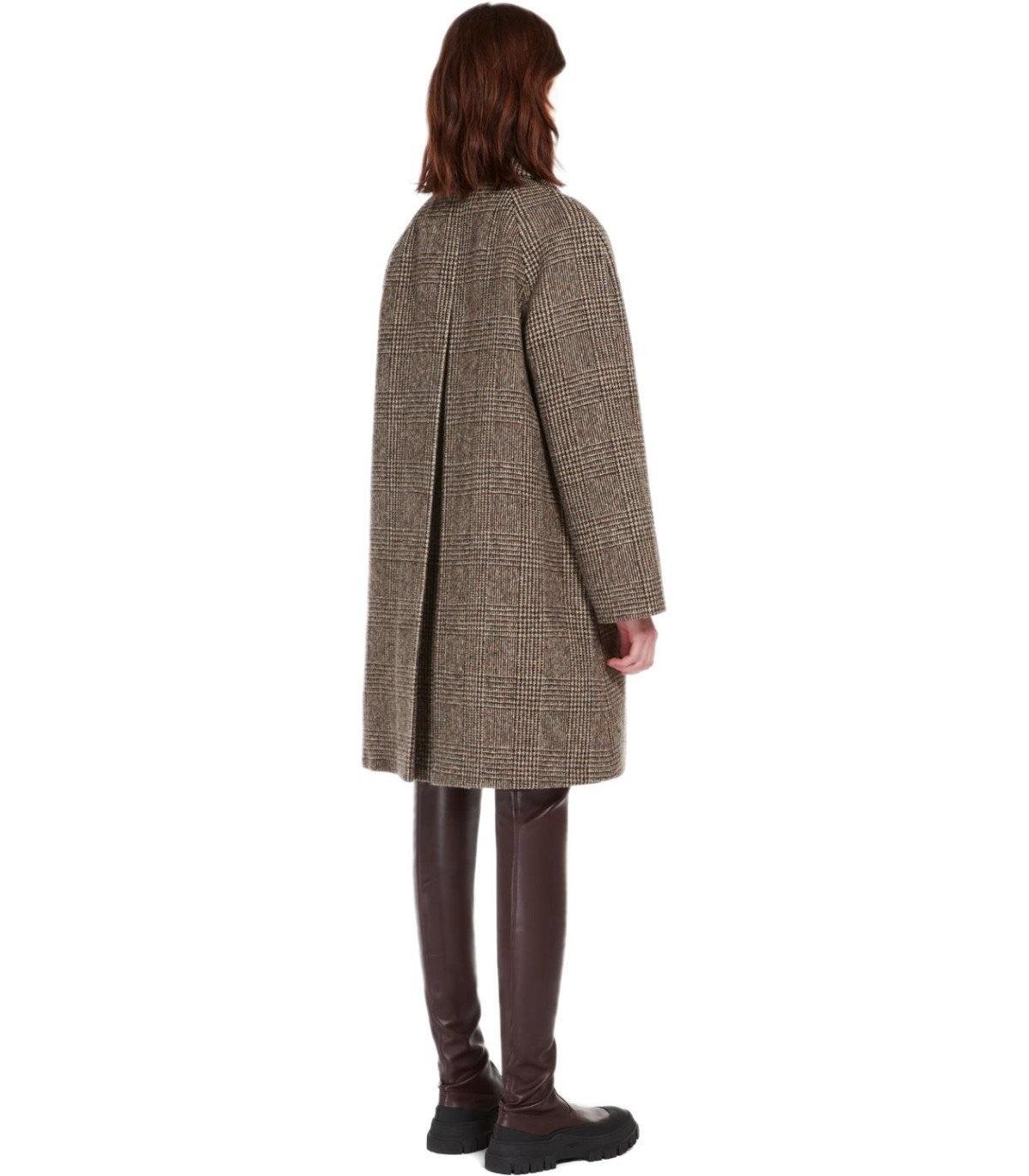 MIDI Ein-Bastentier-Mantel von Max Mara Weekend, hergestellt aus Virgin Wool Tweed mit einem Prince of Wales-Muster in Brown. Gekennzeichnet durch einen zentralen Knopfverschluss. Mit einer Kokonform verfügt es über einen Hemdkragen. Ausgestattet mit langen Raglan -Ärmeln, hat es drei Klappentaschen vorne. Mit einer zentralen Entlüftung hinten dekoriert. Locker Passform. Das Modell trägt Größe 40 (IT) und ist 178 cm groß. Zusammensetzung: Stoff 98% jungfräuliche Wolle, 2% Polyamid; Auskleide 50% Acetat, 50% Viskose.