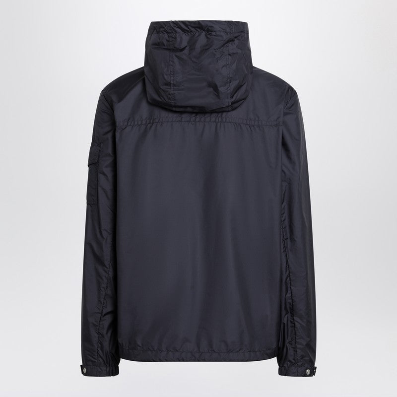 Moncler jacket in waterproof navy blue nylon, featuring a hood with drawstring, long sleeves with an applied flap pocket and logo patch, elastic cuffs with snap buttons, and two side welt pockets with button and hem with drawstring.