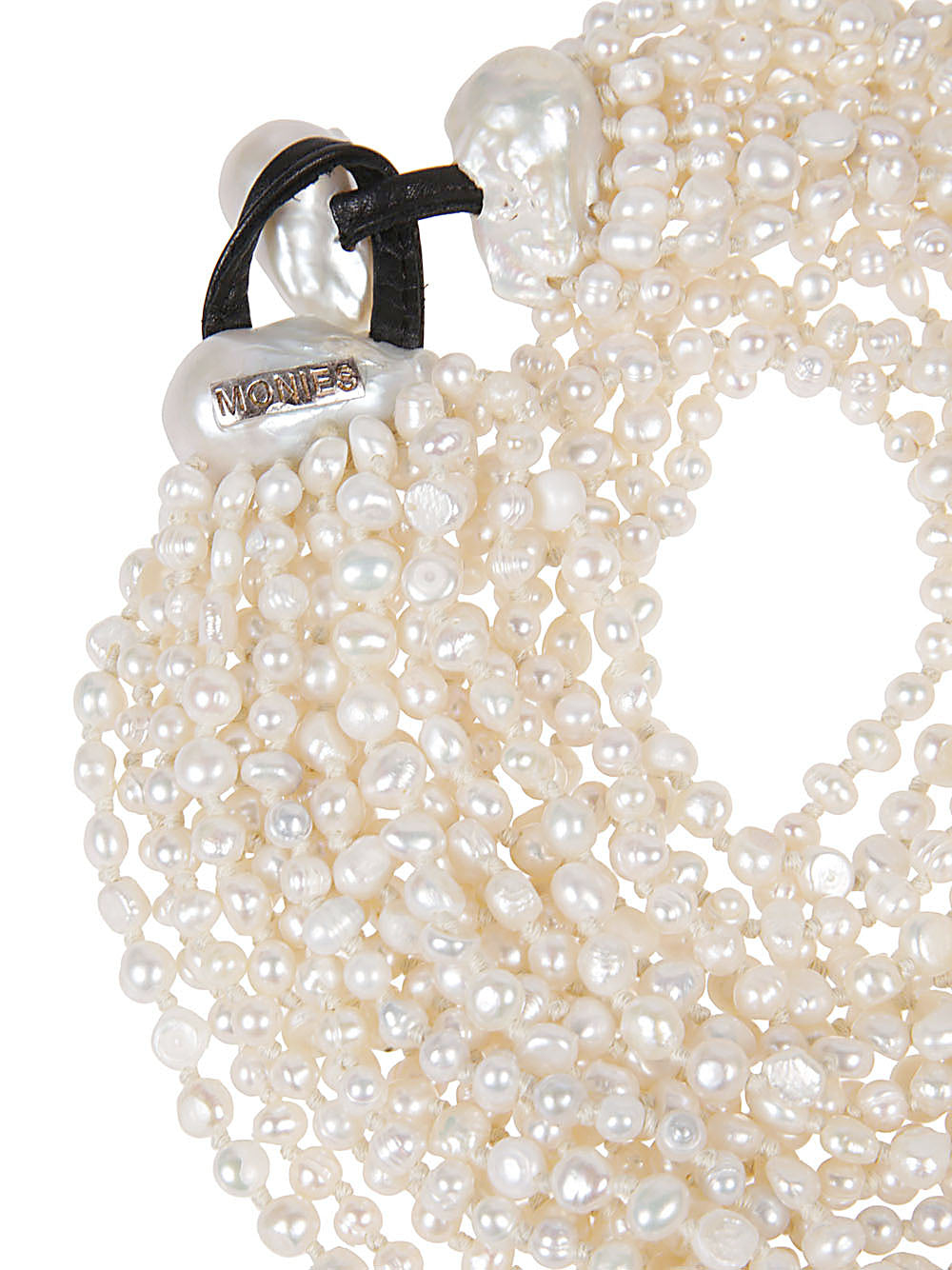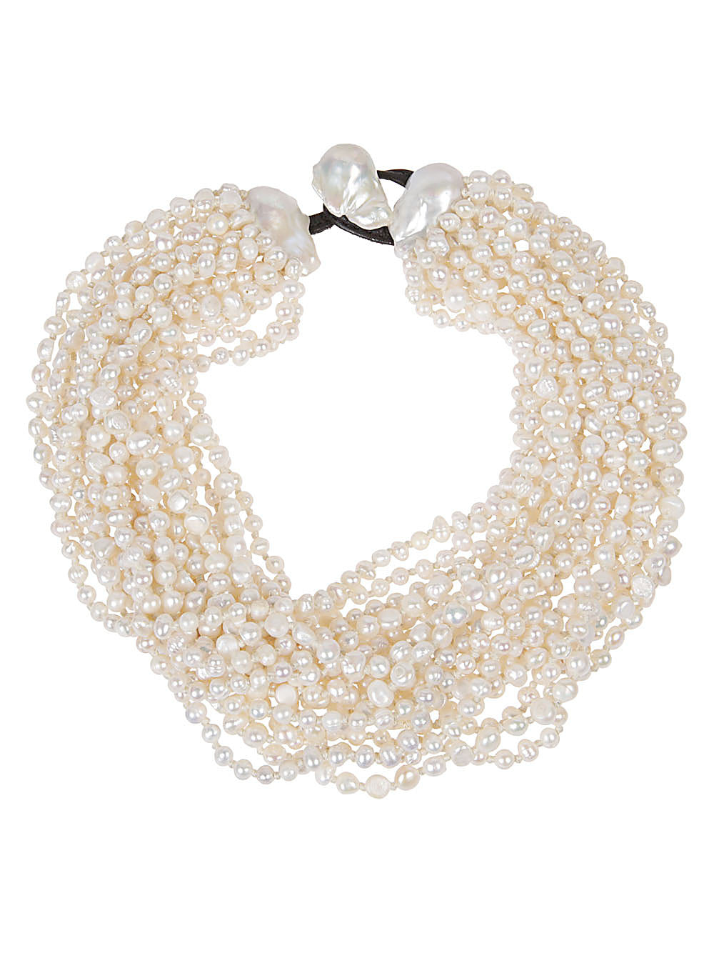 Pearl necklace with various turns with pearl clasp and leather cord.