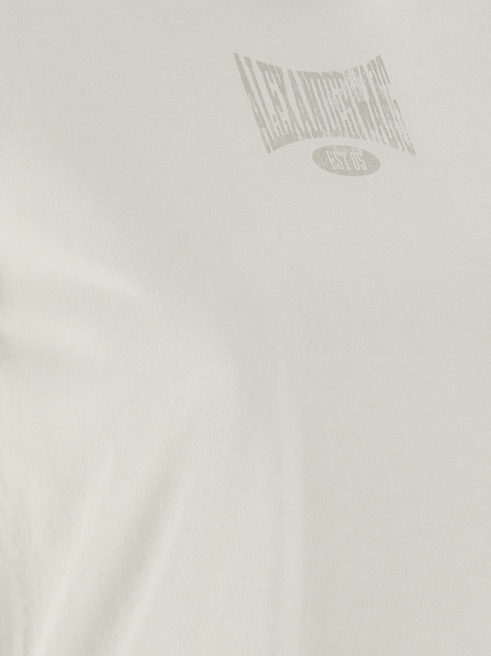 Off-weißes Baumwoll-T-Shirt mit einem gelebten Effekt-Ton-auf-Ton-Logo-Druck, Crewneck und kurzen Ärmeln.