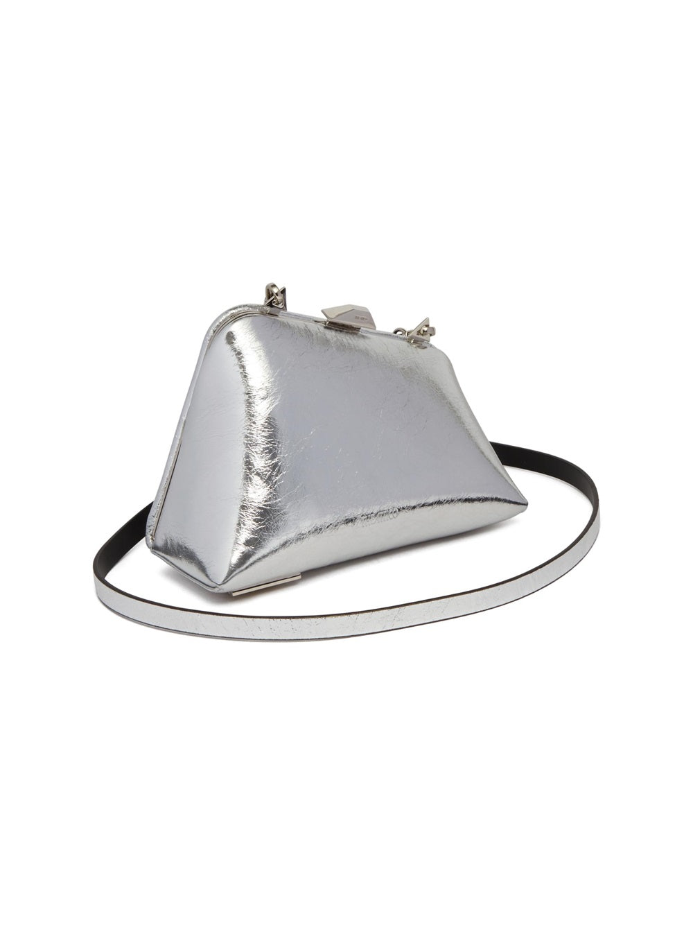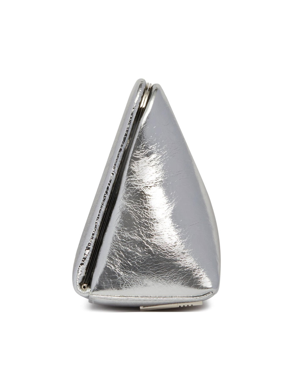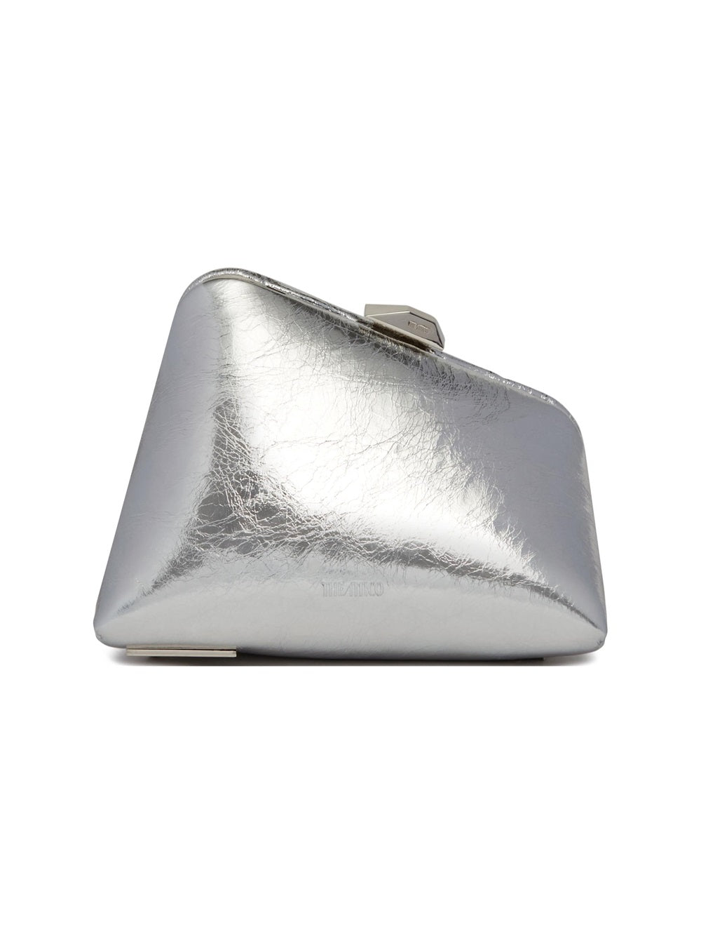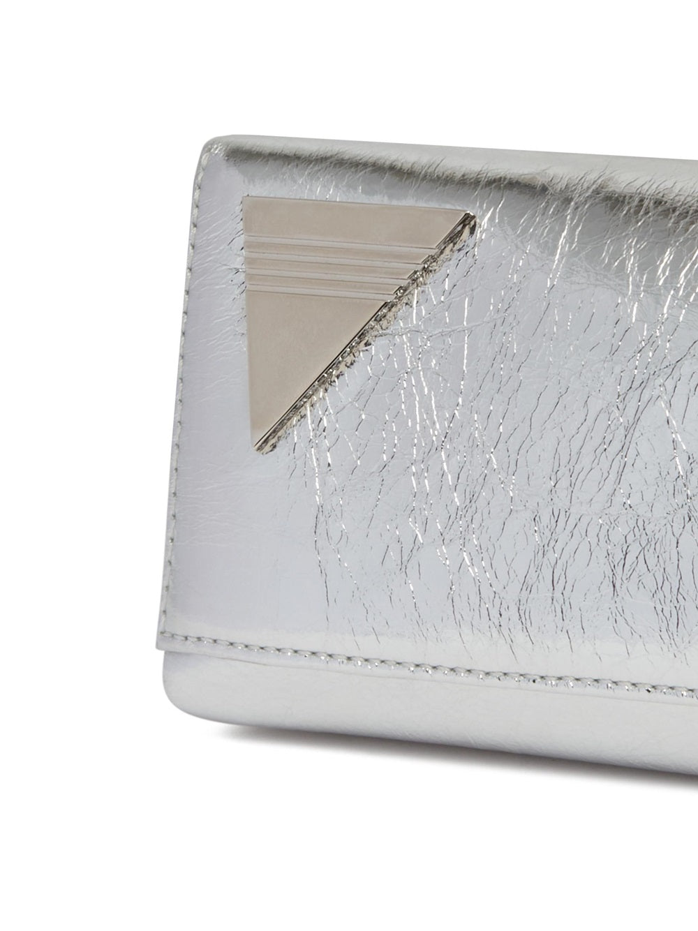 Silver Midnight Mini Clutch vom Attico. Hergestellt aus silberfarbenem, craquelè -laminiertem Leder mit abnehmbarem Schultergurt und Schnappverschluss. Füße in Form des Attico-Logos, interne Kartenfach, das Attico-Logo, das auf der vorderen, versilberten Hardware geprägt ist.