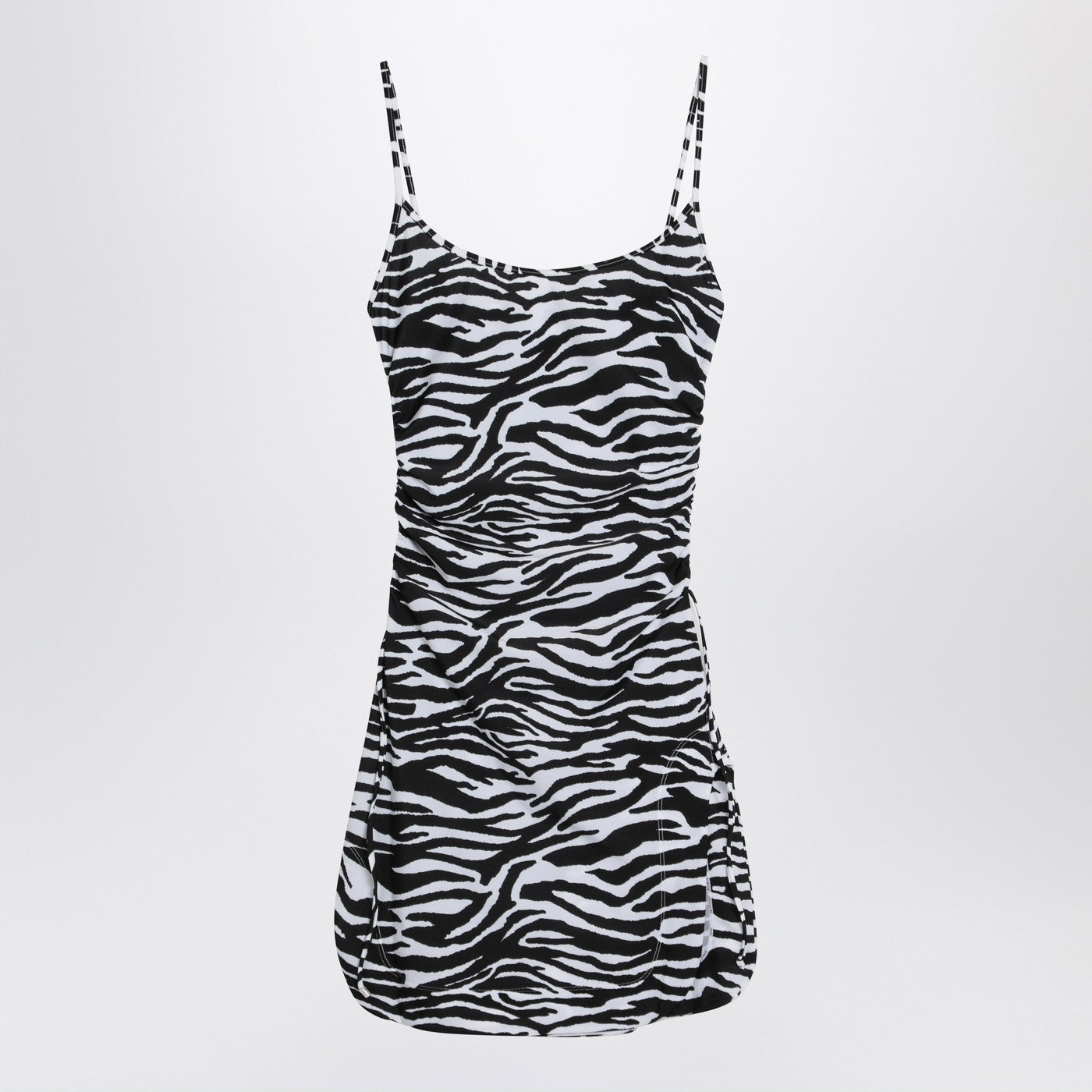 Der Attico Zebra Print Stretch Fabric Coverup in Schwarzweiß, gekennzeichnet durch dünne Gurte, sammelte Details an den Seiten und einen gebogenen Saum mit Schlitzen.