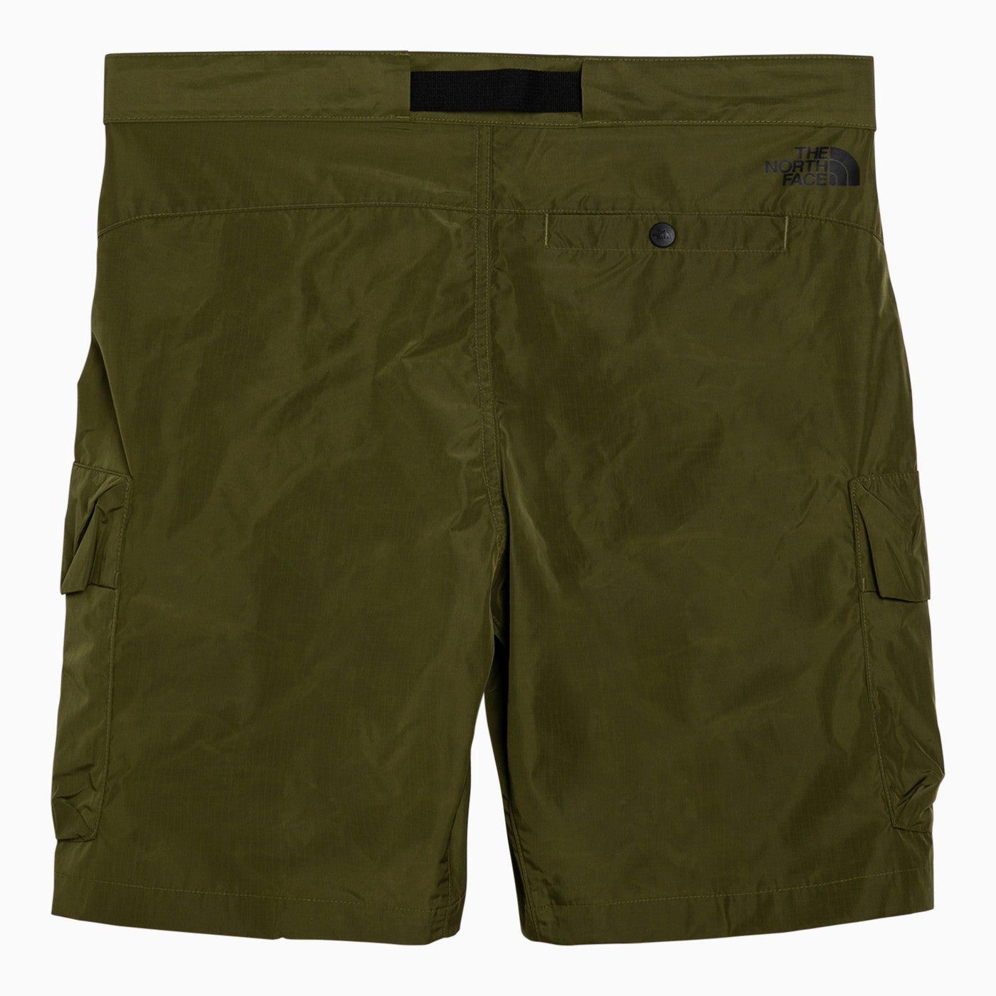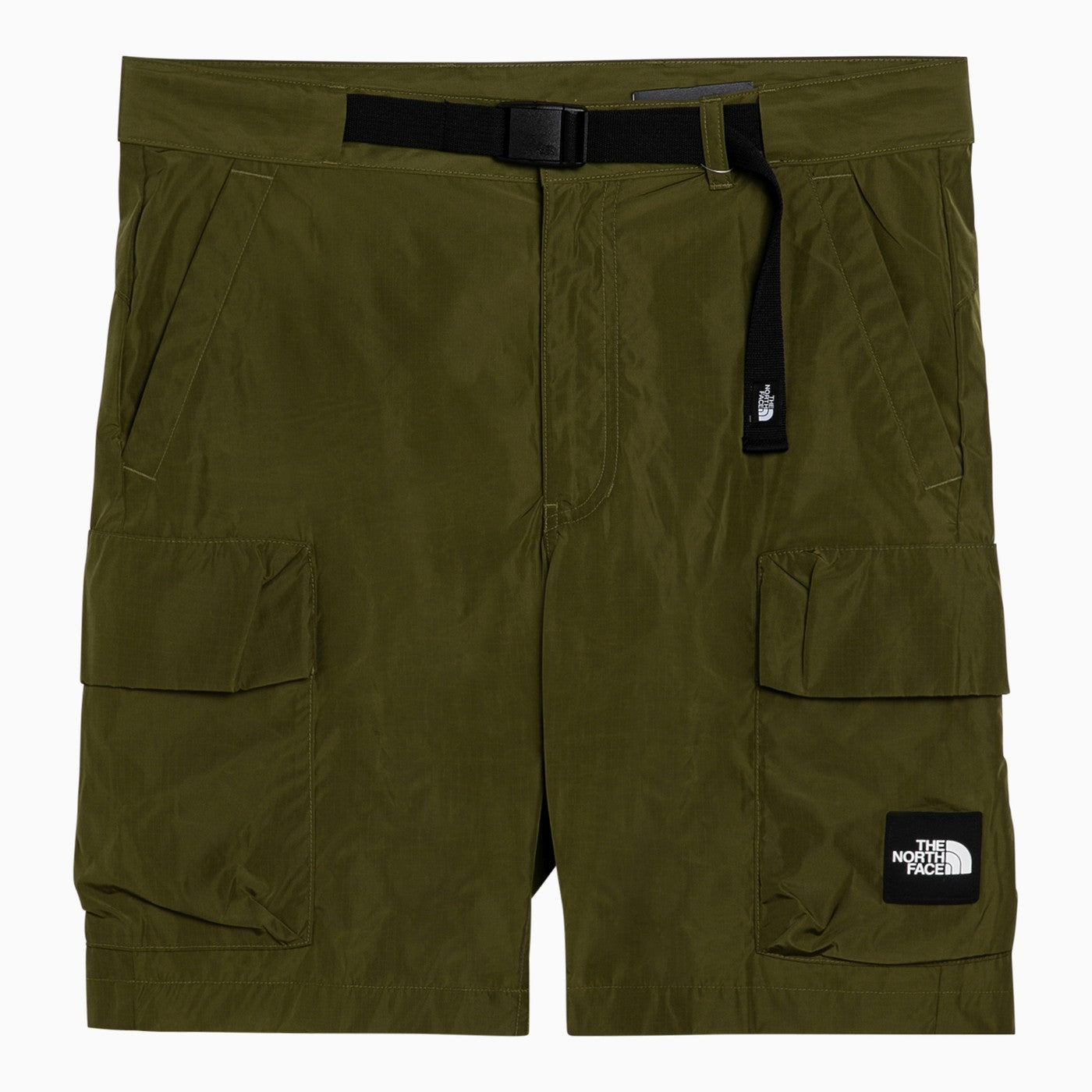 Kurz vom nördlichen Gesicht im olivgrünen Windwand technischem Stoff mit einem verstellbaren Bund, zwei Seitenkerntaschen, einer Kettestasche mit Schnappknopf auf der Rückseite, zwei Patch -Ladetaschen mit Klappen- und Logo -Patch und Logo -Schriftzug auf der Rückseite.