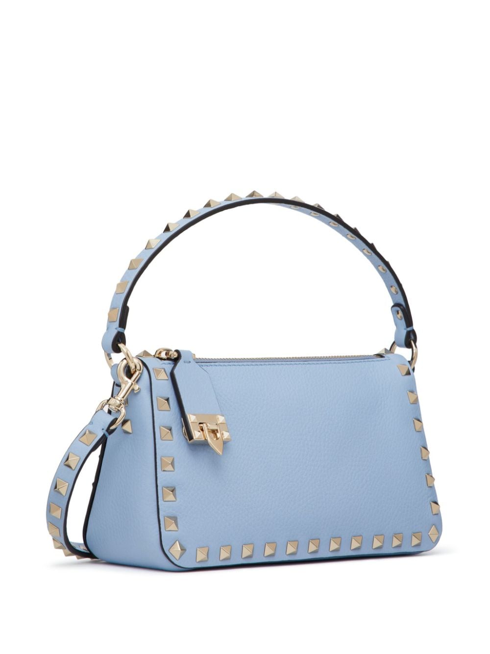 Cerulean Blue Calb Leder Körnigte Textur Gold-Tone Rockstud Detaillierung Einzelabnehmbarer oberer Griff verstellbar abnehmbarer Schultergurt Top Reißverschluss Hauptfach interner Logo-Patch Einzelkartensteckplatz
