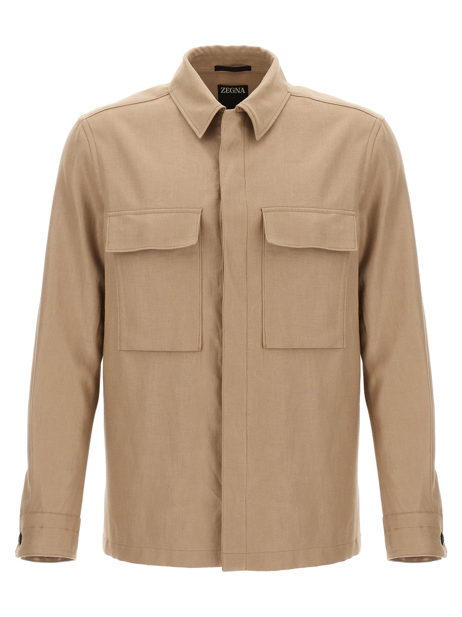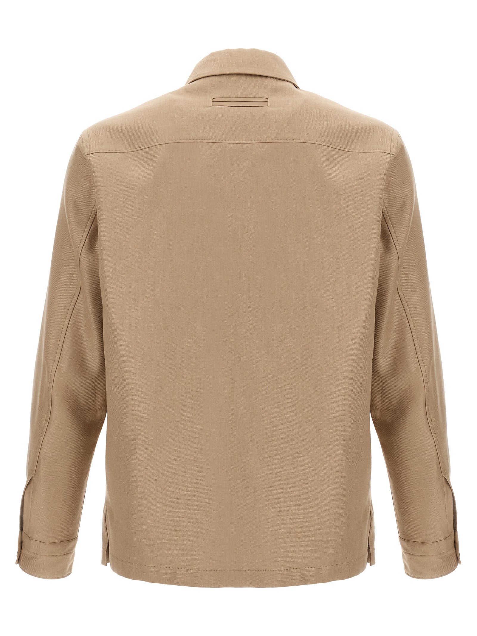Leinenoase Overshirt, innere Membran, versteckte Schließe vorne, Taschen, lange Manschettenärmel, Seitenschlitze, Ton-auf-Ton-Leder-Details auf der Rückseite.
