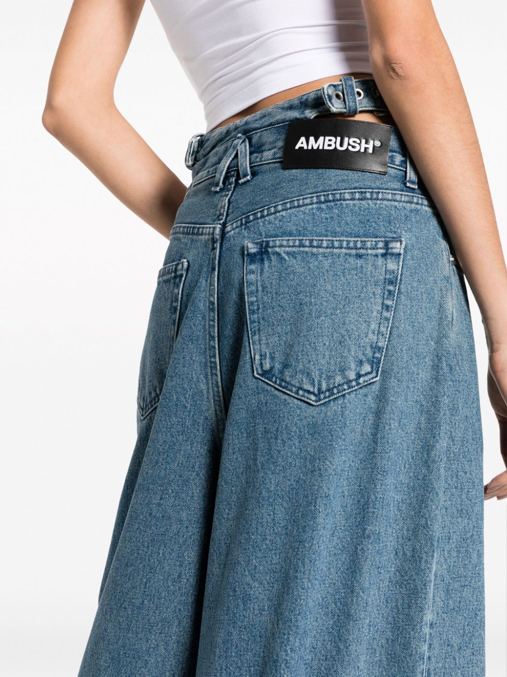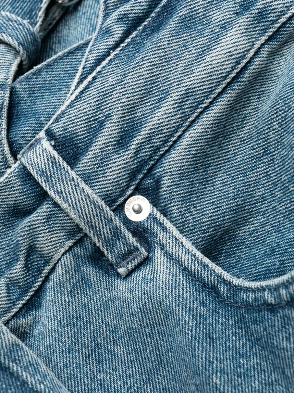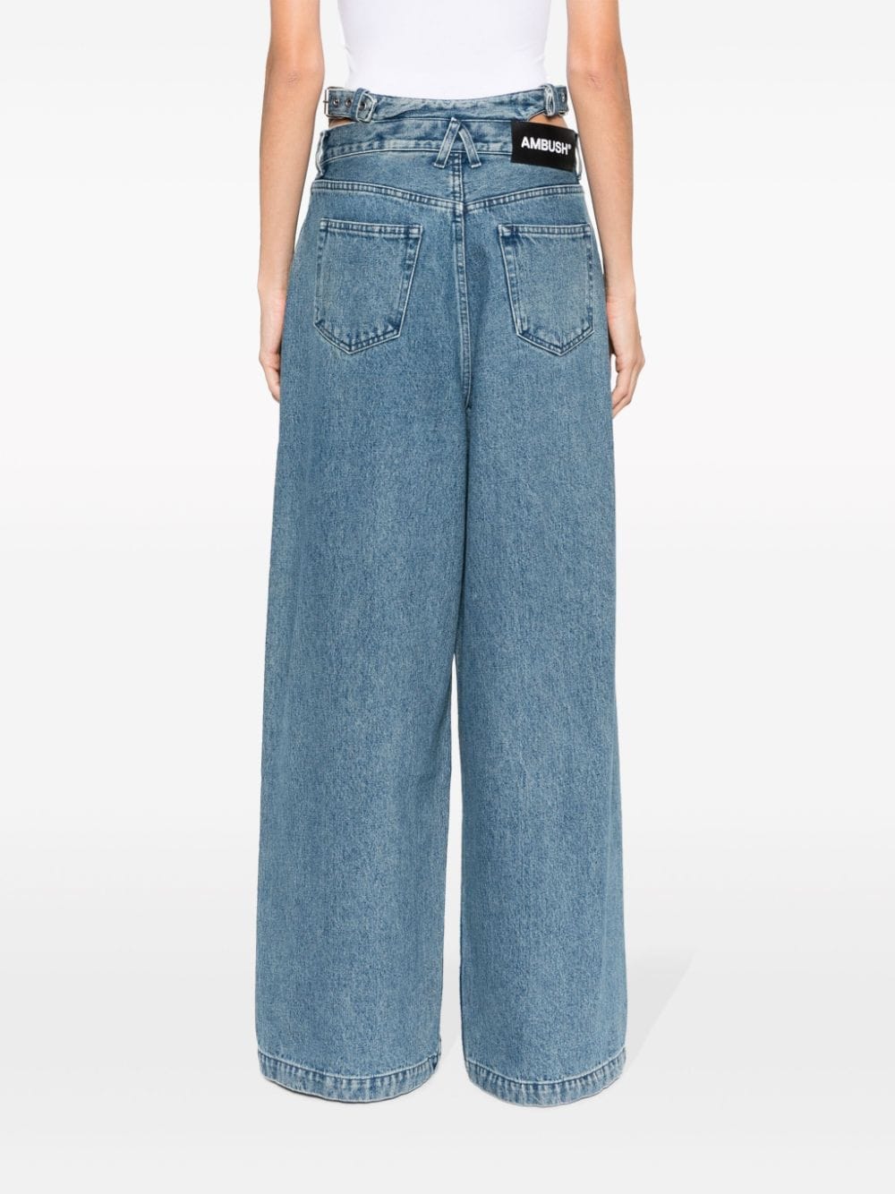 Taille-Gurt-Weitbein-Jeans aus dem Hinterhalt mit blauem, Baumwoll-, Frontknopf- und Reißverschluss, klassischen fünf Taschen, Breitbein und Taillengürtel.
