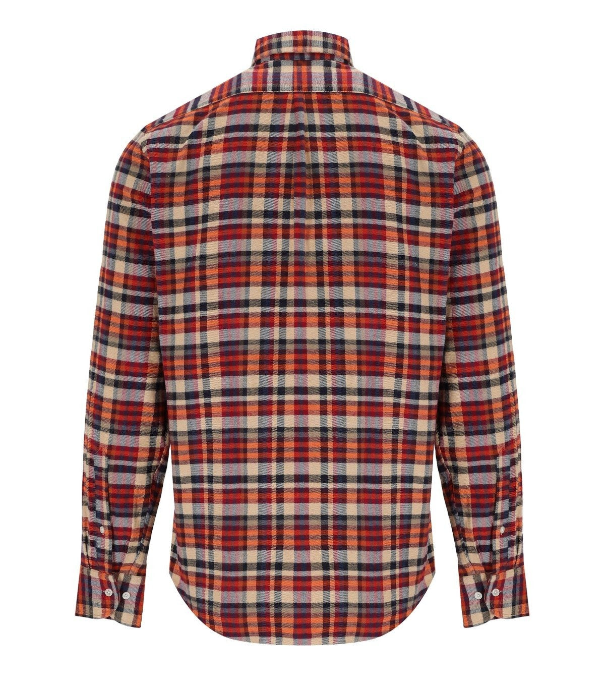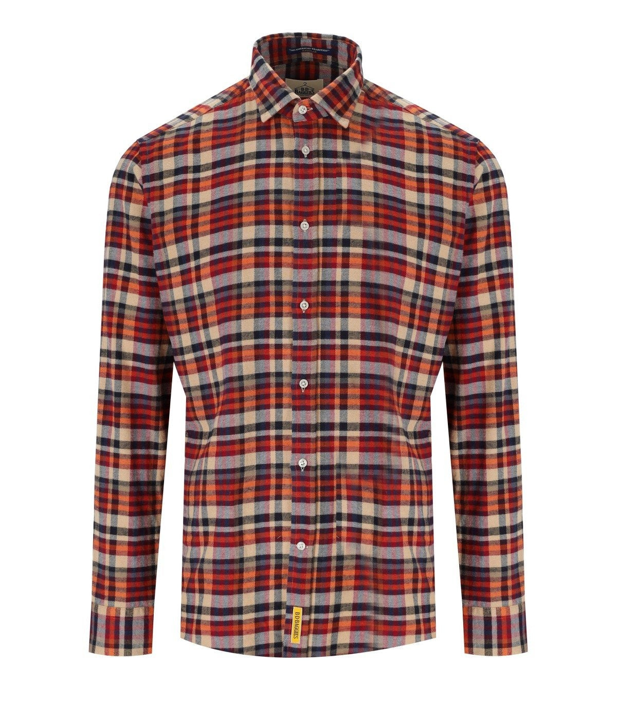 Bradford-Shirt von B-D-Baggies aus Baumwollflanell mit einem Scheckmuster in Orangenschatten, Blau und Beige. Kontrastierender Nählogo -Patch, Knopfverschluss. Normale Passform. Zusammensetzung: 100% Baumwolle.