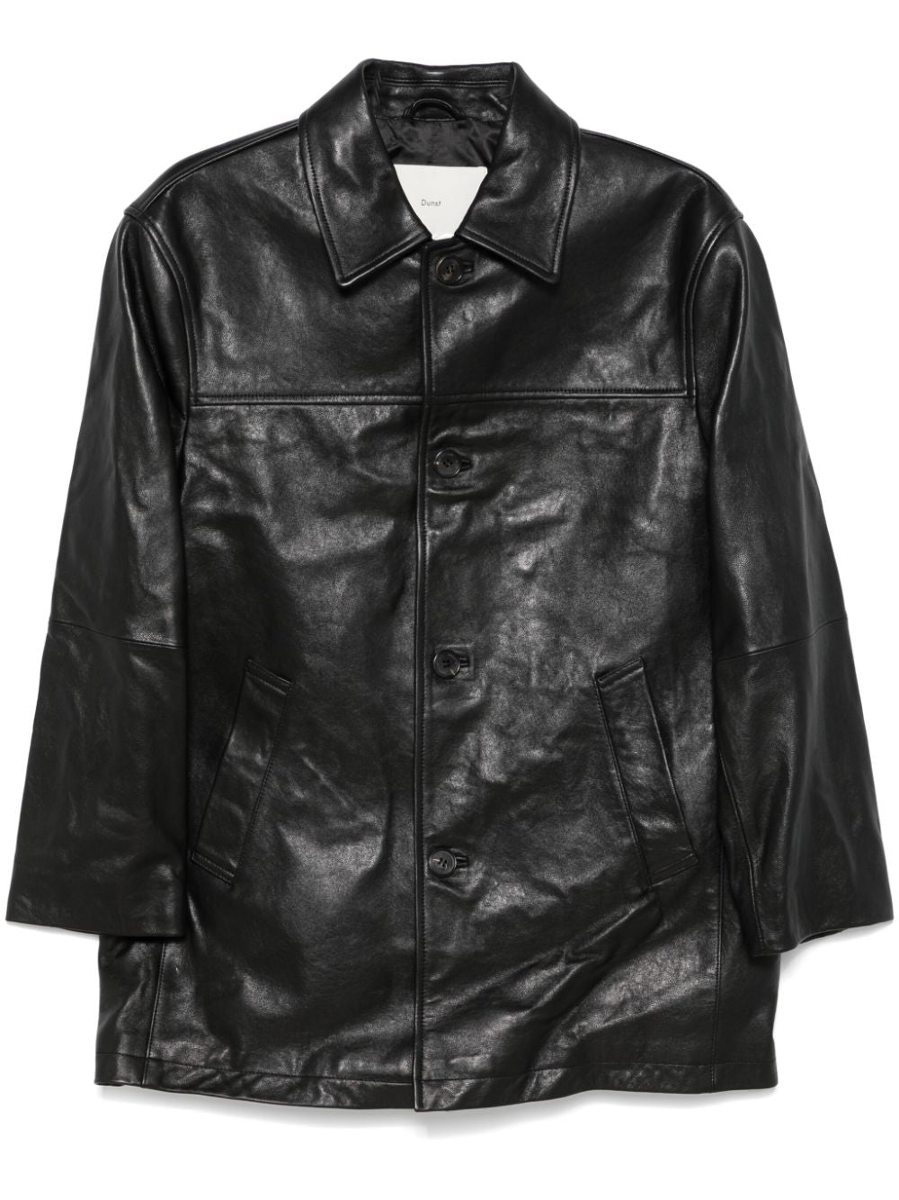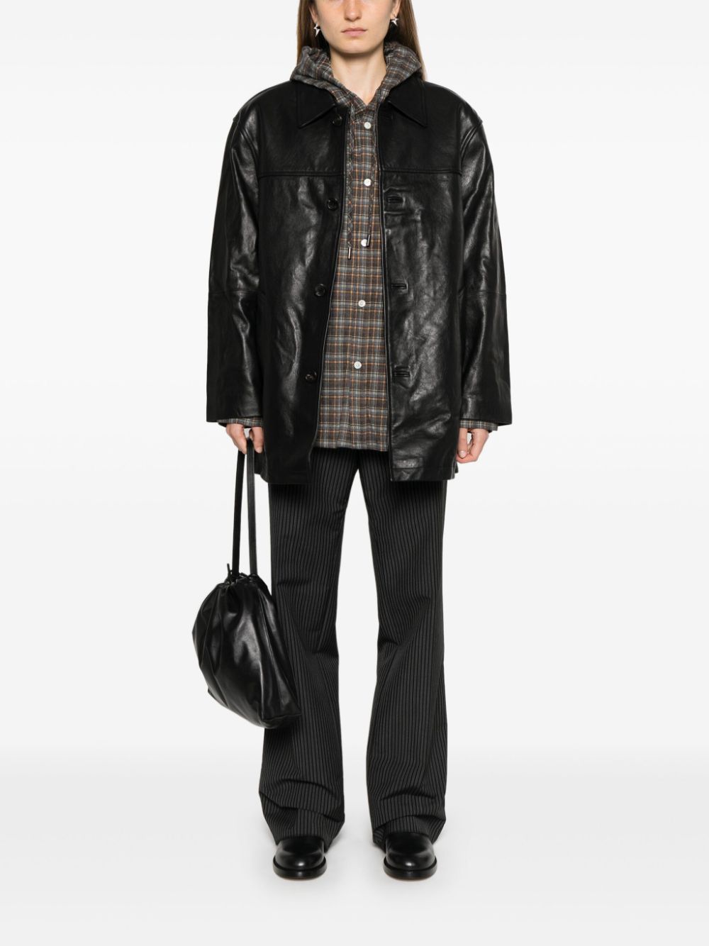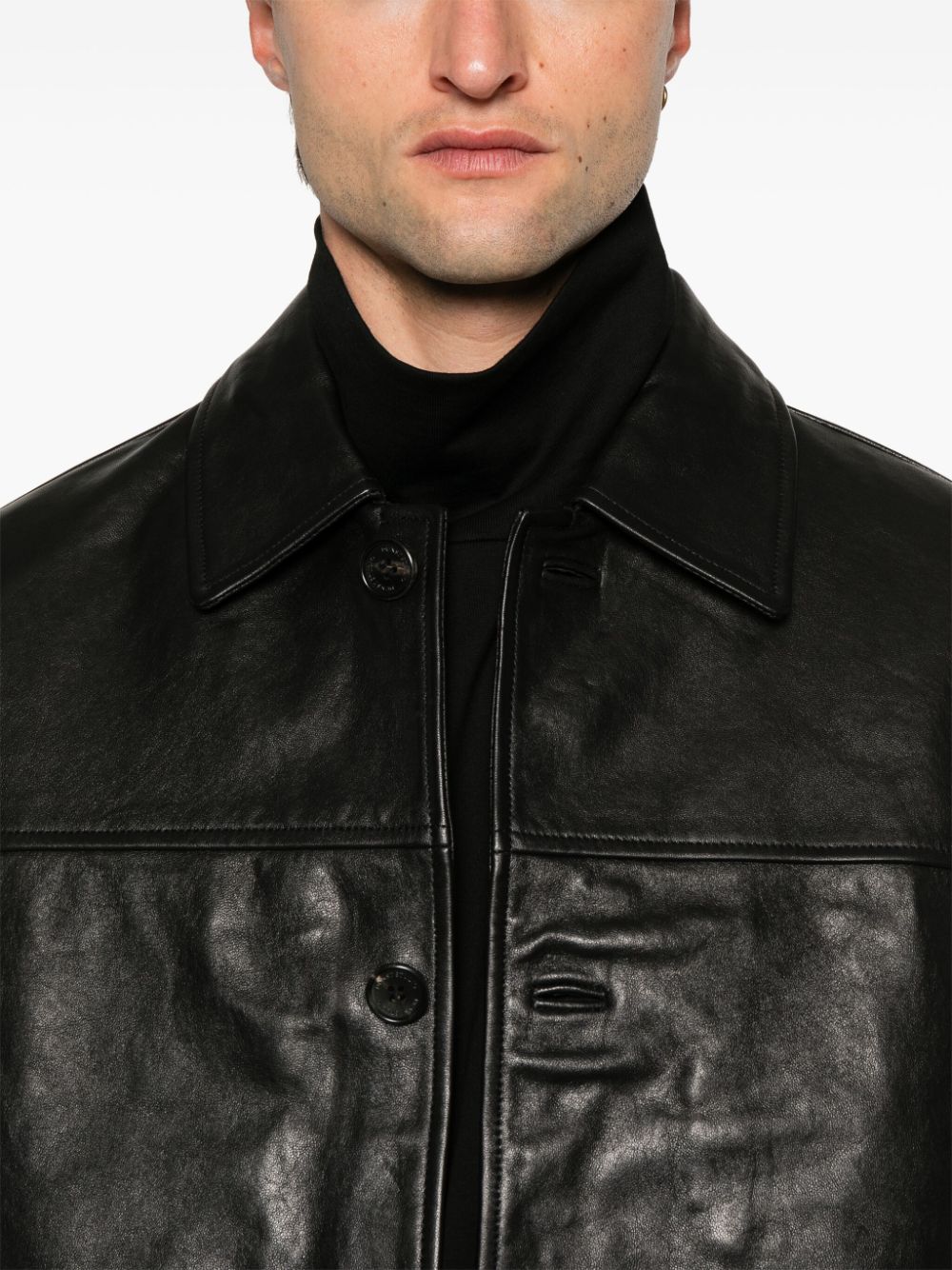 black leather front button fastening classic collar long sleeves two front welt pockets internal jetted pocket full lining straight hem When buying this unisex item, keep in mind that it is graded in standard men's sizing.