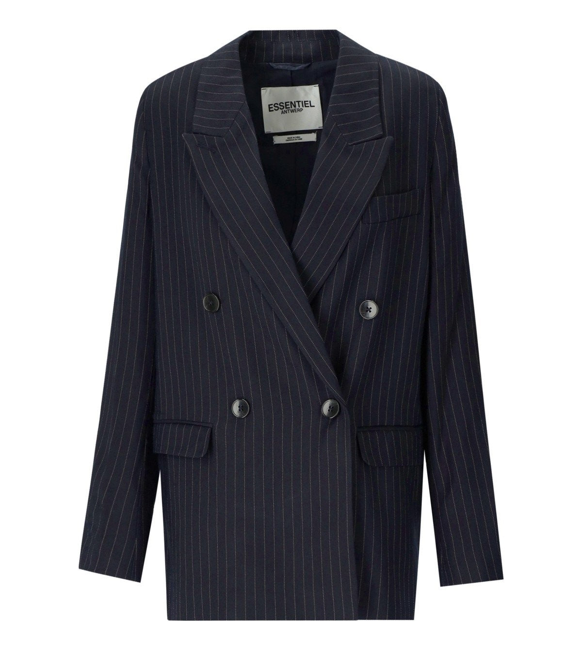 Doppelbrustnadelstreifen-Blazer von Essentiel Antwerpen aus schwerem schwarzem Nadelstreifen-Polyester-Stoff. Elegantes Modell, das durch eine gerade Linie mit weichen Schultern gekennzeichnet ist. Knopfverschluss, zentrale Brusttasche und zwei Klappentaschen. Innen in Viskose ausgekleidet. Entspannte Passform. Externe Zusammensetzung: 62% Polyester, 36% Viskose, 2% Polyurethan. Externe Zusammensetzung: 52% Polyester, 48% Viskose.