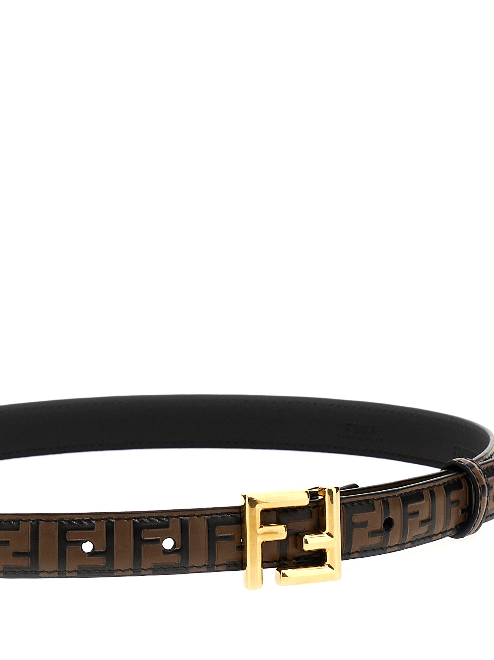 Leather belt with all-over 'FF' logo print, metal buckle logo.