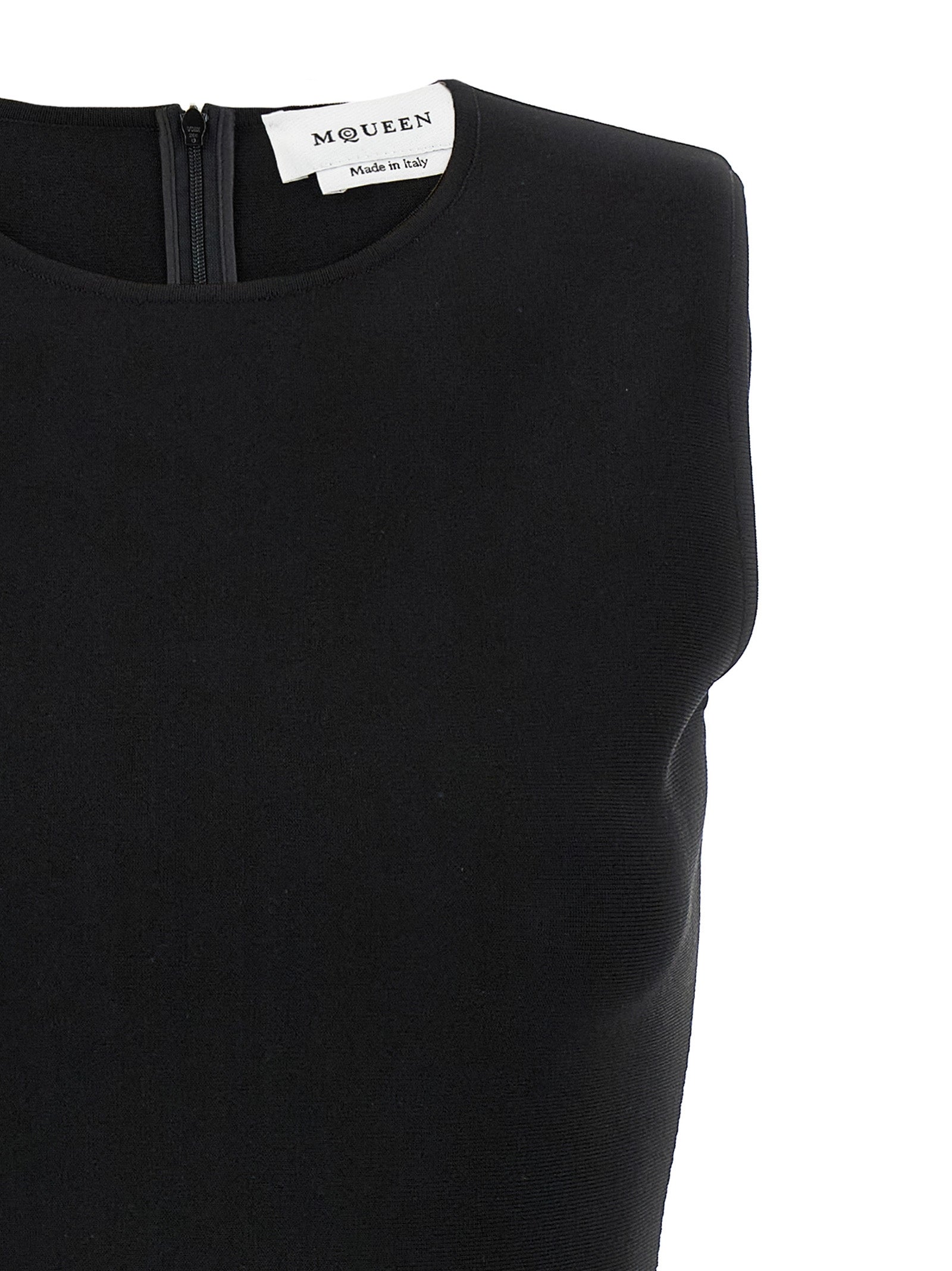 Ärmelloses Minikleid in Stretch Viskose -Strick mit Reißverschluss, abgerundeter Rock, Spinnennetzspitze und Seiden -Creponne am Saum.