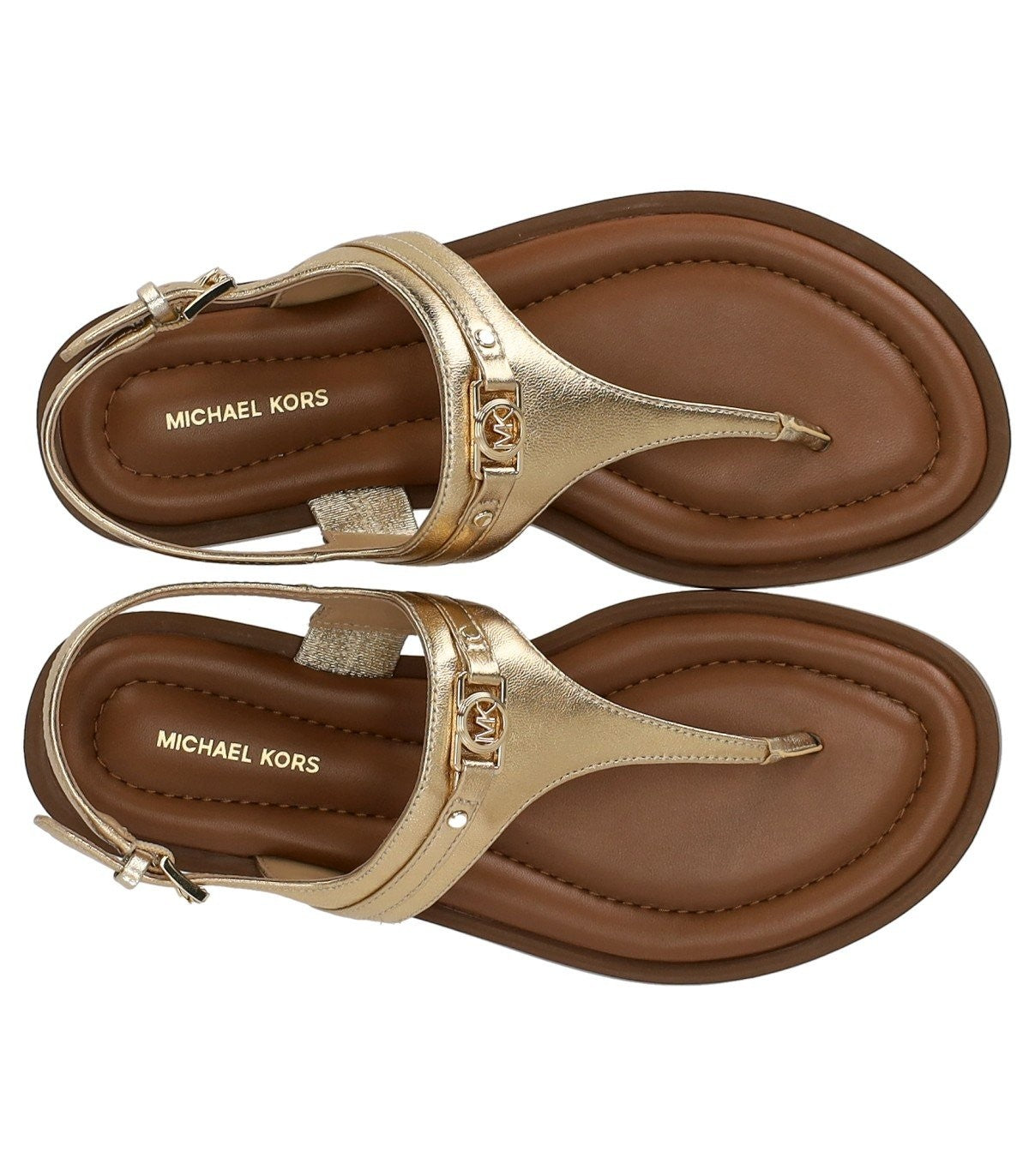 Mandy Thong Sandale von Michael Kors. Es besteht aus glattem goldenem Leder mit einer T-Straße und ist mit einem goldenen MK-Logo-Detail verschönert. Einstellbare Schnalle -Schließung. Gummi -Sohle, Höhe 1,5 cm.