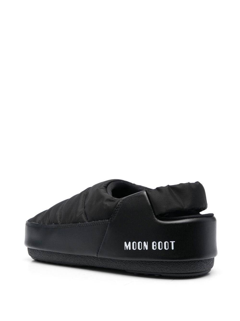 Evolution sterbte Slingback-Sandalen vom Moon Boot mit schwarzer, Markenabsatzkollegen, gestepptem Finish, tonaler Nähte, Wasserablagerung, Slingback-Gurt, Markenfußbett, runden Zeh, flacher Gummi-Sohle und Slip-on-Stil.
