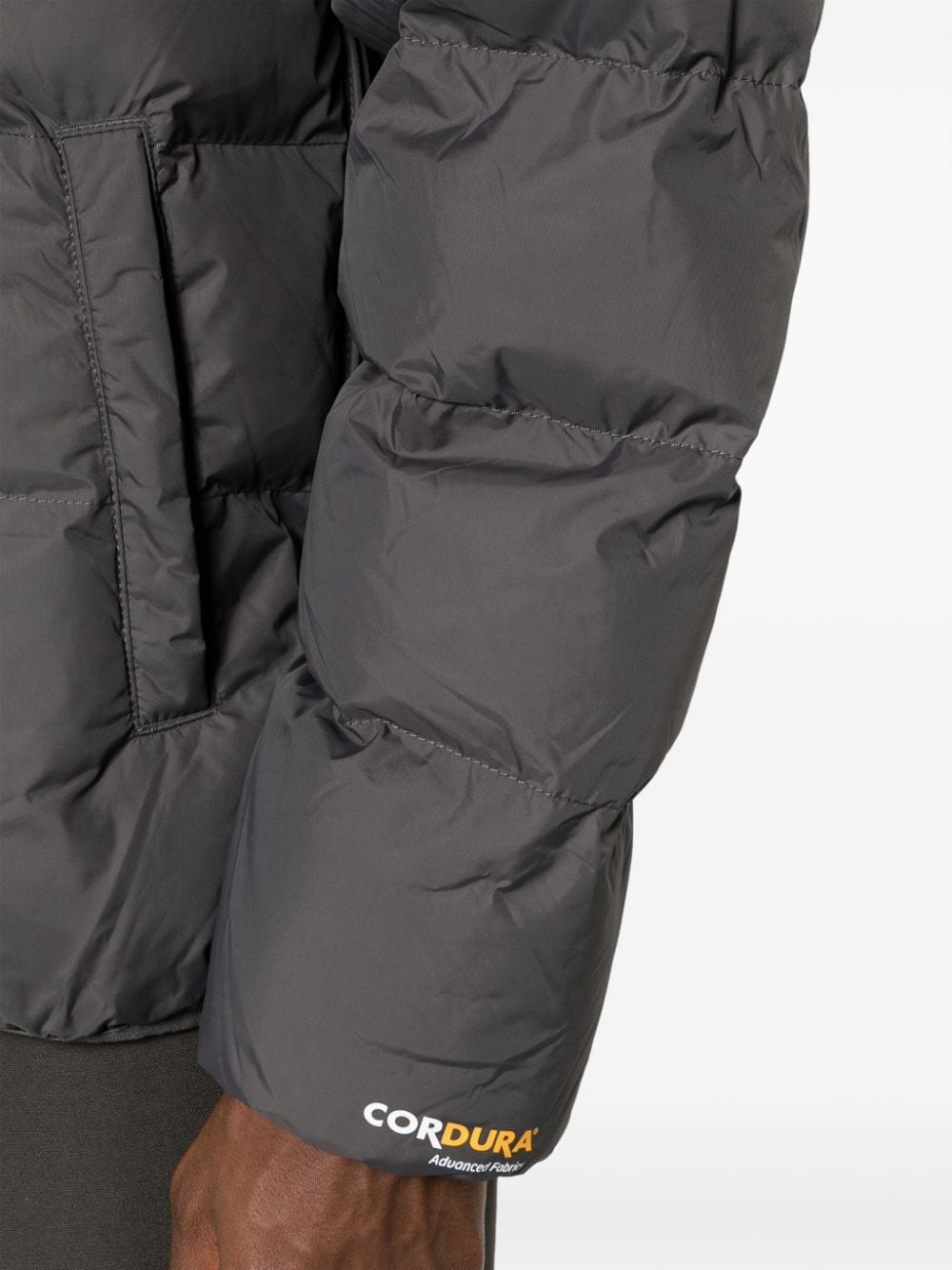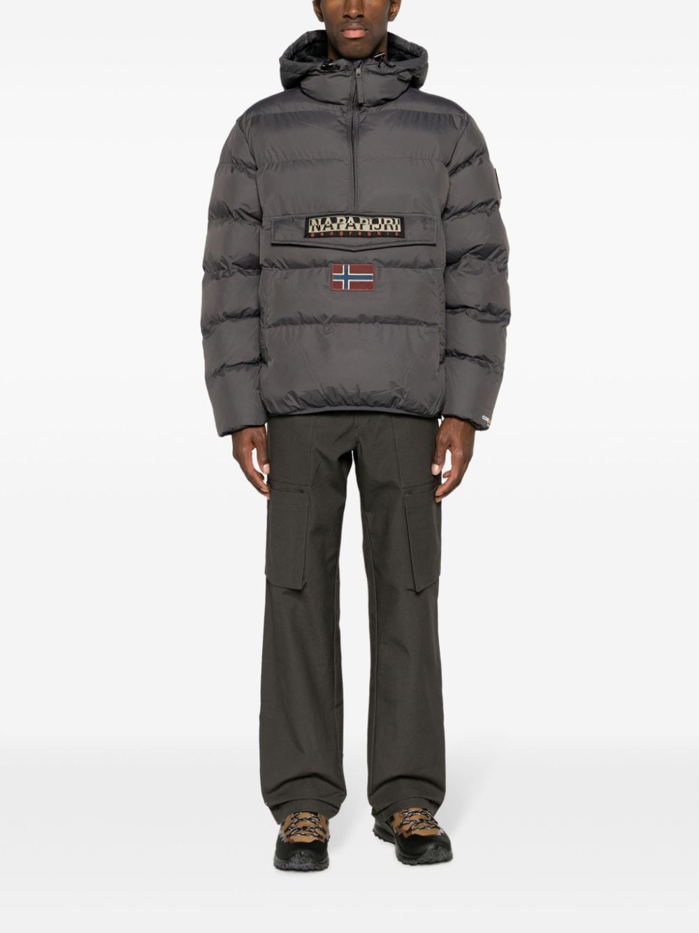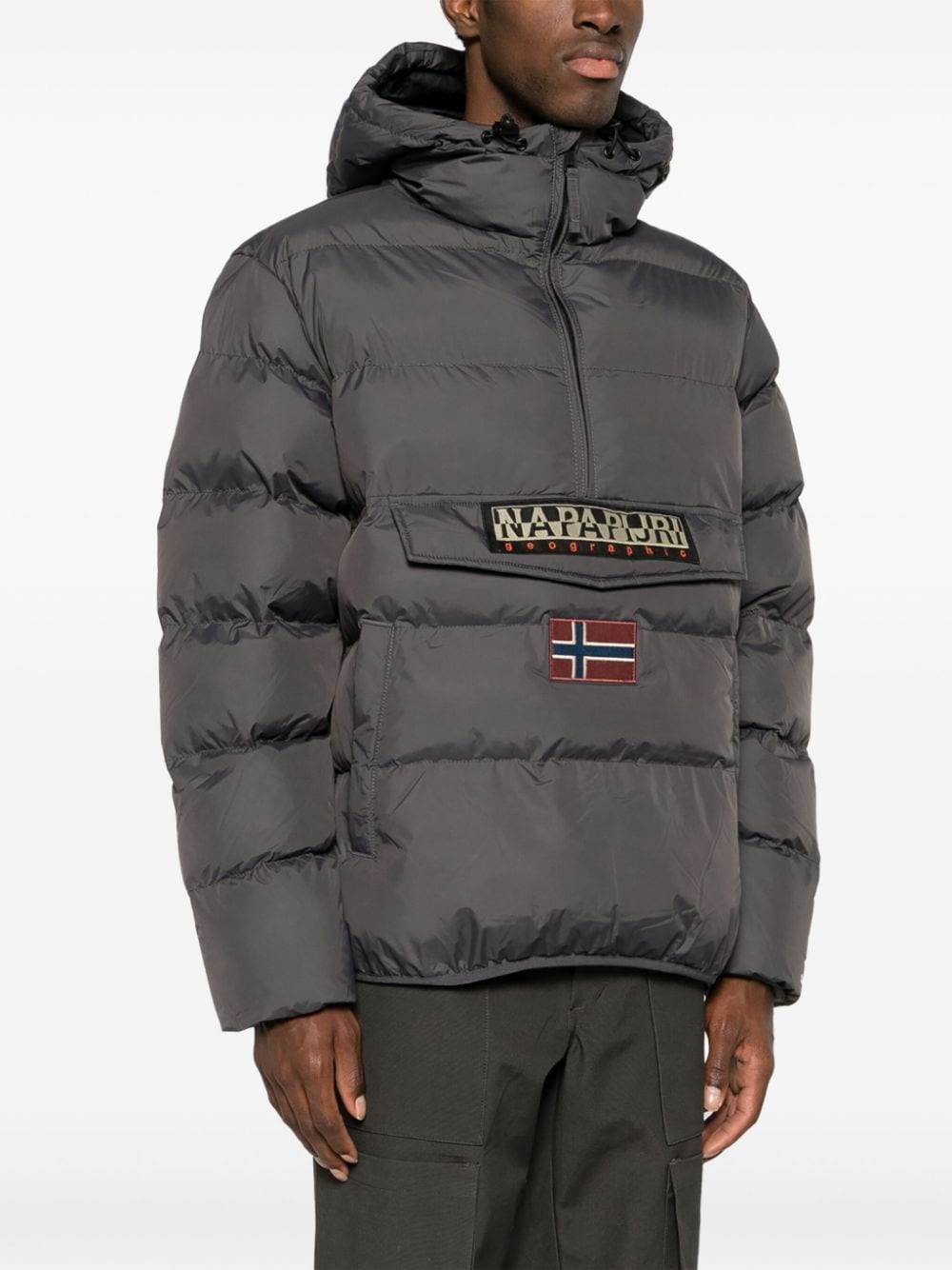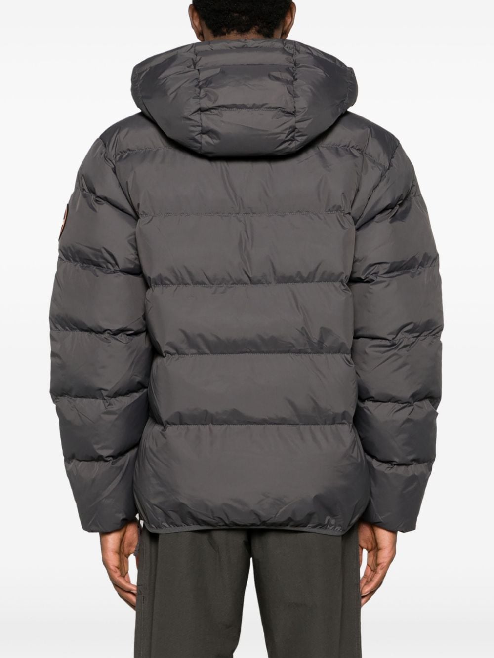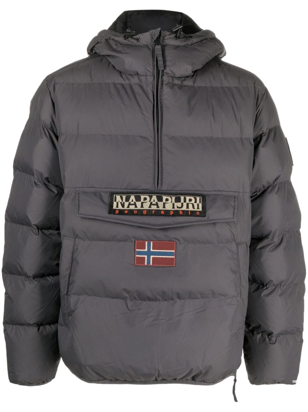 Gepolsterte Kapuzenjacke von Napapijri mit dunkelgrauem, gepolstertem Design, Logo -Patch vorne, klassischer Kapuze, lange Ärmel, Tasche vorne, zwei Seitenschlitztaschen und gerade Saum.