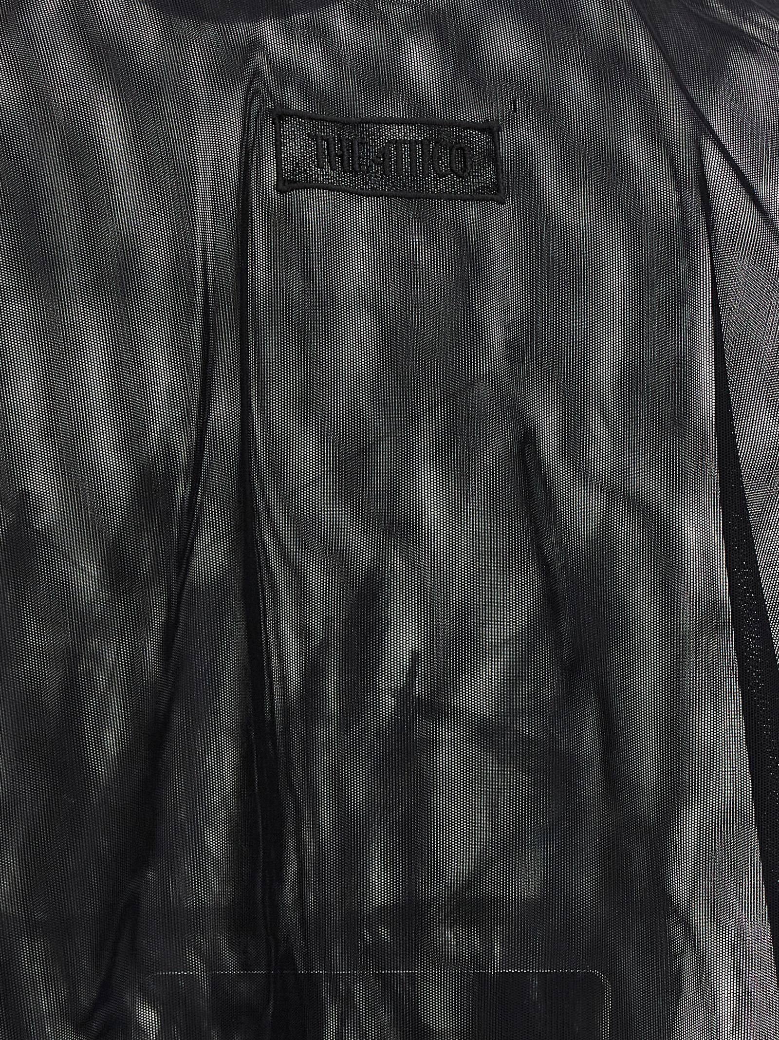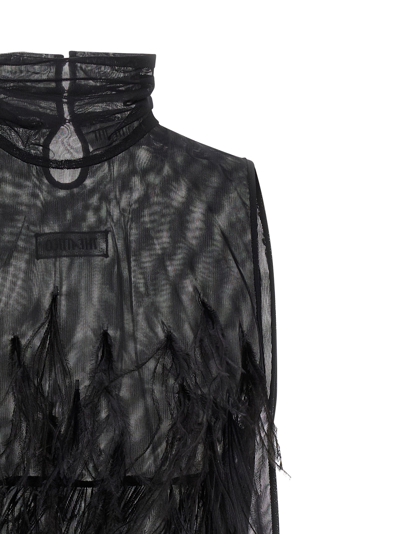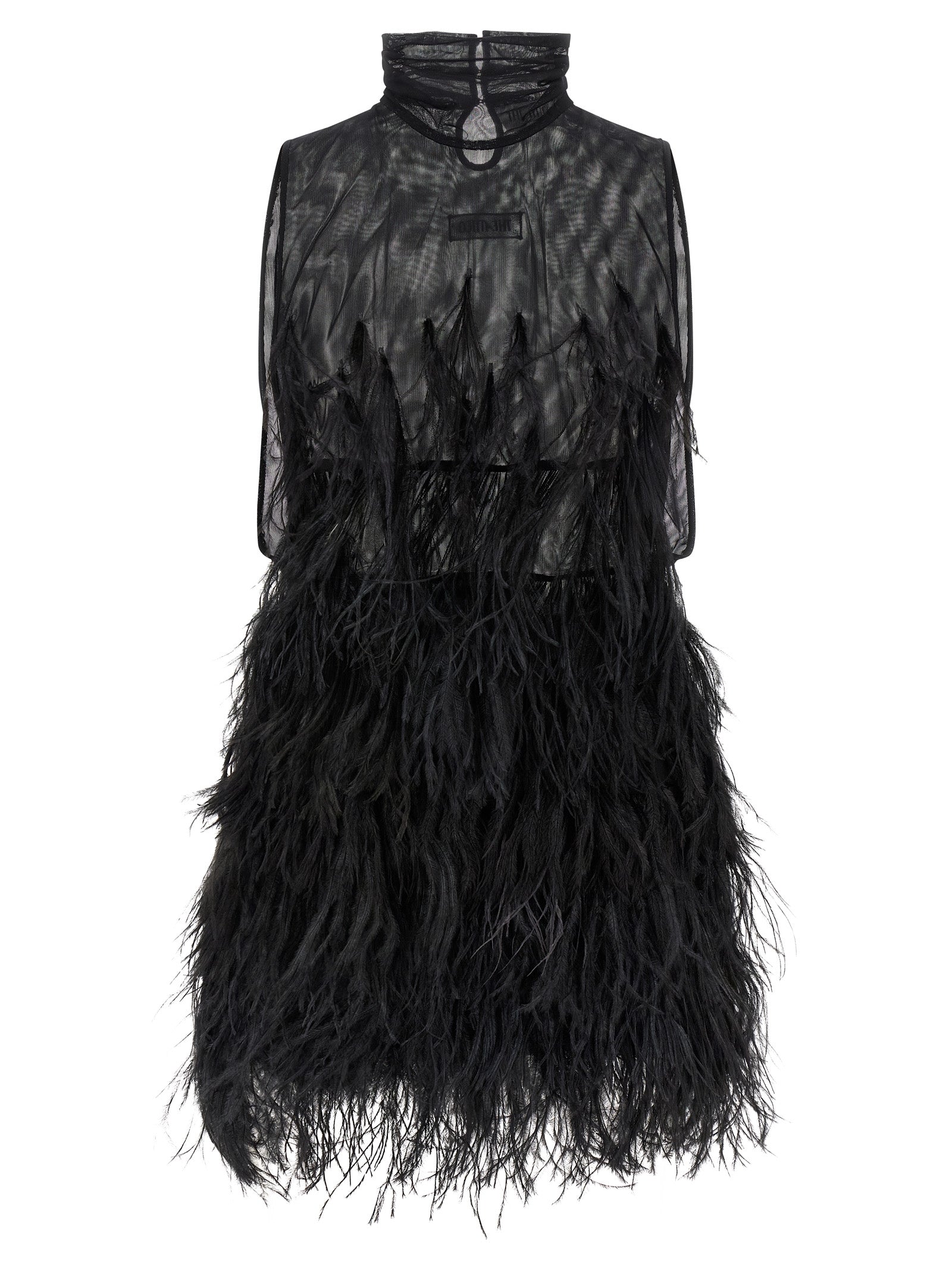 Mini-Kleid in halbtransparenter Tüll mit Straußfederanwendung, hoher Hals, ärmelloses, Unterrock, Seitenschließungsverschluss, Rücken-Logo-Patch.