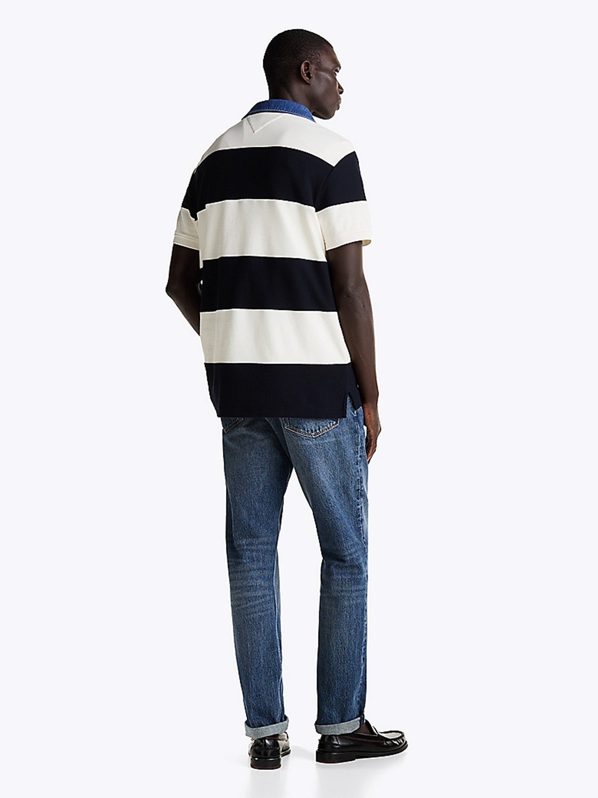 Entspannter Fit Polo -Hemd in reinem Baumwollpiqué mit Rugby -Streifen. Der kontrastierende Denim Polo-Kragen und Drei-Knopf-Verschluss verleihen eine lässige und unverwechselbare Note. Die Flagge von Tommy Hilfiger stickte auf der Brust für ein ikonisches Detail. Perfekt für einen sportlichen und modischen Look.
